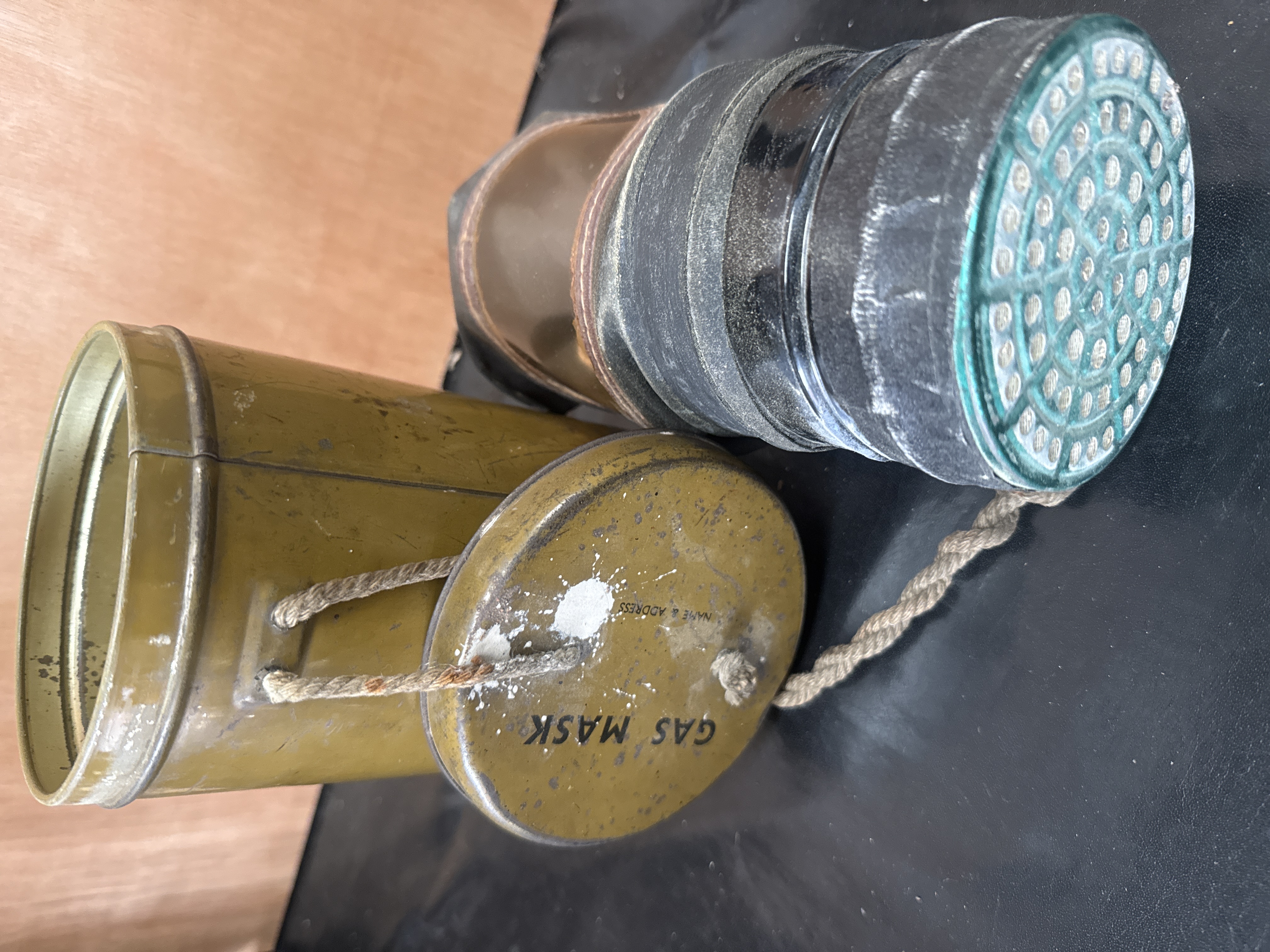 A WW2 British civilian gas mask and associated cylindrical metal storage canister. The canister is finished in olive drab paint and features a lid attached by a coarse rope cord. The lid is printed with black text reading GAS MASK and NAME & ADDRESS. The mask is constructed from dark rubber or a flexible synthetic material, fitted with a large cylindrical filter that has a green-colored mesh face. This type of respirator was standard issue for civilians in the United Kingdom during World War II.