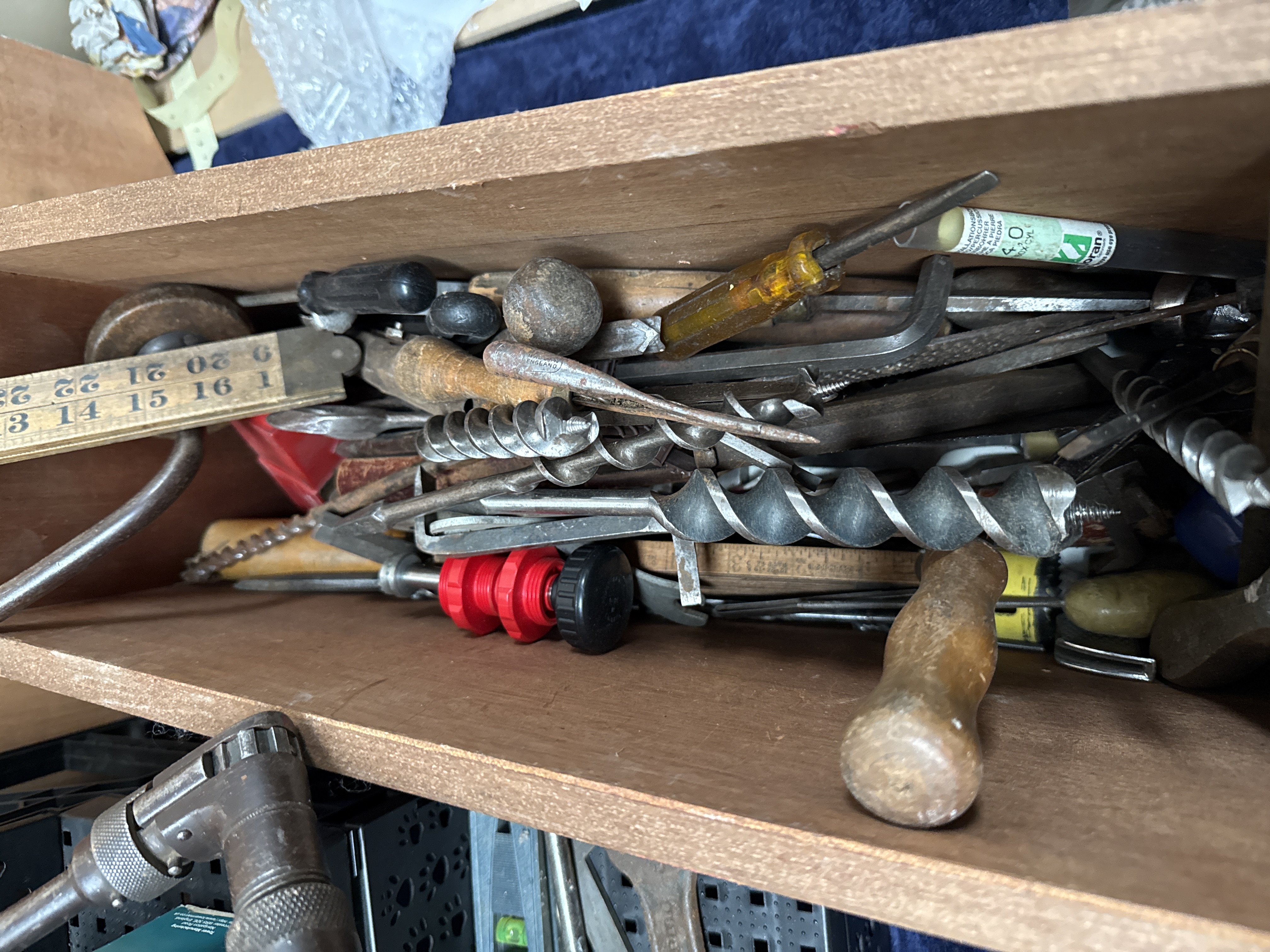 An assortment of various hand tools and hardware components. The collection includes a hand brace, several auger drill bits, a wooden folding rule, a circular metal measuring tape, a spirit level, a large open-ended wrench, and a mitre box. The lot also contains multiple boxes of hardware from brands including Tower, Wickes, and Challenge, alongside a small metal tin containing assorted nuts and bolts. The items are constructed from wood, steel, and plastic. One metal tool is stamped with the mark ENGLAND.