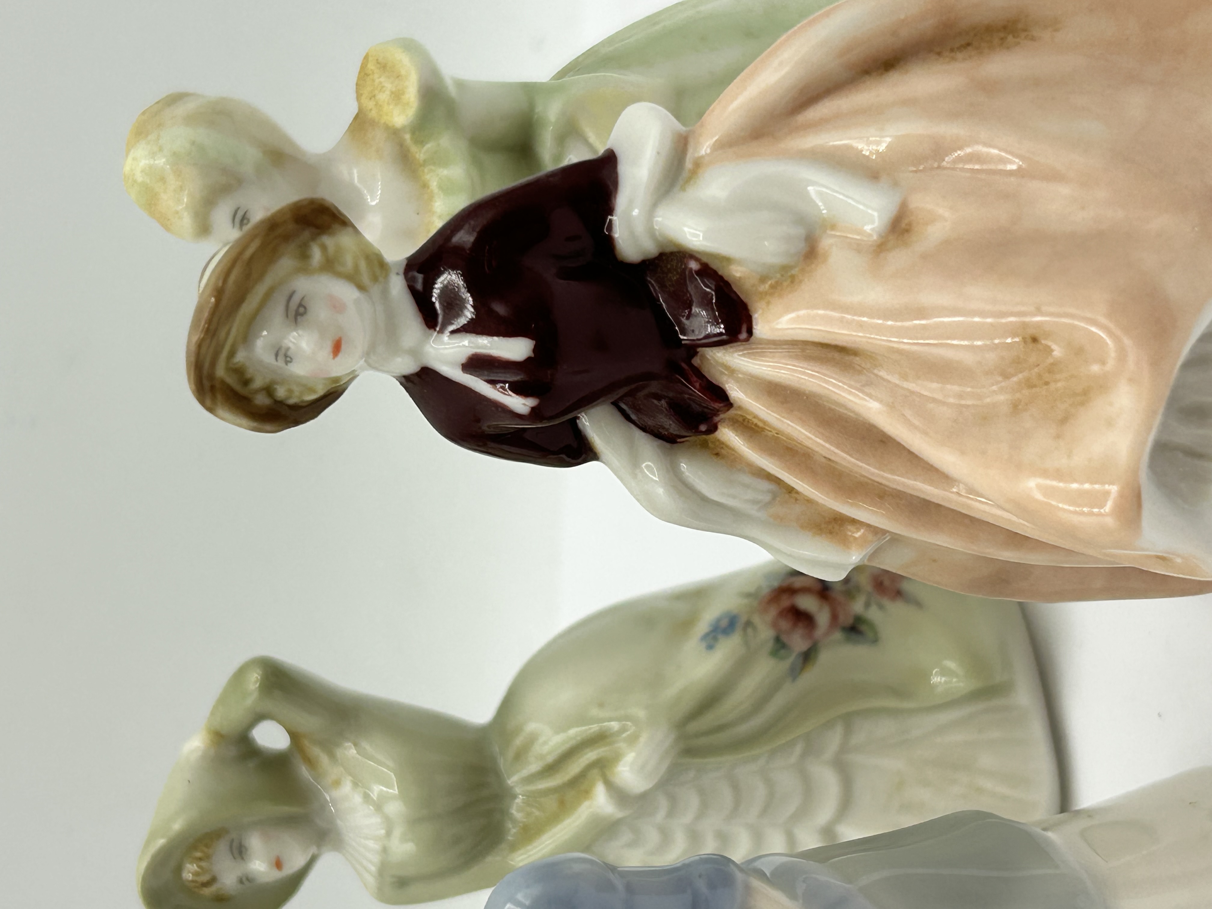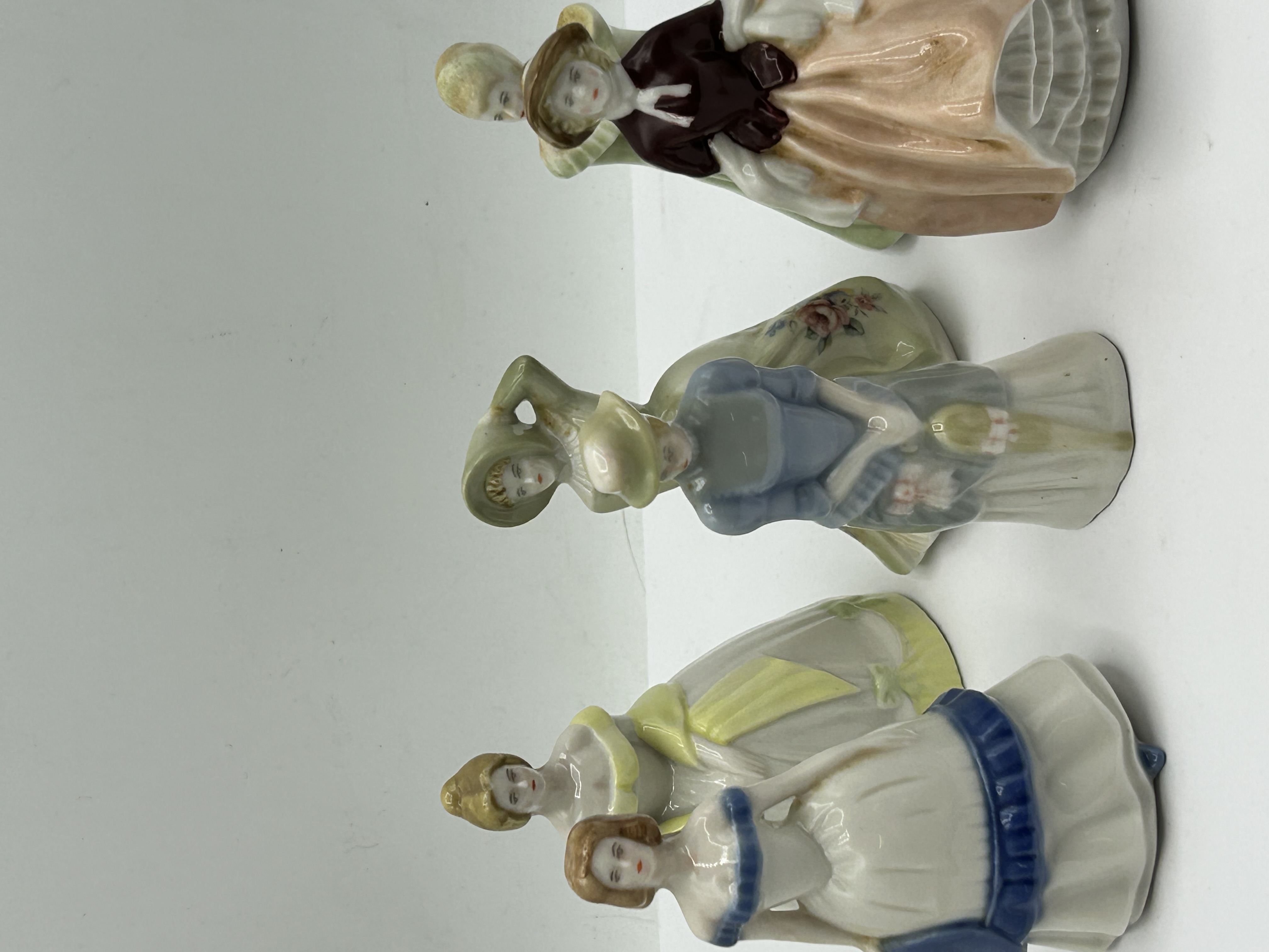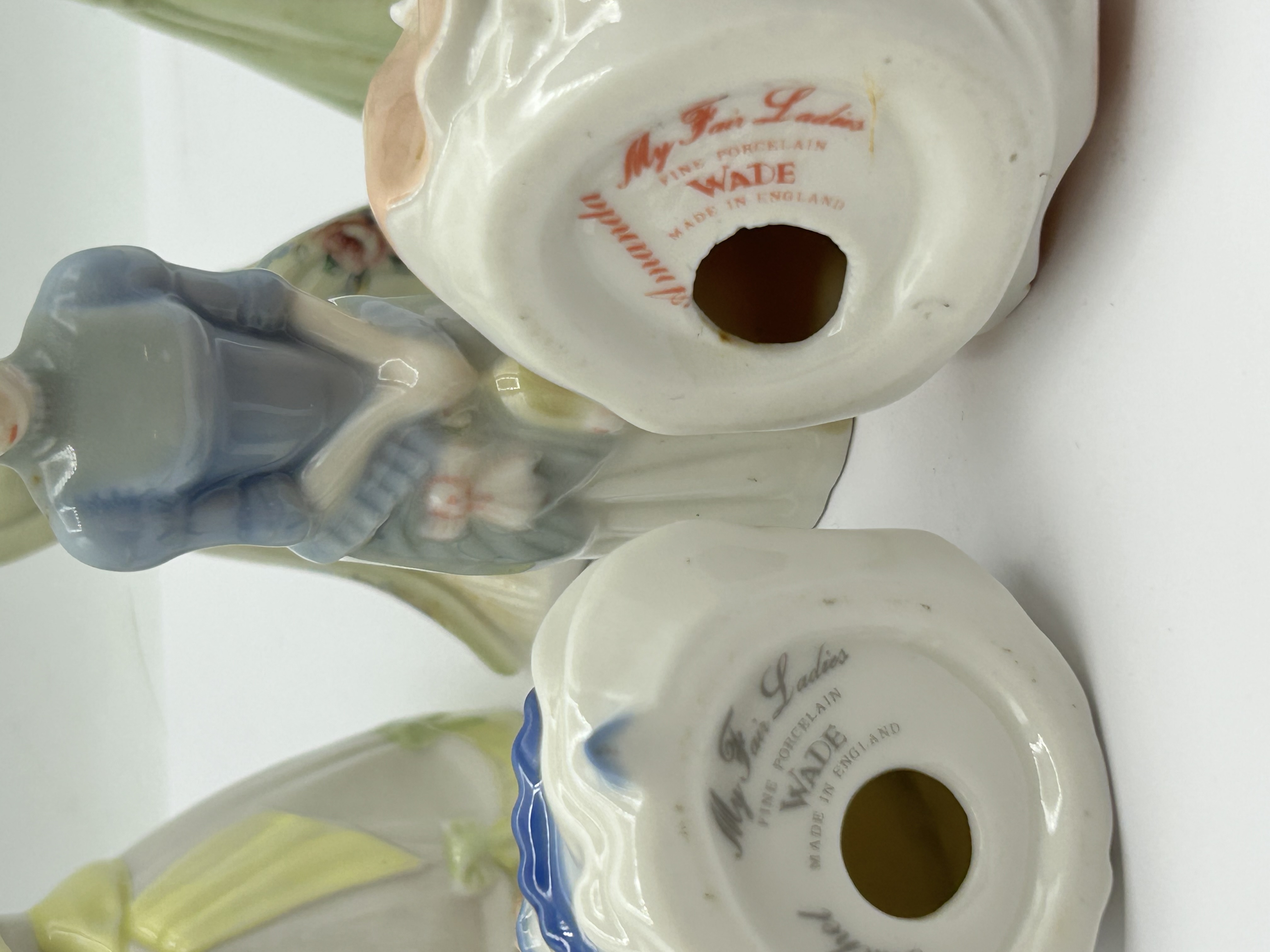 A collection of glazed porcelain figurines from the My Fair Ladies series by Wade, England. The figures are modelled in various historical-style gowns and hats, finished in a palette of polychrome pastel colours with hand-painted facial features. The underside of the bases feature printed backstamps for Wade, England, the series title My Fair Ladies, and individual model names including Amanda and Rachel.