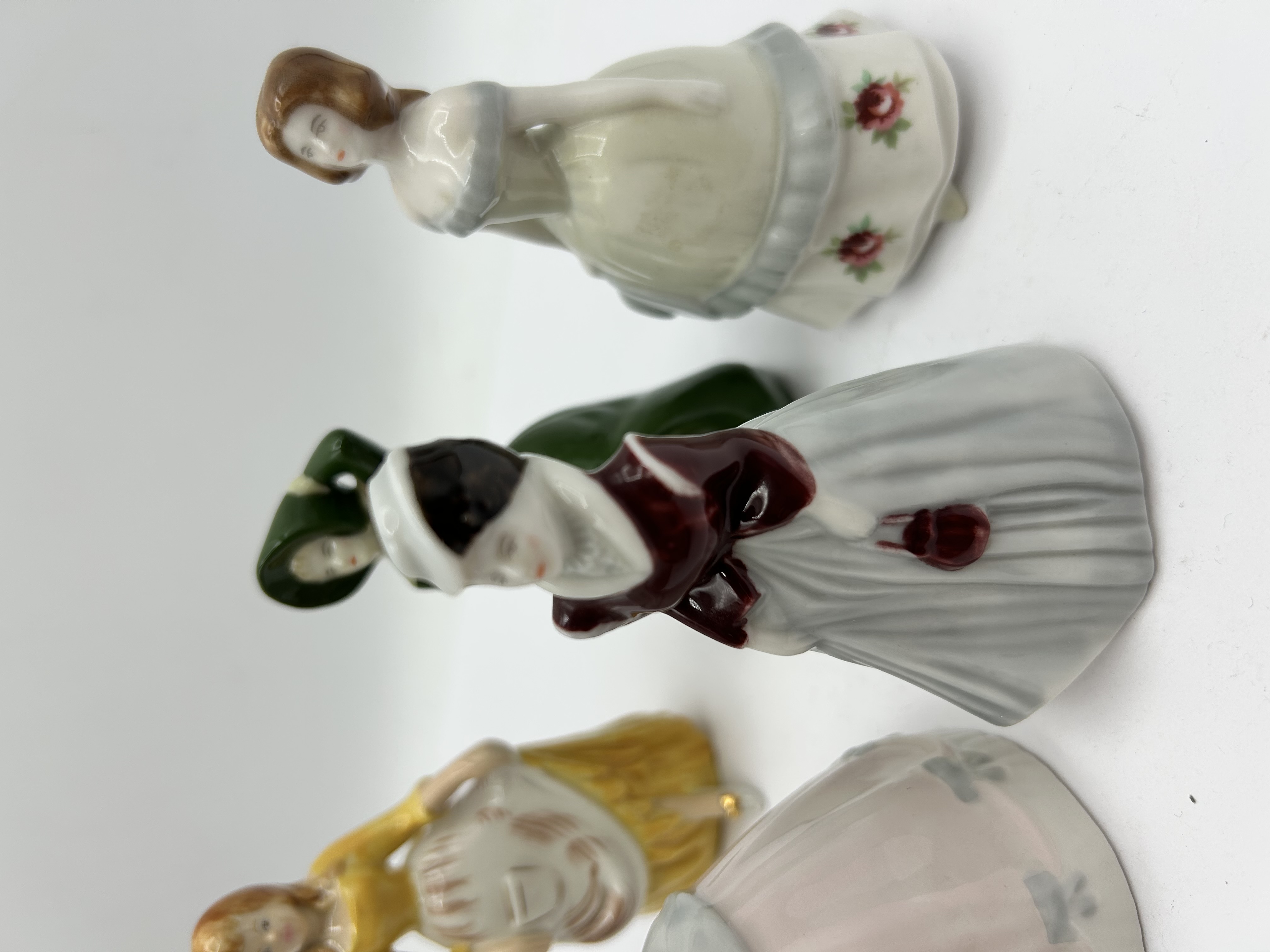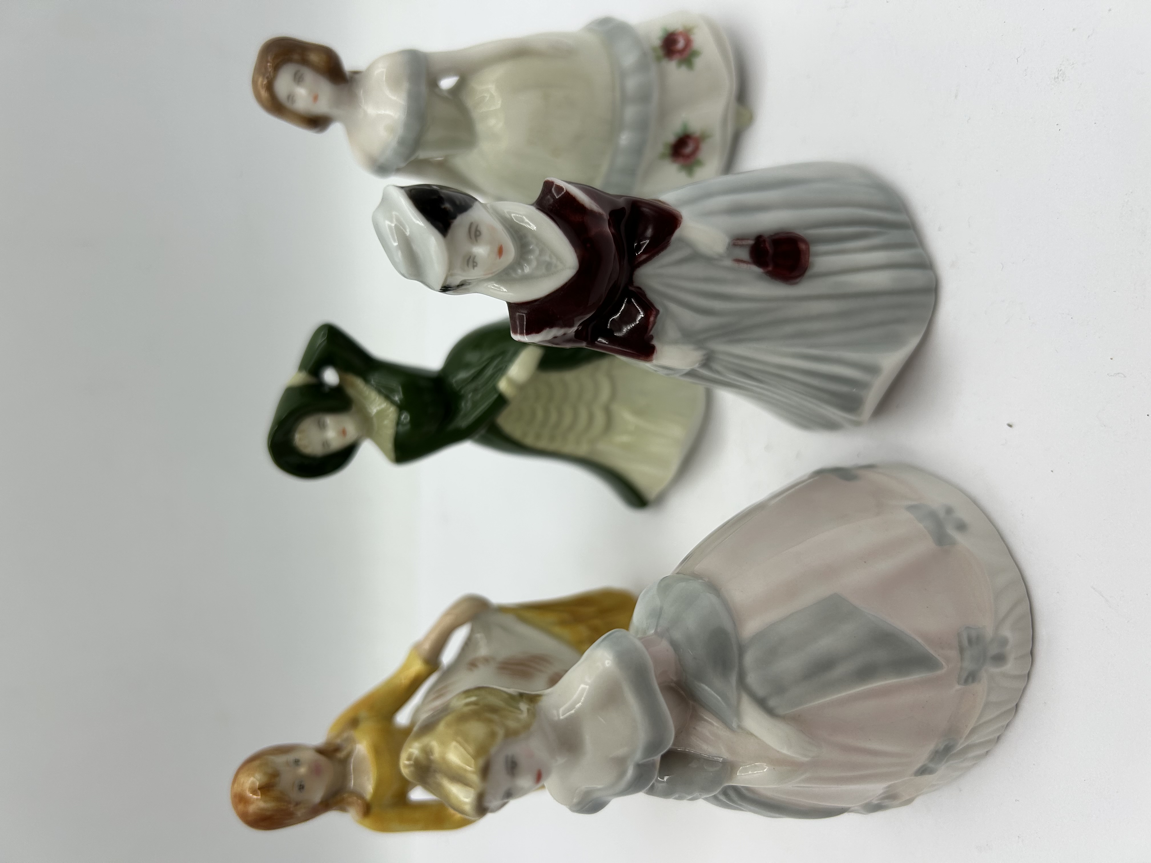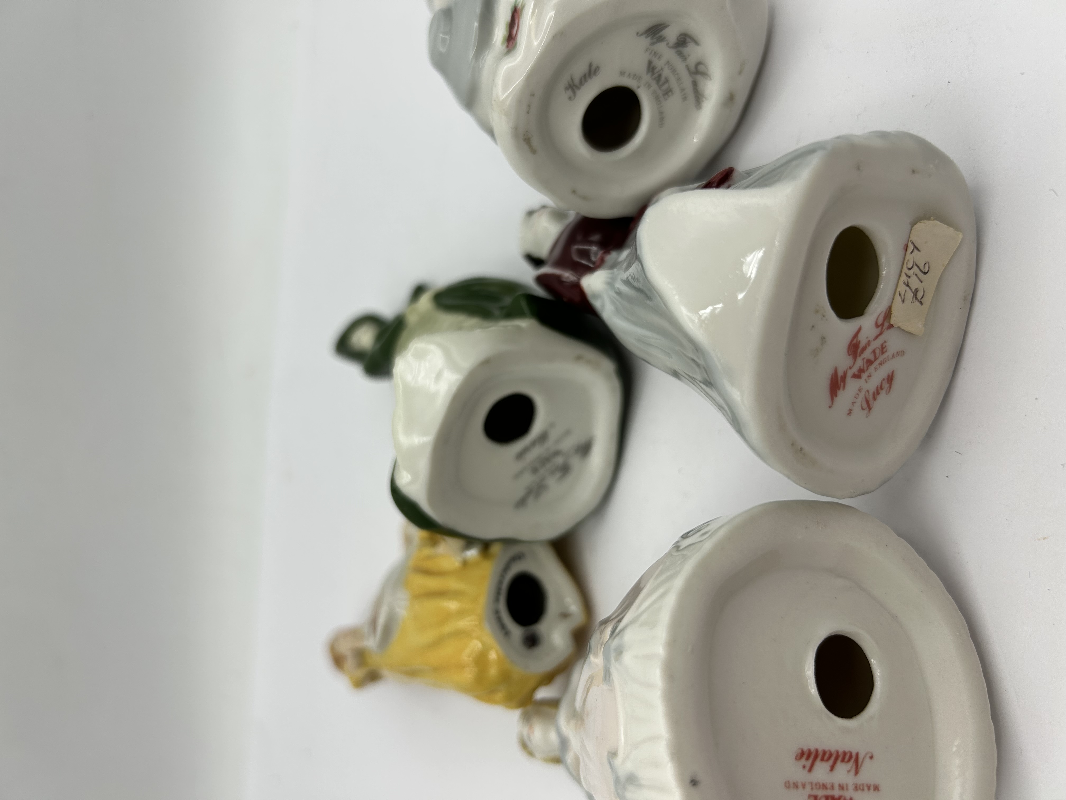A collection of small-scale polychrome porcelain figurines from the My Fair Ladies series, manufactured by Wade in England. The figures depict women in various styles of period dress, featuring a high-gloss glazed finish. The assortment includes figures in gowns of forest green, golden yellow, and white with rose accents. The undersides of the bases are marked with the series title My Fair Ladies, the Wade manufacturer’s mark, and Made in England. Individual character names identified on the bases include Kate, Lucy, and Natalie. The figurines are constructed from fine porcelain with hand-painted details. One figurine retains a small paper retail adhesive label on its base.