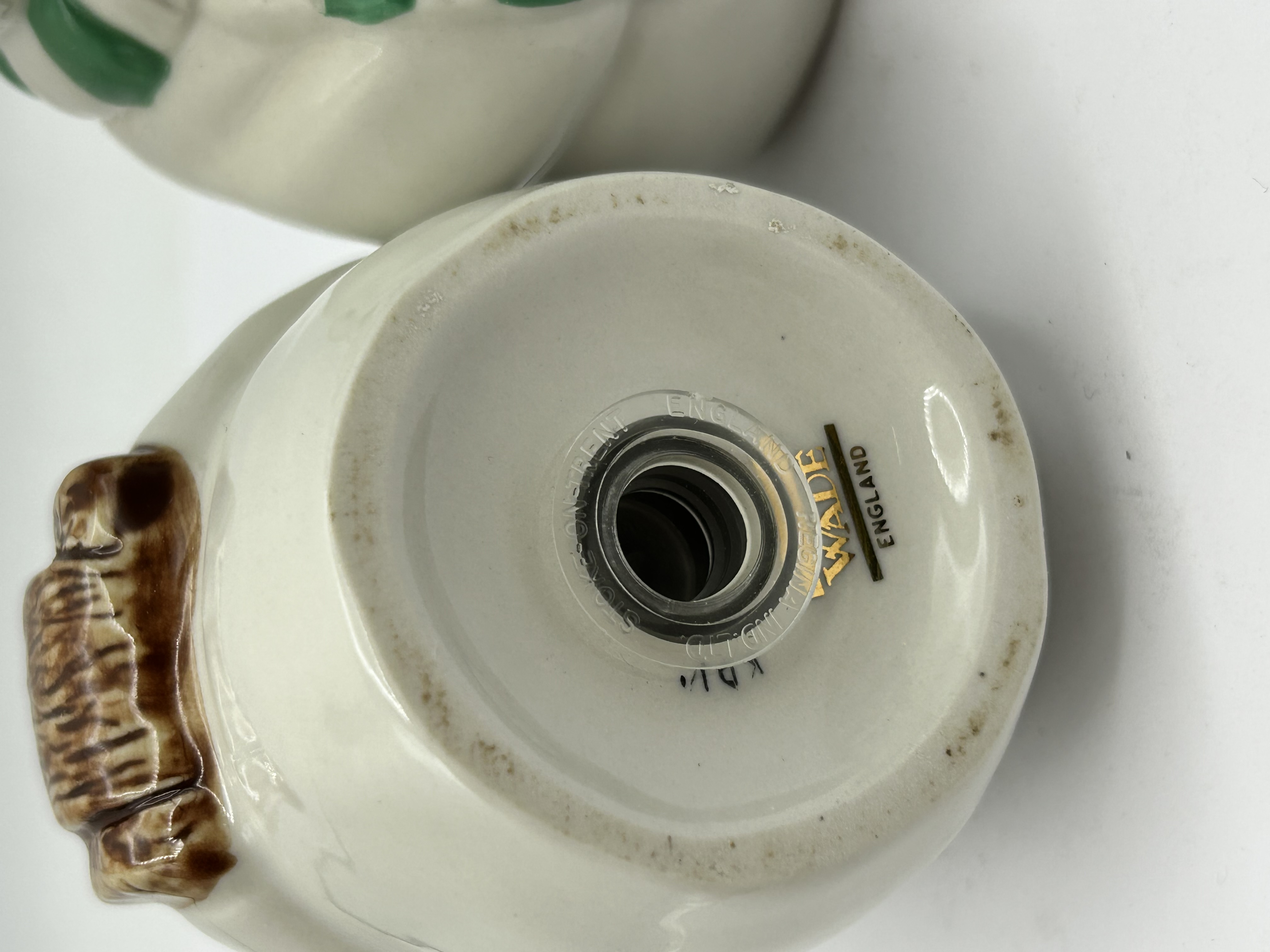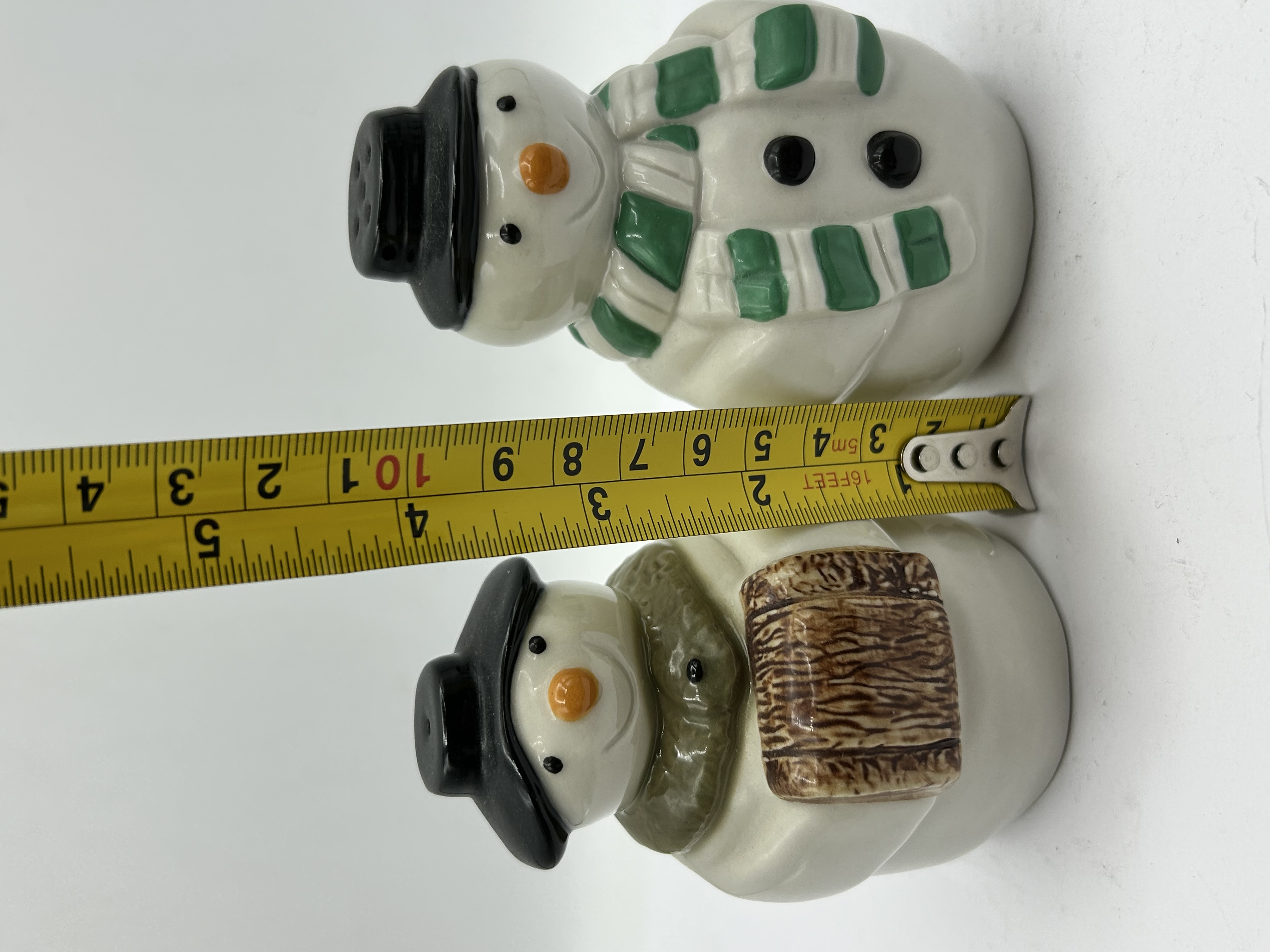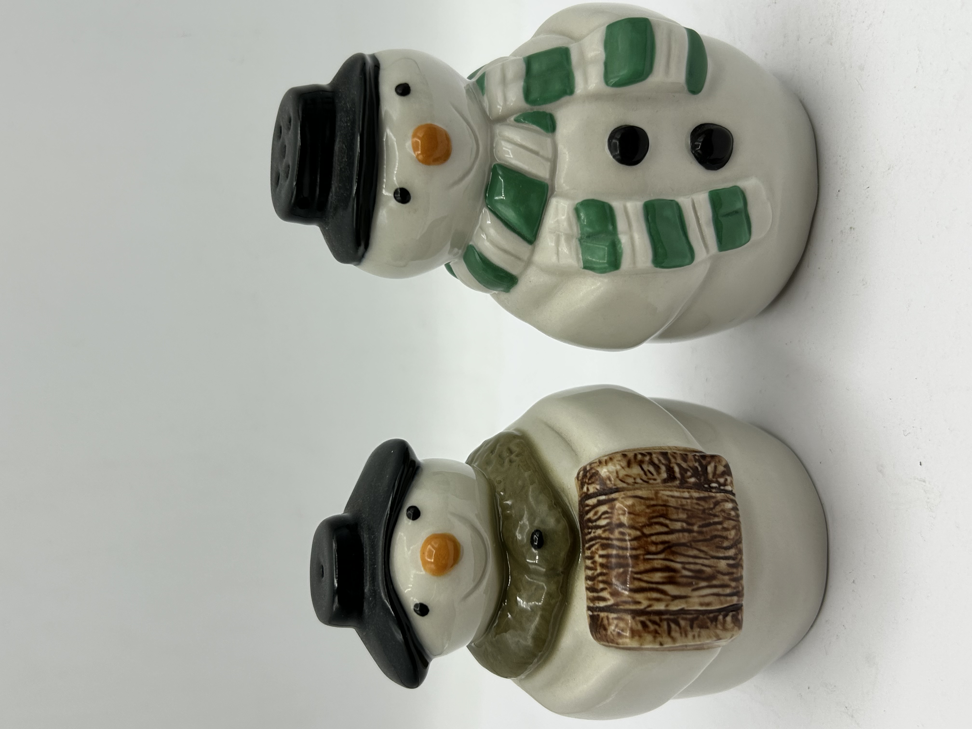 A pair of glazed ceramic salt and pepper shakers produced by Wade England. Each figure is modelled as a snowman wearing a black hat. One figure features a green and white striped scarf and two black buttons to the chest. The second figure features a textured olive-green scarf and is depicted holding a brown textured bundle or log. The bases are marked with a gold-tone WADE ENGLAND stamp. The clear plastic stoppers are embossed with STOKE-ON-TRENT ENGLAND and REGINA IND. LTD.