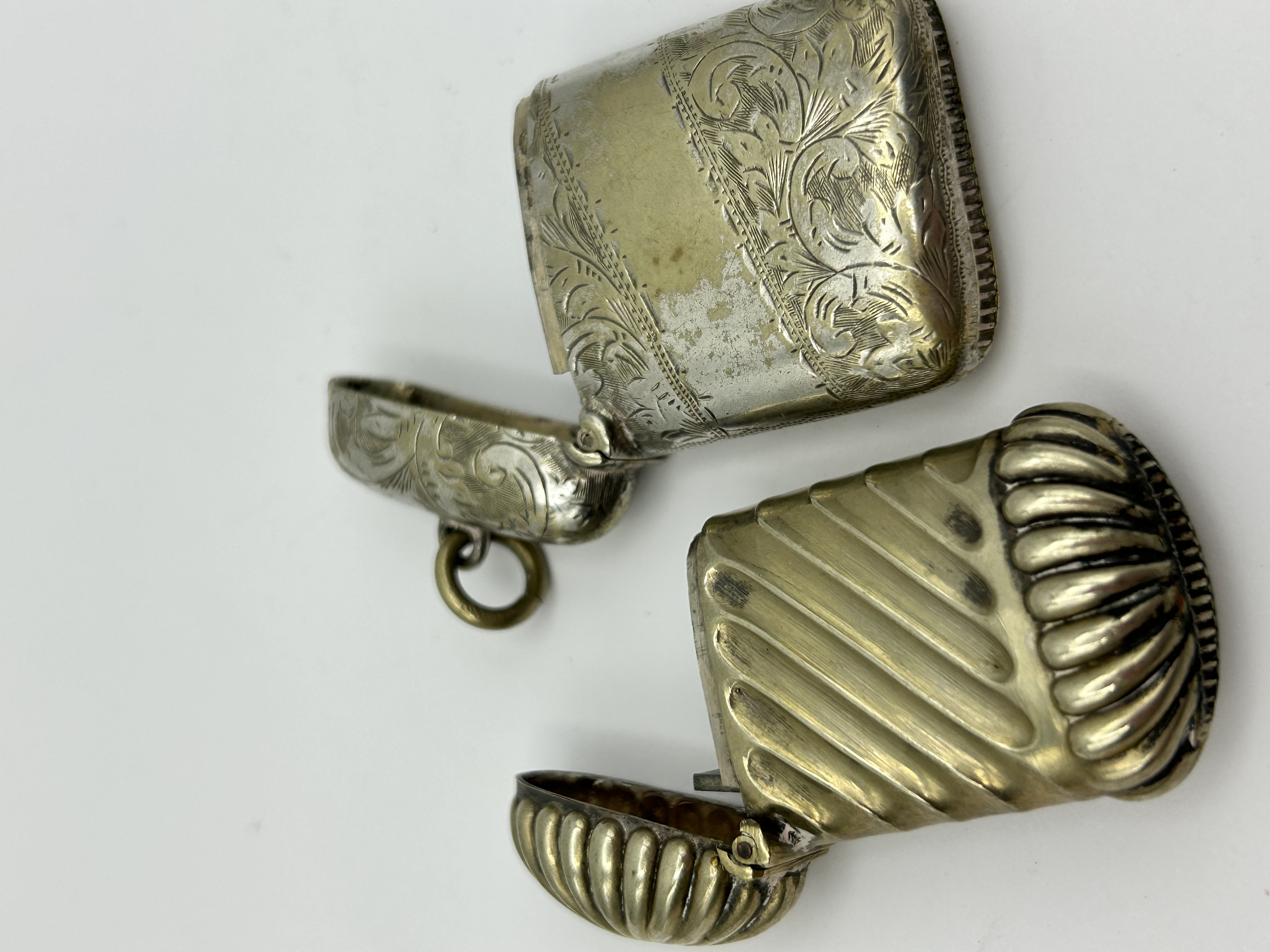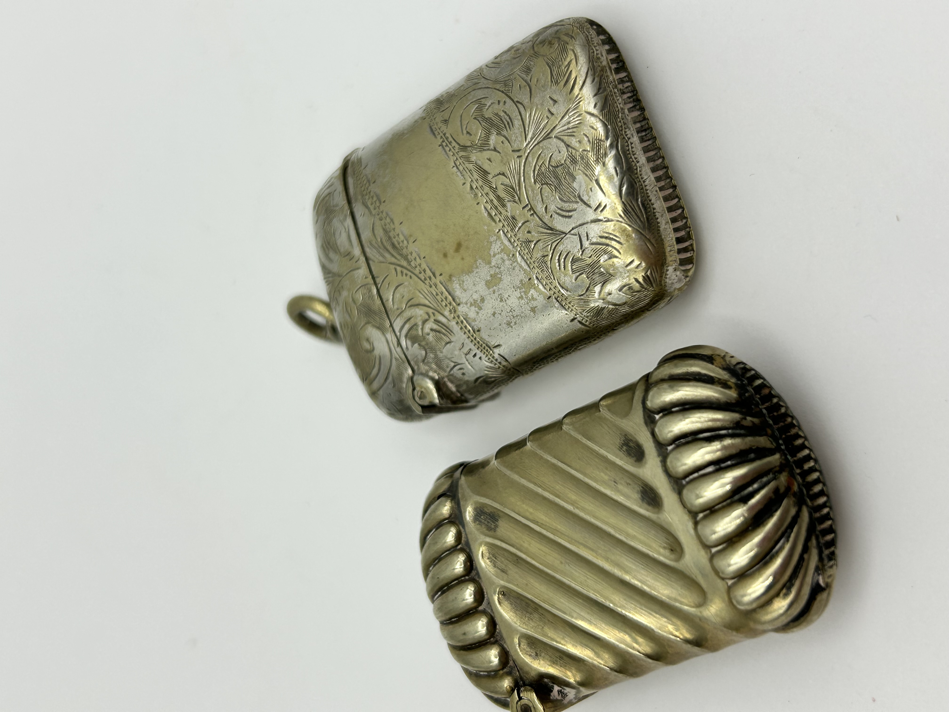 Two antique metal vesta cases. The first is a silver-toned example of rectangular form with rounded corners, decorated with engraved foliate and scrollwork motifs surrounding a central vacant rectangular cartouche. It is fitted with a side-mounted suspension ring and a hinged lid. The second case is finished in a gold-toned metal and exhibits a diagonal gadrooned pattern on the body with matching lobed detailing on the ends. Both cases are constructed with hinged lids and feature striking surfaces to the base. No hallmarks or maker’s marks are visible.