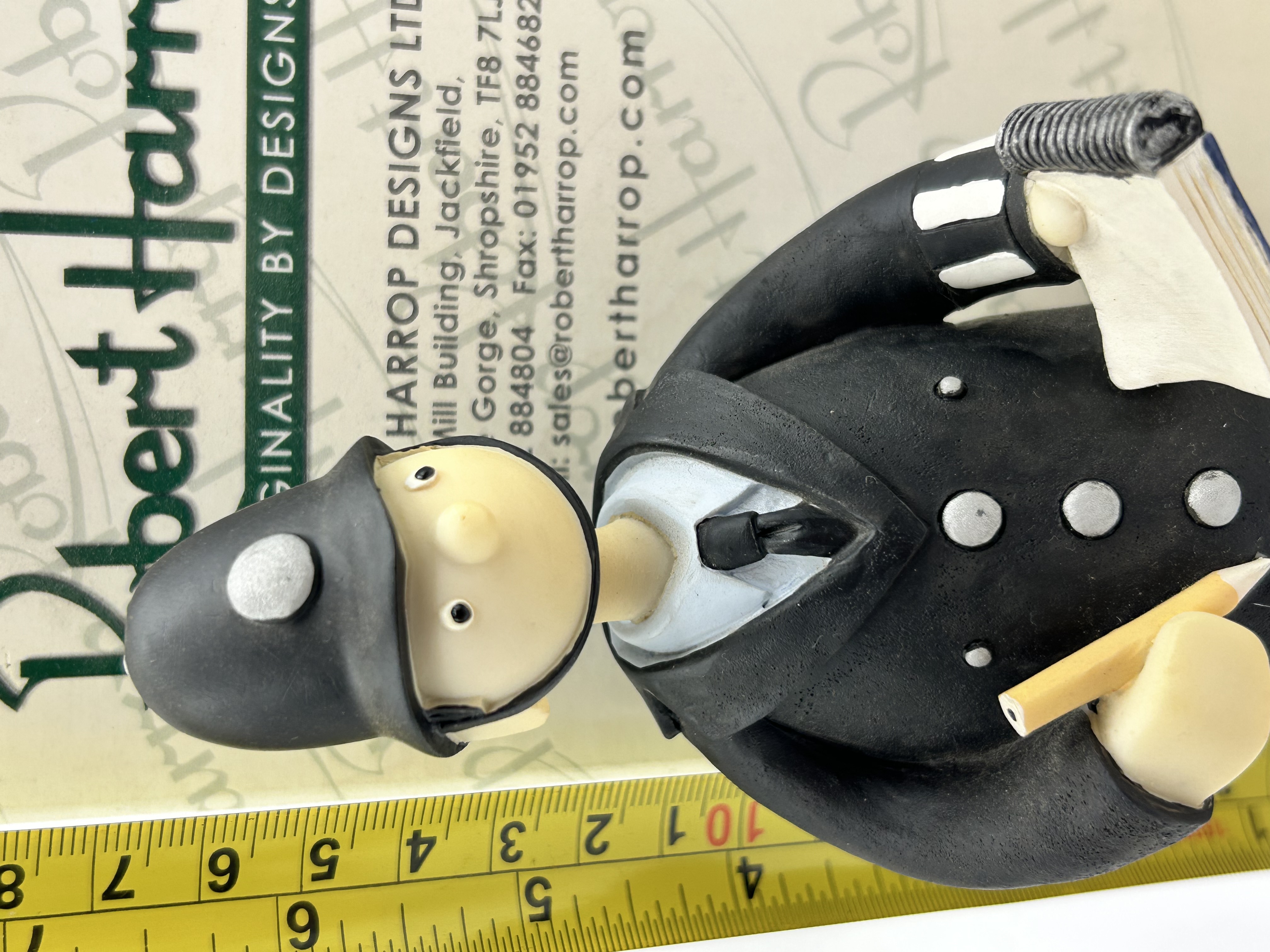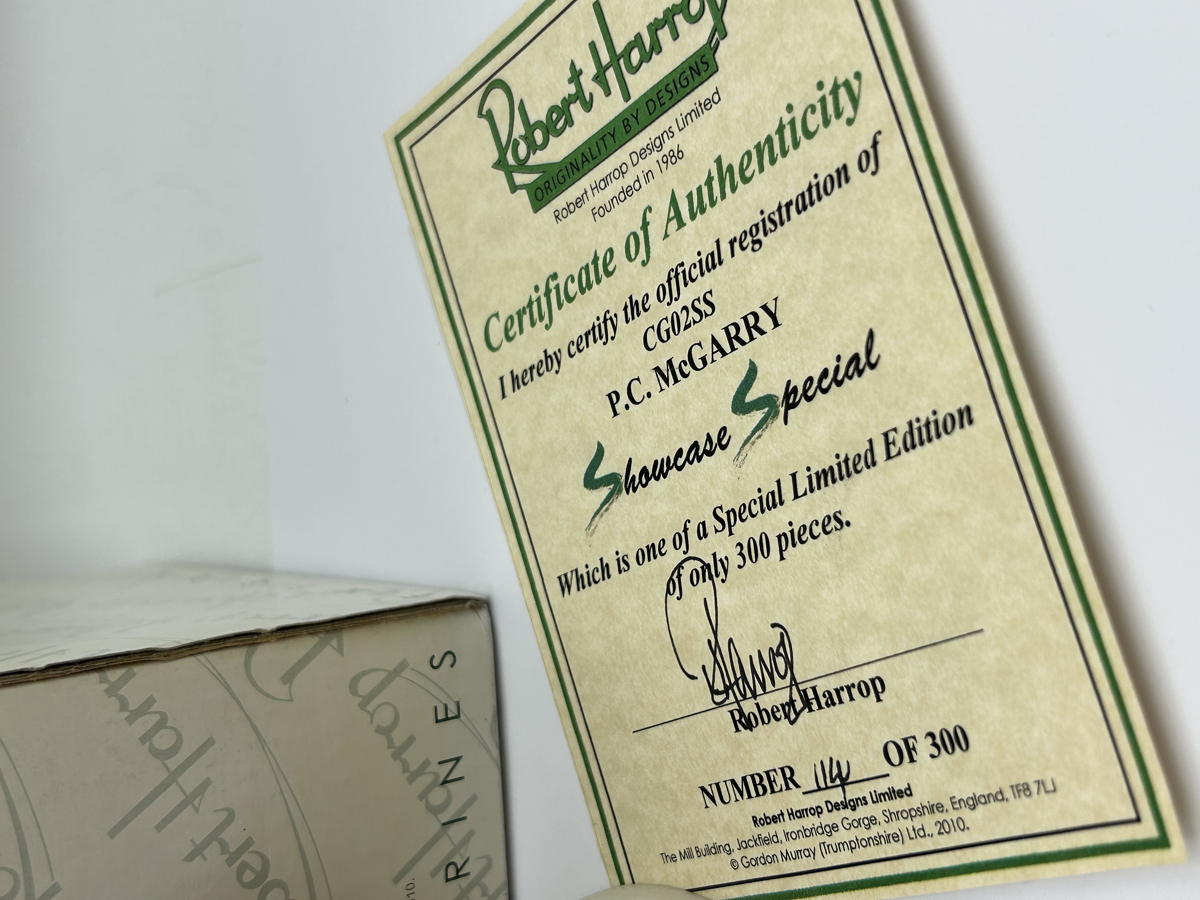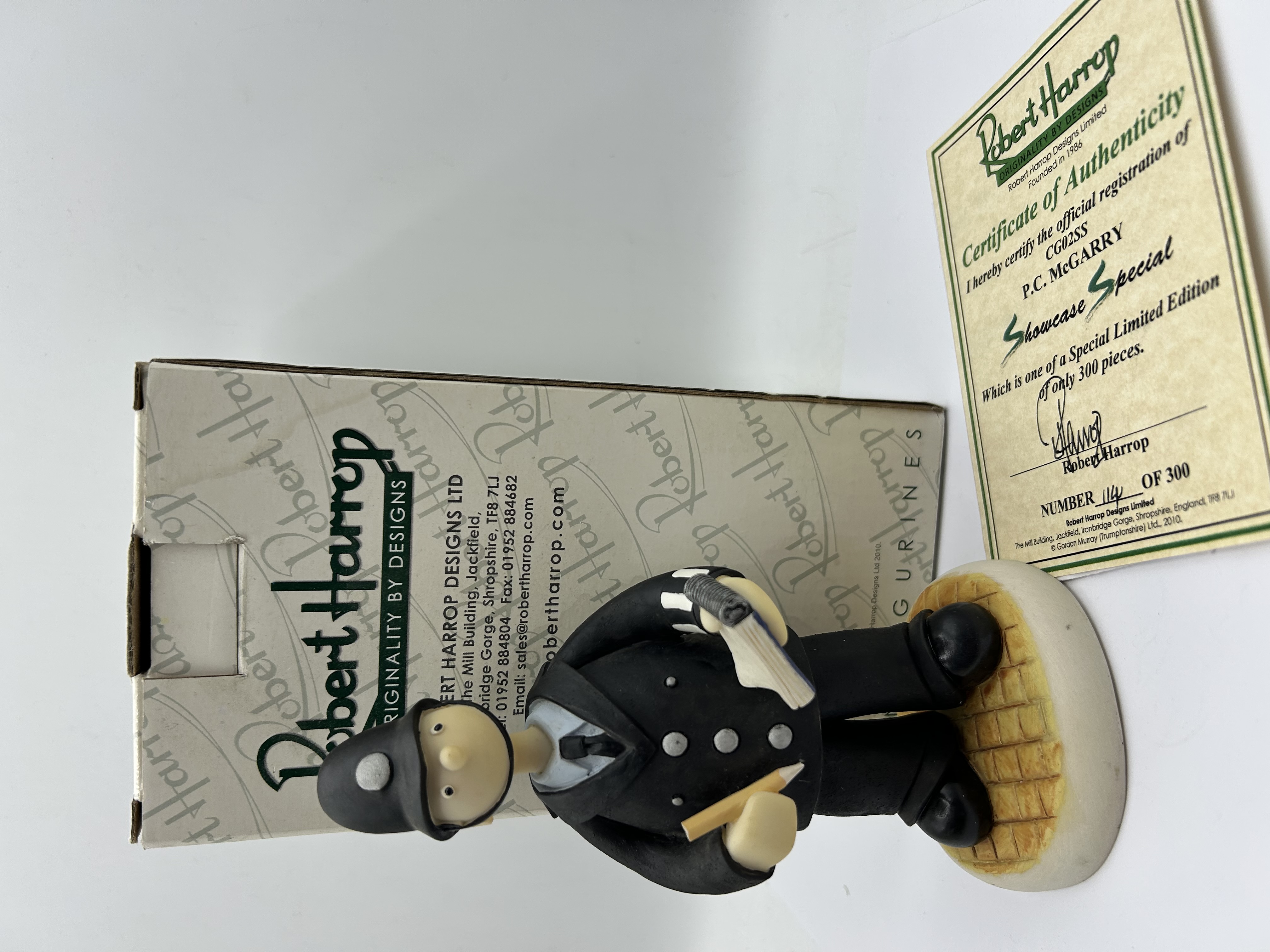 A Robert Harrop Designs hand-painted resin figurine depicting the character P.C. McGarry from Gordon Murray’s Trumptonshire series, model reference CG02SS. This piece is a Showcase Special limited edition, numbered 114 of a production run of 300. The figure is rendered in a caricature style, dressed in a traditional black British police uniform with a white and black striped duty sleeve, holding a notebook and pencil. It stands on a circular base with a yellow cobblestone-effect surface. The lot is accompanied by the original branded manufacturer’s box and a Certificate of Authenticity dated 2010.
