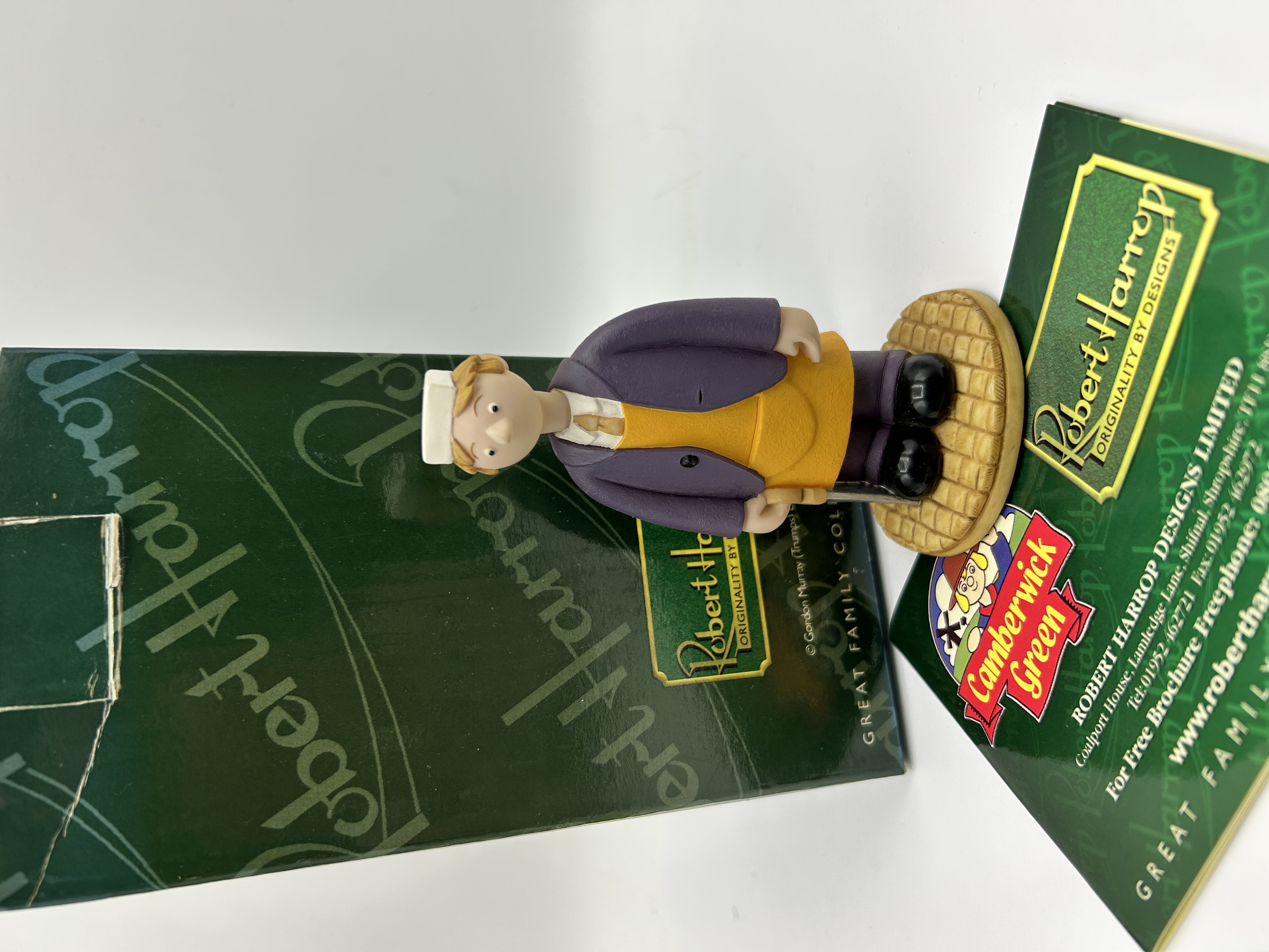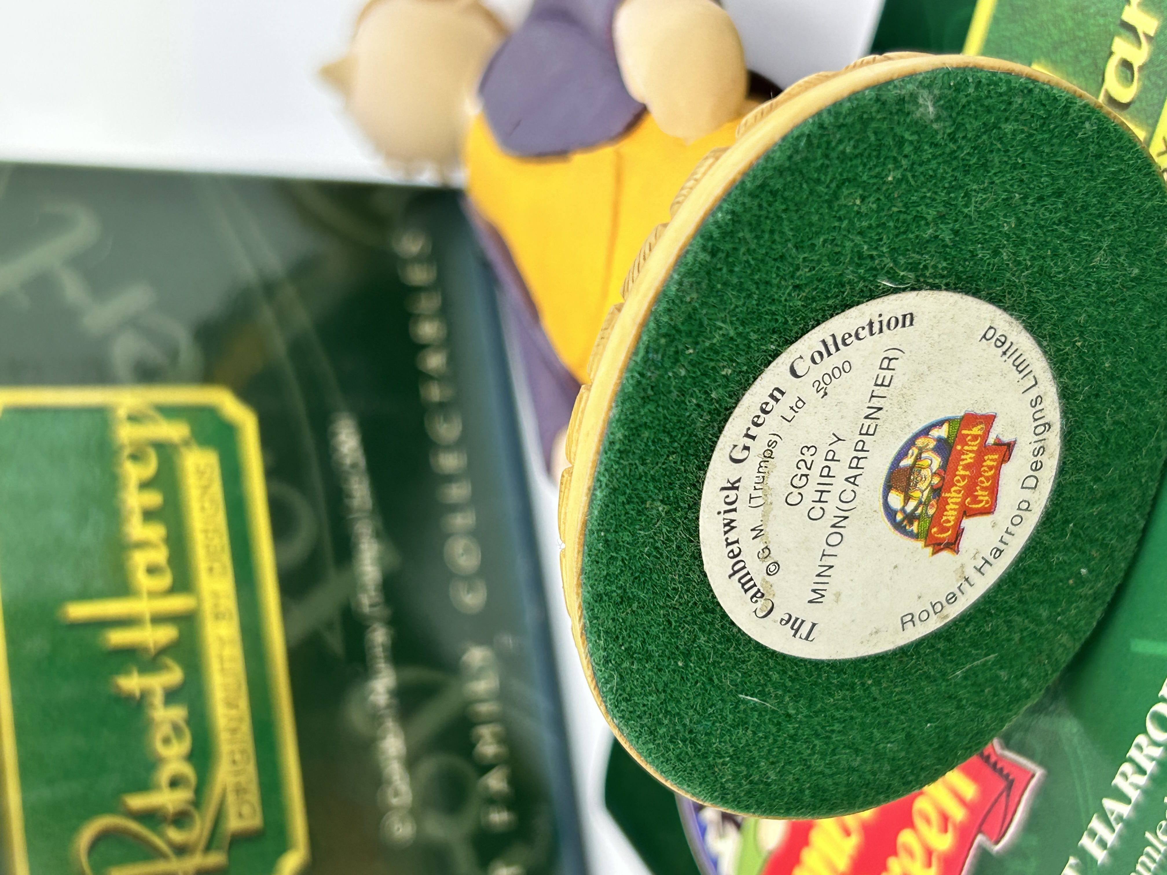 A Robert Harrop hand-painted figurine from The Camberwick Green Collection, depicting the character Chippy Minton (Carpenter). The figure is modelled standing on a circular base with a textured cobblestone-effect finish. The underside is finished with green felt and retains the original manufacturer’s circular paper label, which identifies the piece as CG23 Chippy Minton (Carpenter), copyright G.M. (Trumps) Ltd 2000, and Robert Harrop Designs Limited. The lot includes the original green branded presentation box and a related collector’s brochure.
