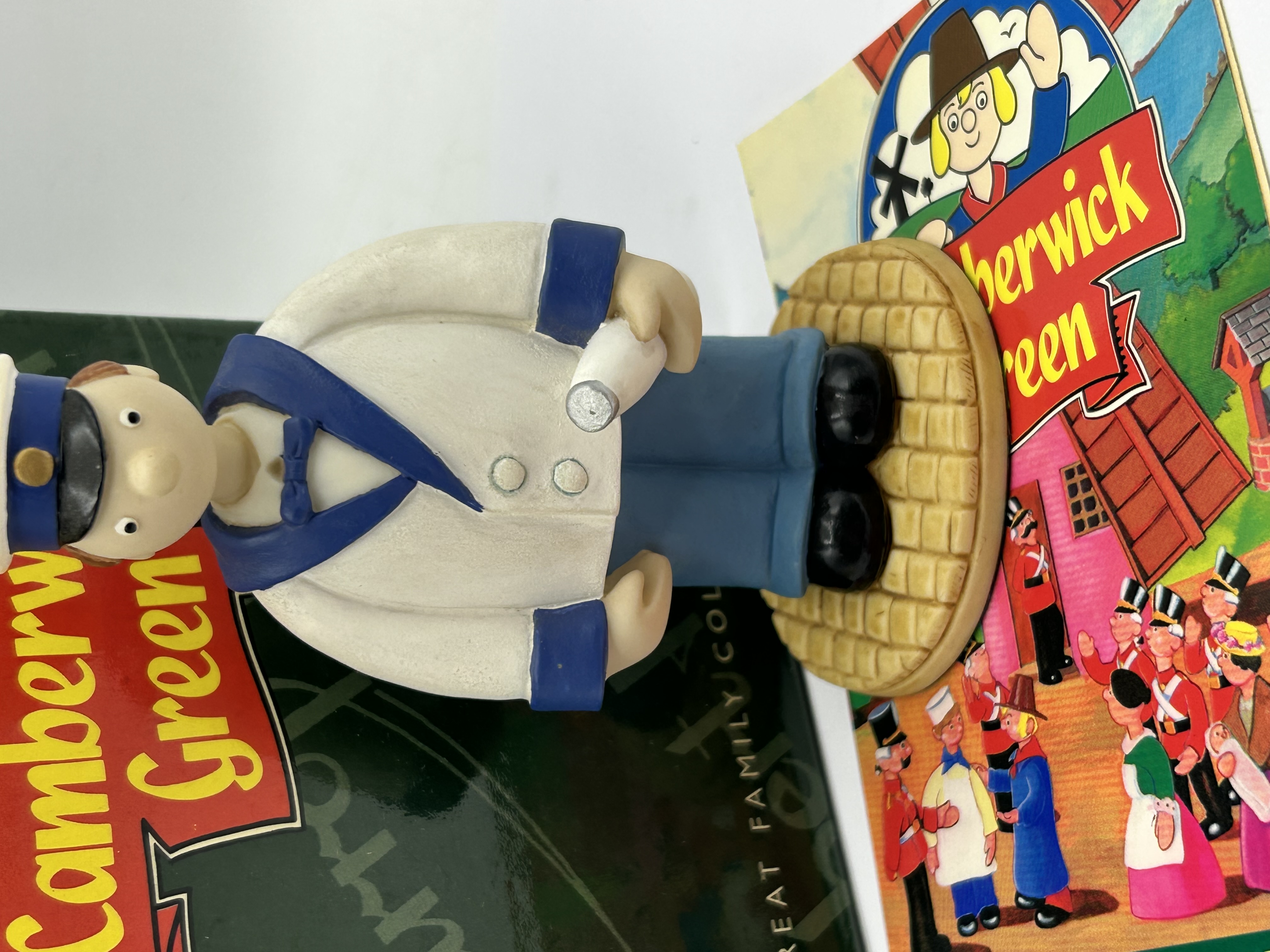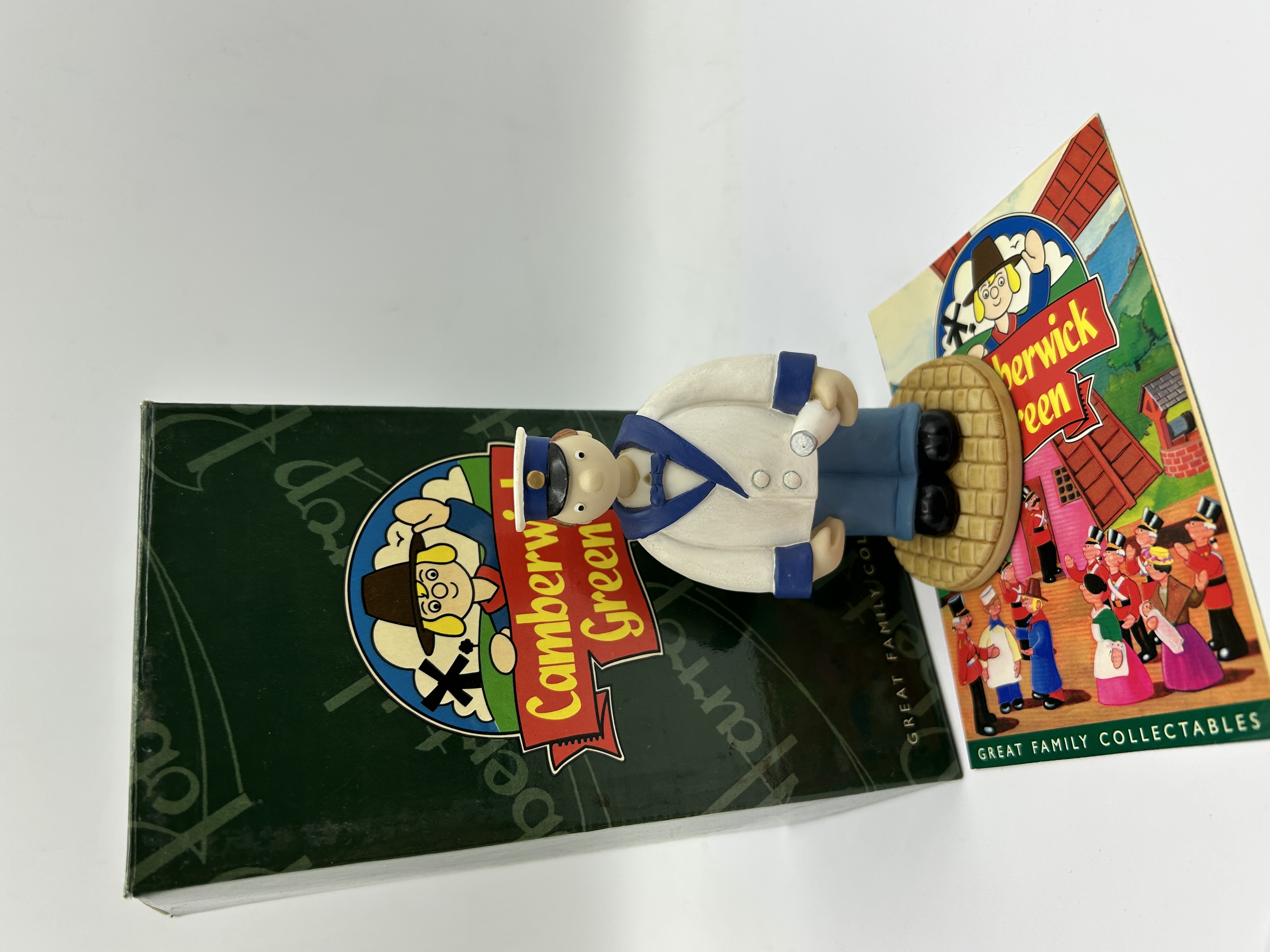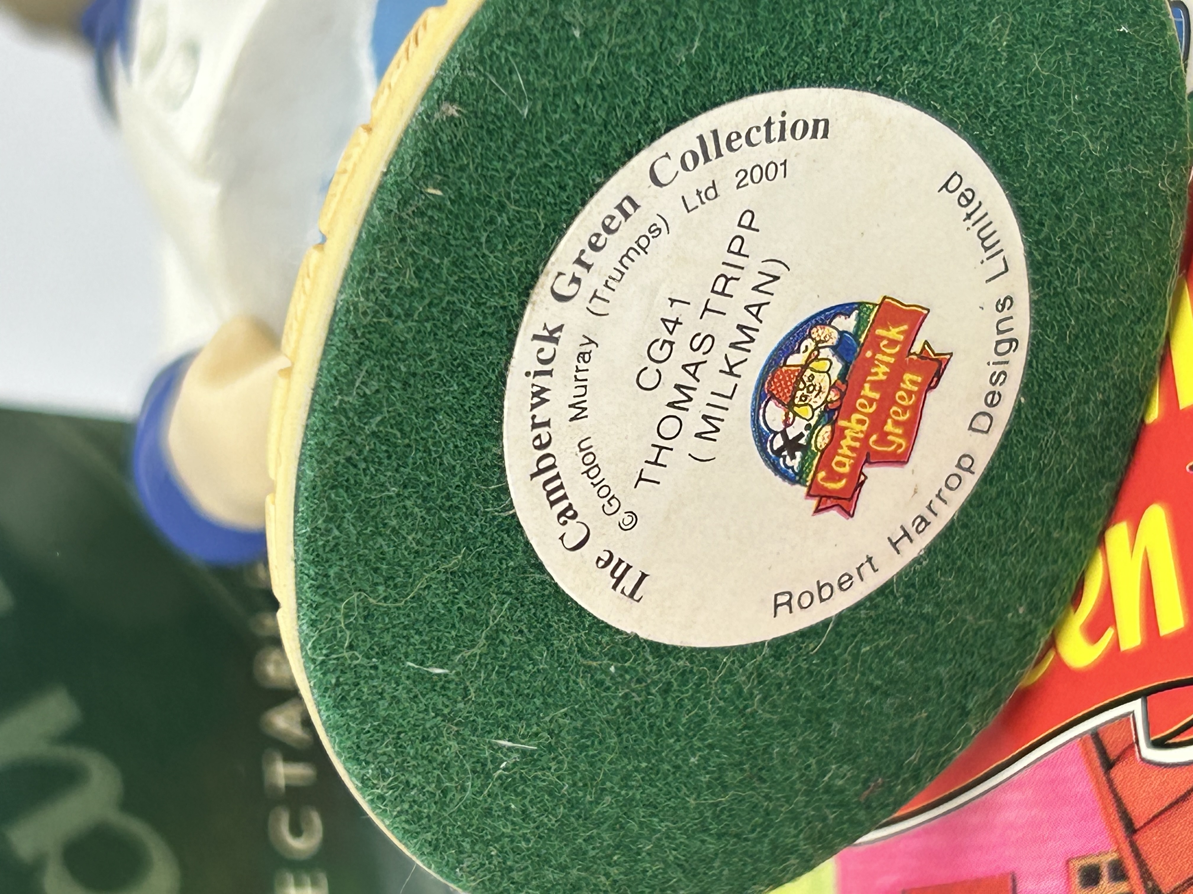 A hand-painted Robert Harrop figurine from the Camberwick Green Collection, depicting the character Thomas Tripp (Milkman), model number CG41. The figure is depicted in a white uniform with blue trim and a matching peaked cap, standing on a circular base with a cobblestone-effect finish. The underside of the base is fitted with a green felt pad and a printed maker’s label for Robert Harrop Designs Limited, dated 2001, including the copyright for Gordon Murray (Trumps) Ltd. The lot is accompanied by its original green branded cardboard box and a character information card.