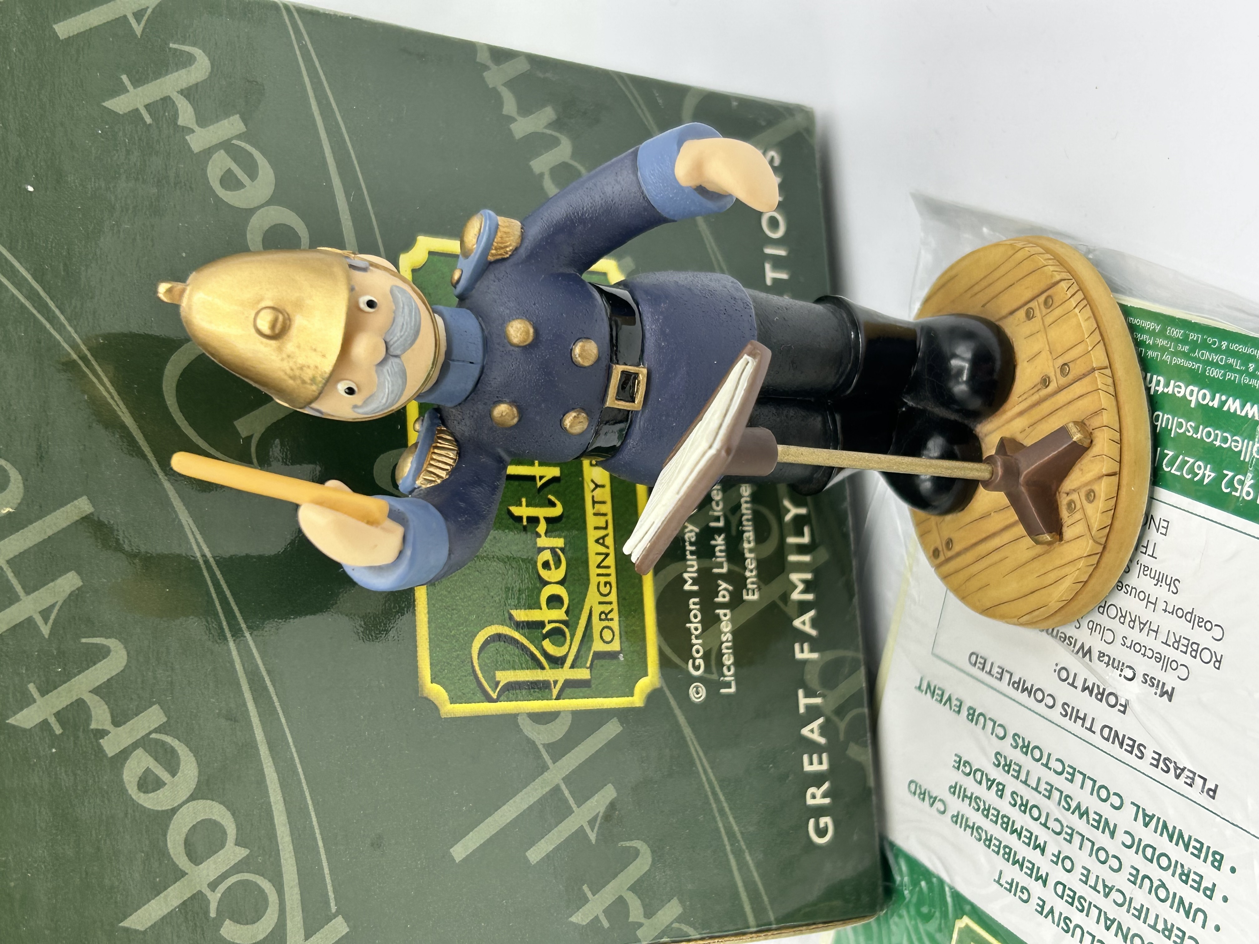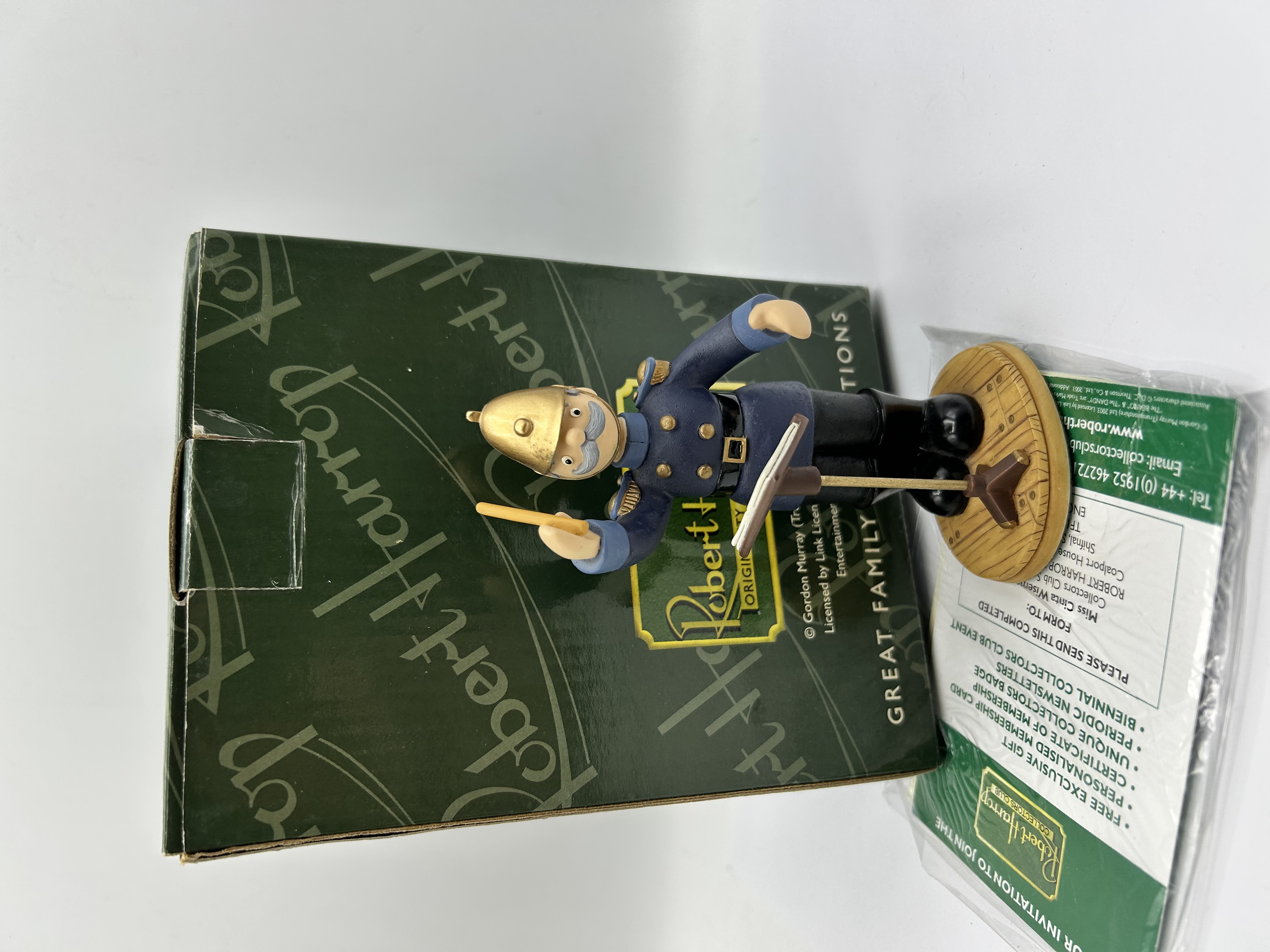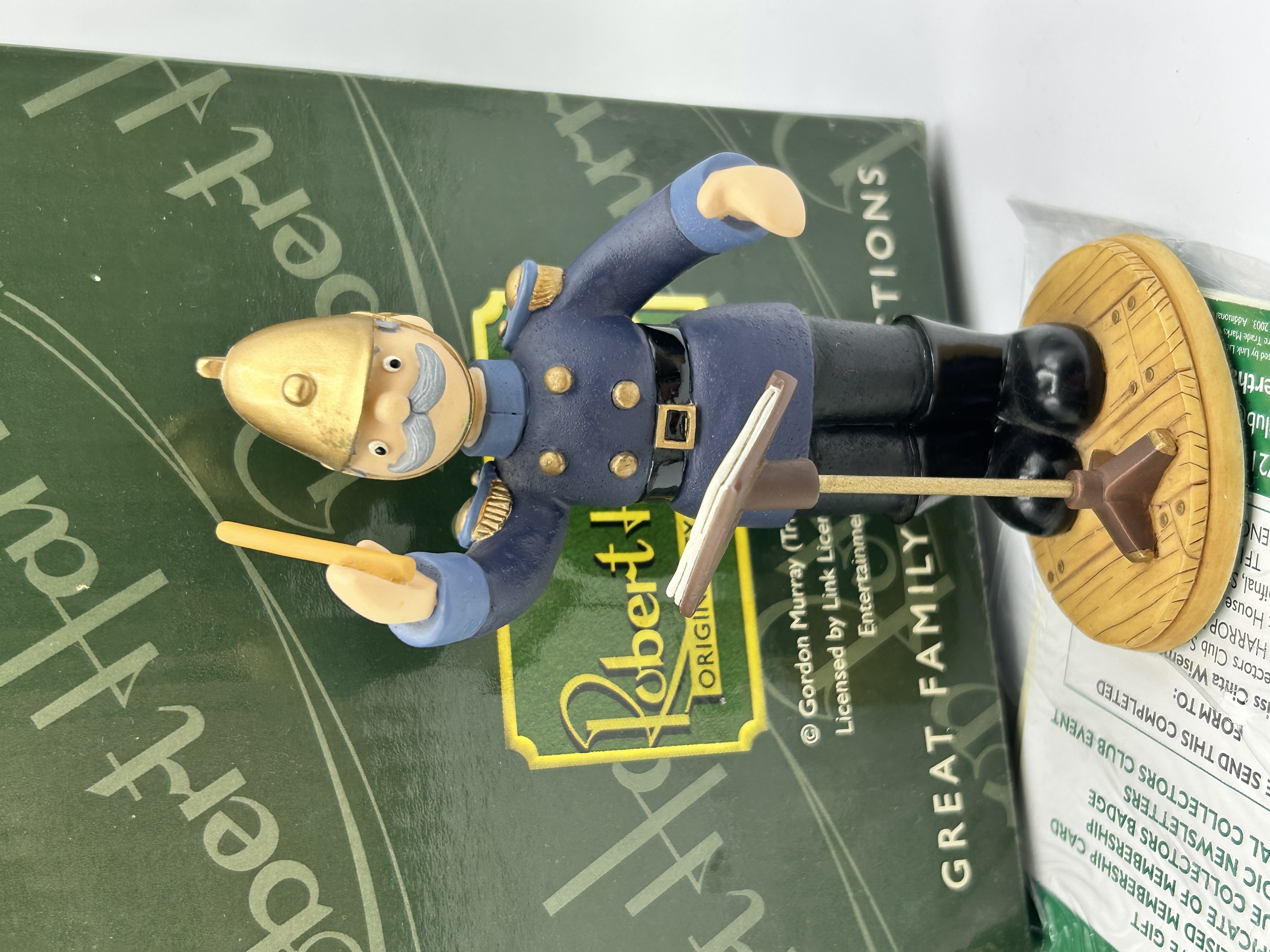 A Robert Harrop Designs resin figurine depicting the character Captain Flack from the Gordon Murray Trumptonshire series. The figure is modelled in a blue dress uniform with a gold-tone helmet and grey moustache, holding a yellow baton and standing behind a music stand on a circular wood-grain effect base. The item is accompanied by its original green presentation box, which bears the mark of Robert Harrop and includes text for ORIGINALITY and GREAT FAMILY TRADITIONS, along with a 2003 copyright notice for Gordon Murray (Trumptonshire) Ltd. Also present is a Robert Harrop Collectors Club invitation leaflet and membership form.