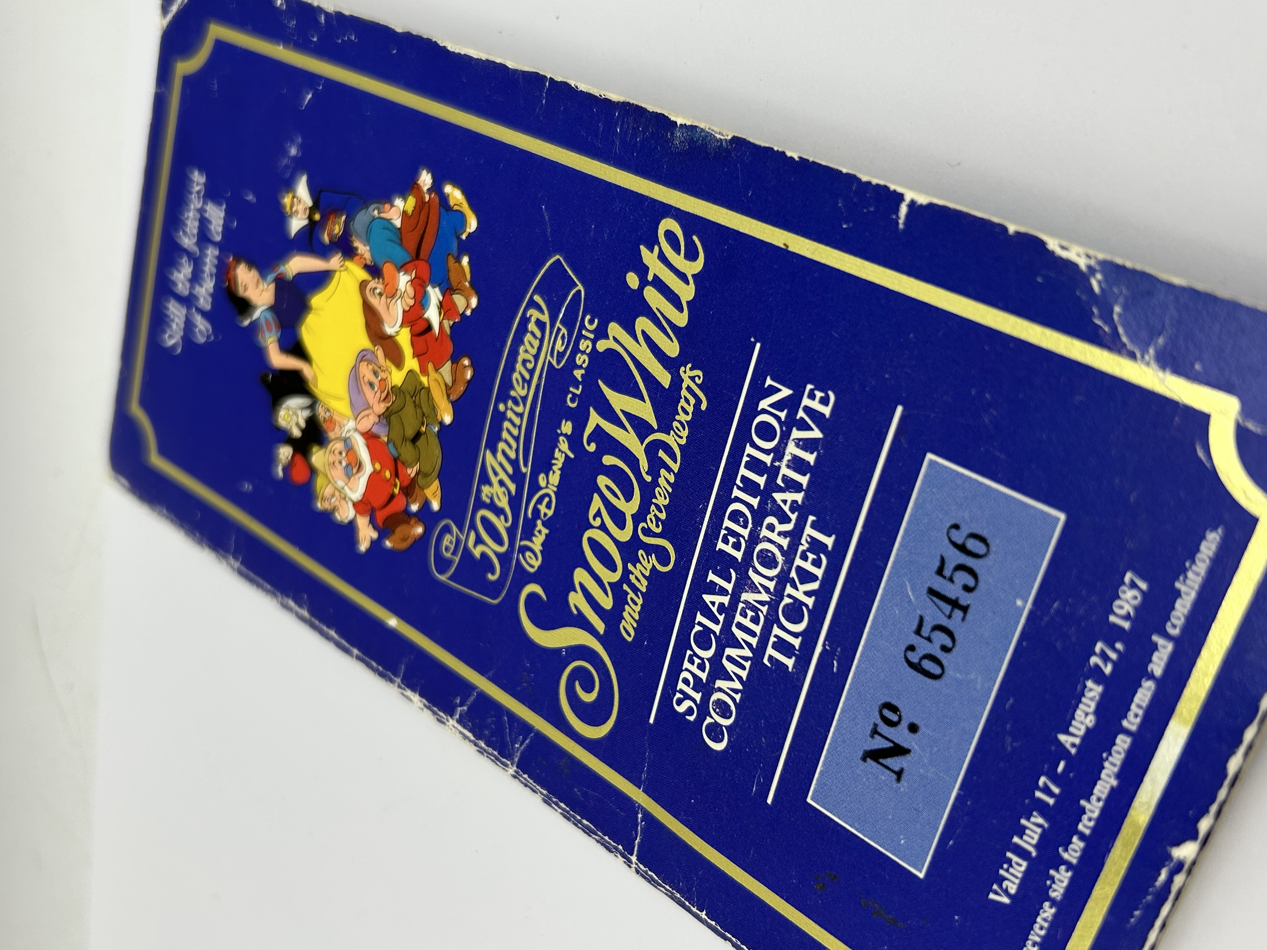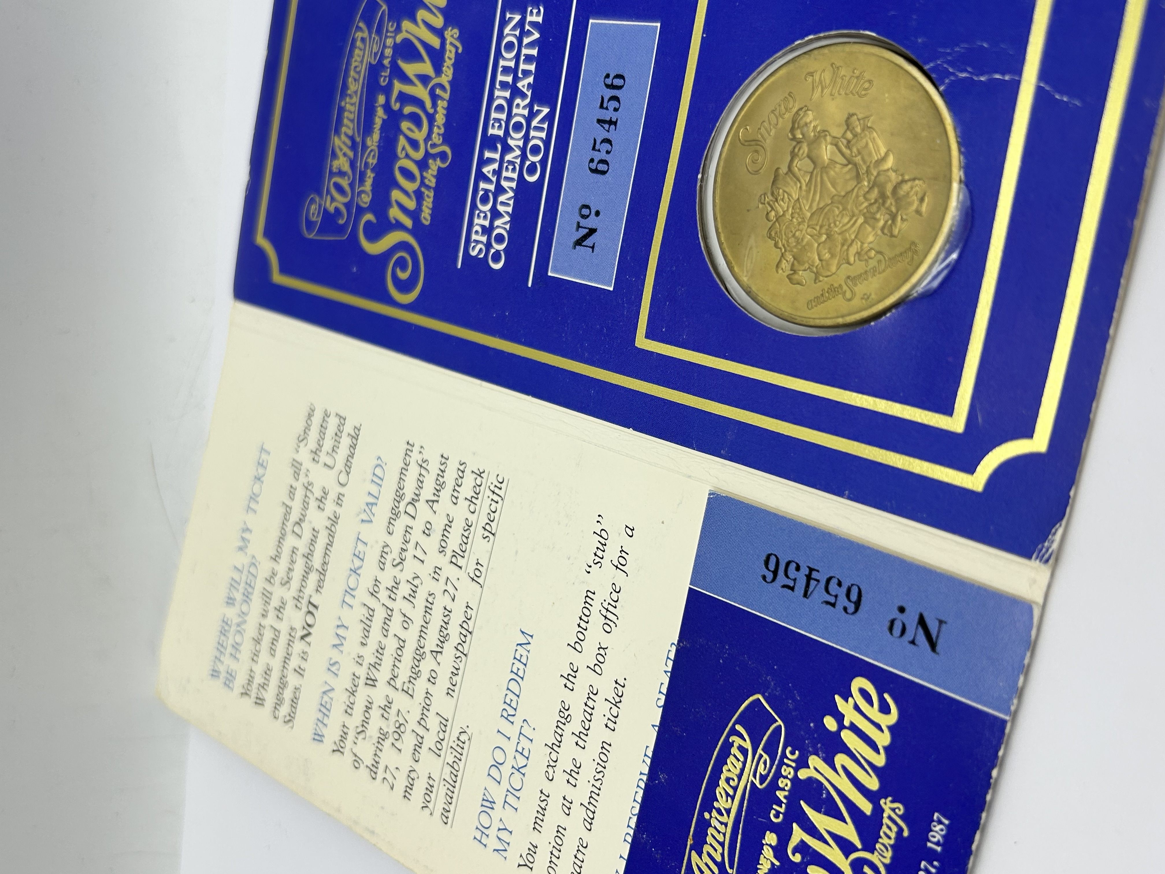 A Walt Disney’s Classic Snow White and the Seven Dwarfs 50th anniversary commemorative set, dating to 1987. The set comprises a gold-coloured metal commemorative coin and a corresponding special edition commemorative ticket, both sharing the serial number 65456. The items are presented in a printed card folder with blue and gold-toned decoration. The coin features a relief illustration of the characters and is held within a clear plastic mount. The ticket is printed with dates for a limited theatrical engagement between 17 July and 27 August 1987. The folder bears the Walt Disney’s Classic logo and 50th-anniversary branding.