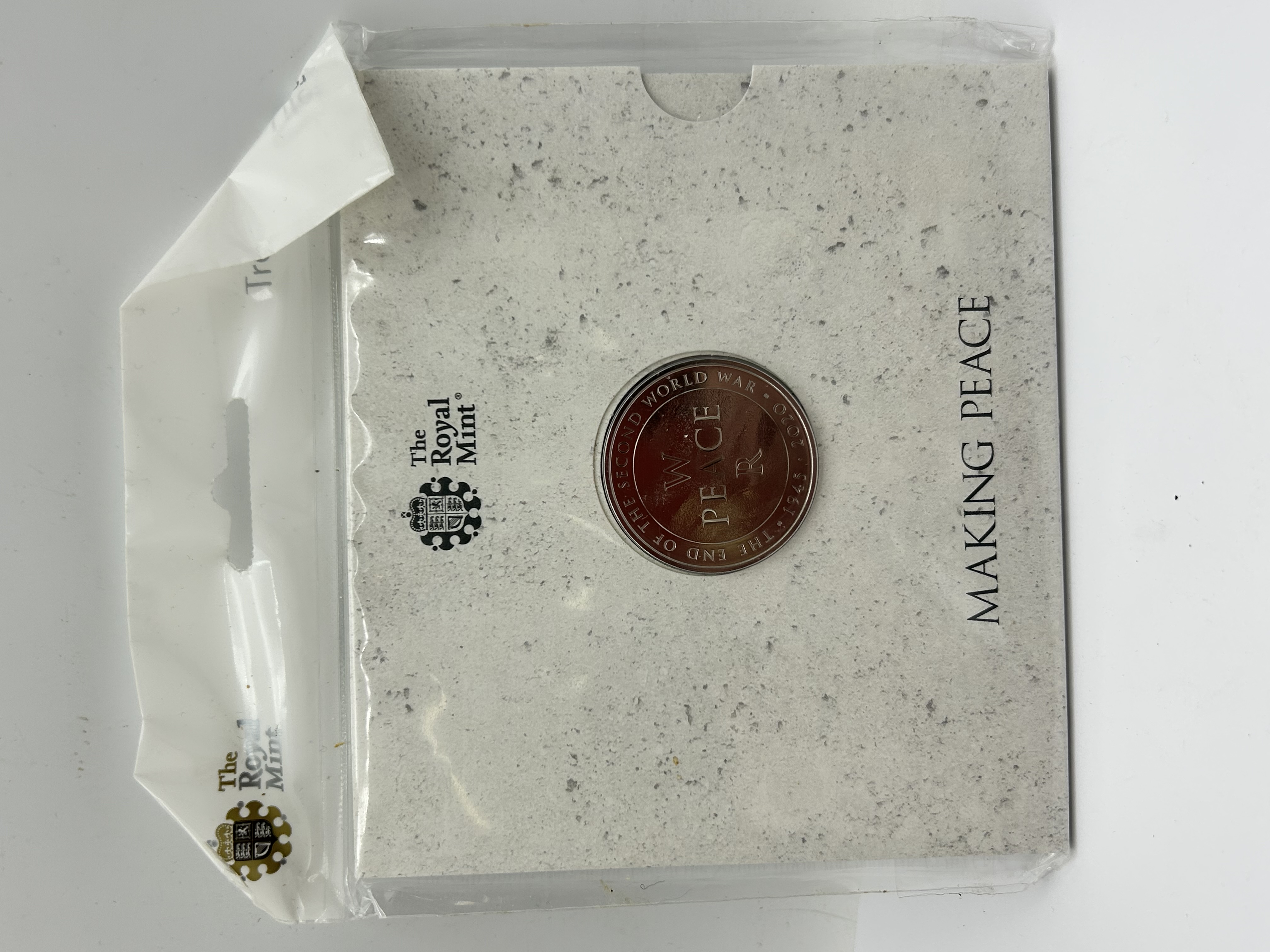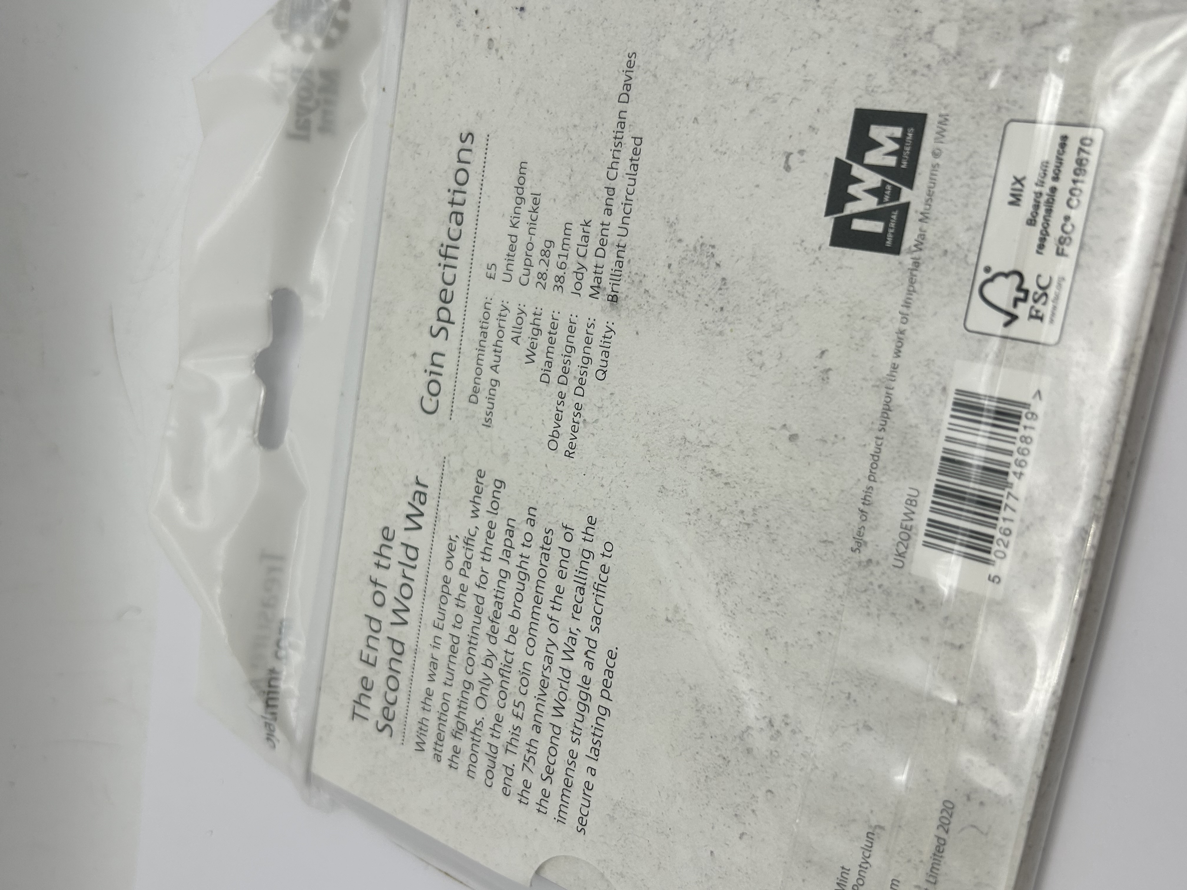A 2020 United Kingdom £5 commemorative coin struck by The Royal Mint to mark the 75th anniversary of the end of the Second World War. The cupro-nickel coin is presented in its original Making Peace themed card folder and remains sealed within the original clear plastic retail hang-bag. The obverse features the fifth definitive portrait of Queen Elizabeth II by Jody Clark. The reverse, designed by Matt Dent and Christian Davies, is inscribed THE END OF THE SECOND WORLD WAR 1945 – 2020 and PEACE. The reverse also bears the official logo of the Imperial War Museums. The coin is struck to Brilliant Uncirculated quality.