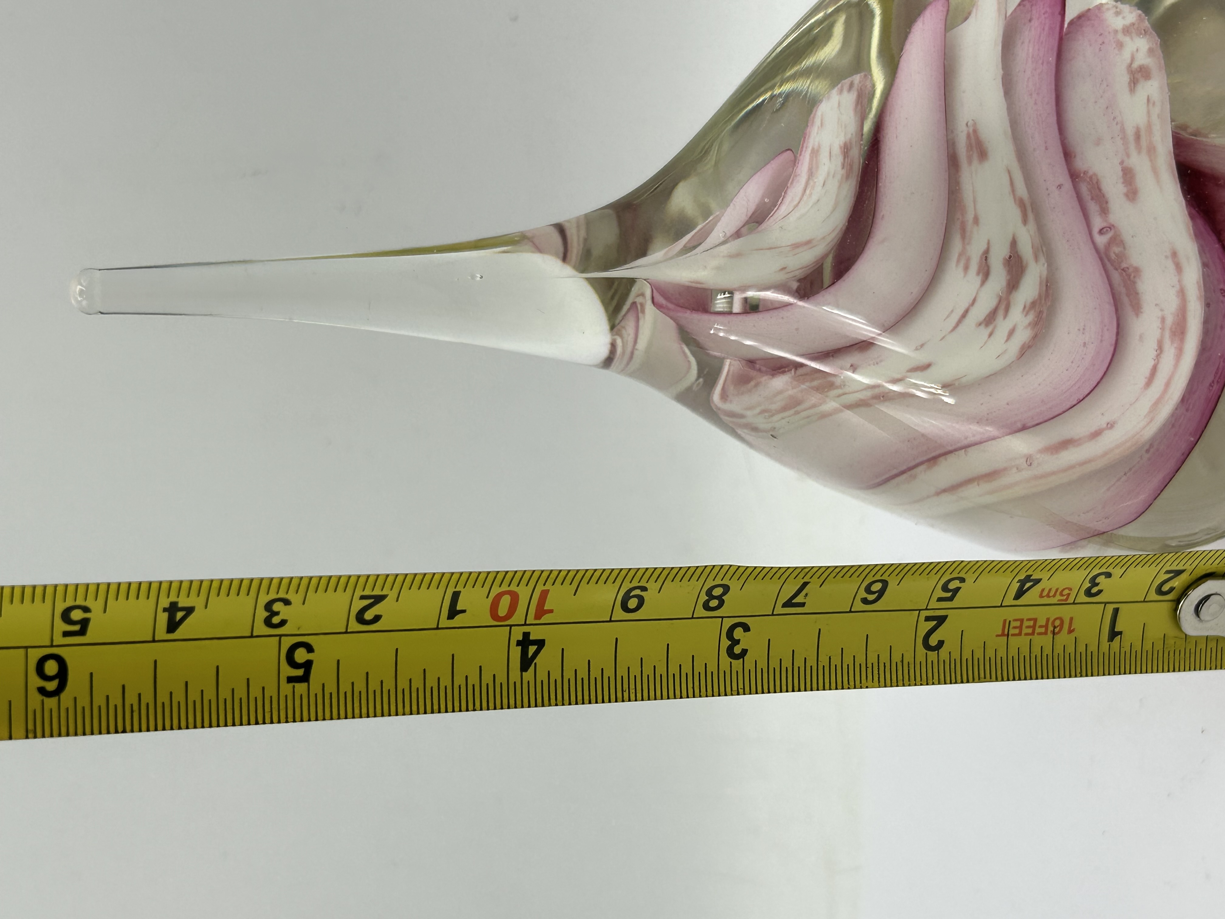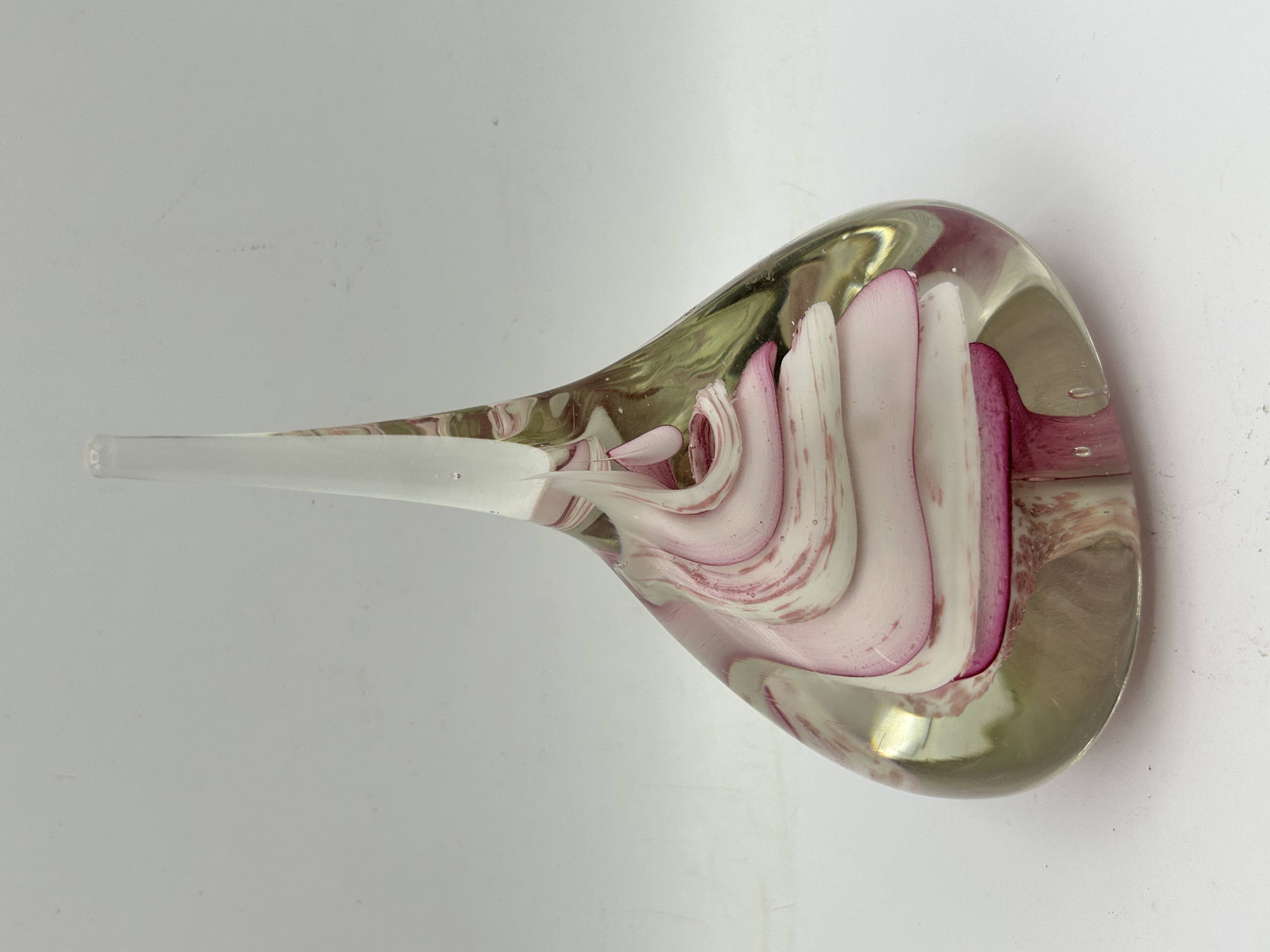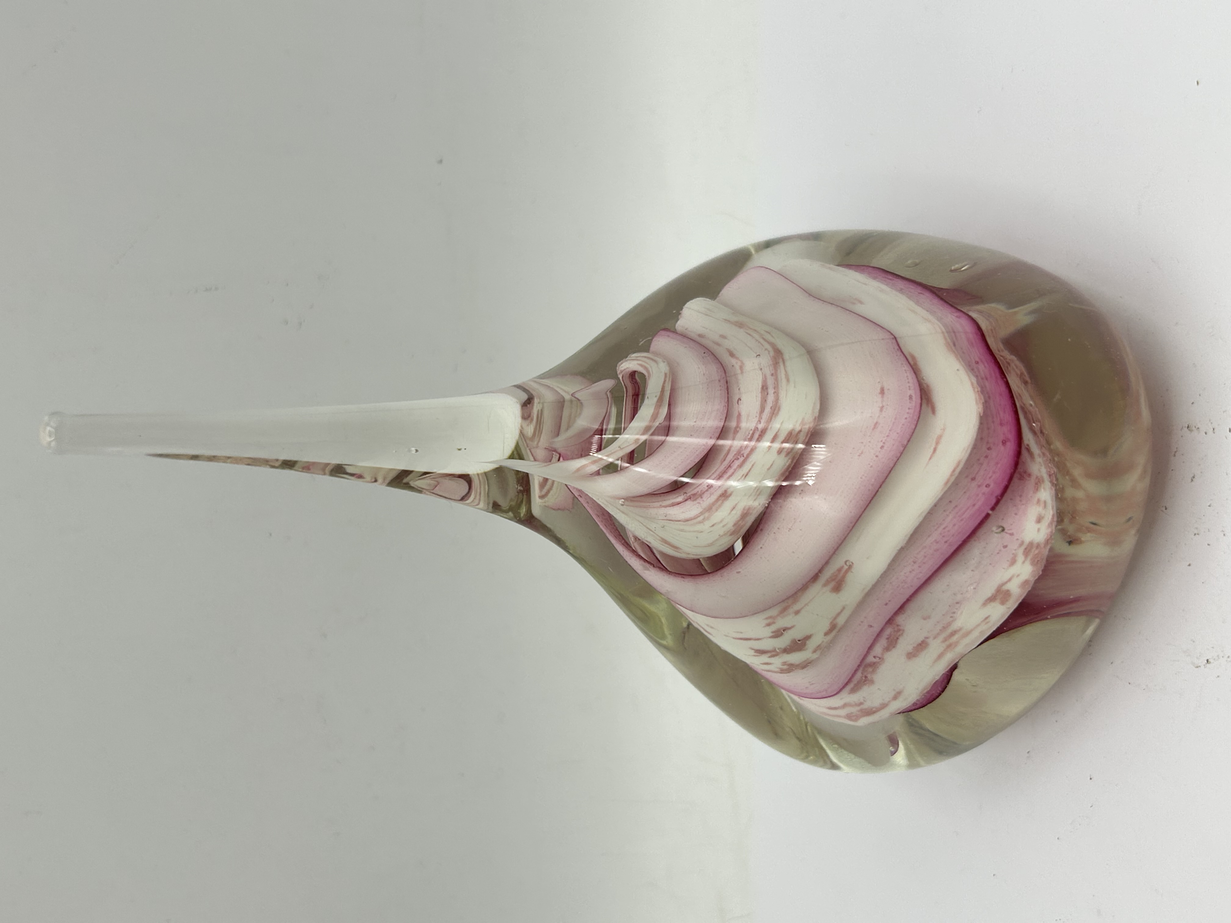 A handblown studio glass ring holder, attributed to the studio of Mary Angus. The object features a clear glass teardrop-shaped body with an internal spiralling ribbon design in shades of pink and white. The form terminates in a long, slender, clear glass pulled tail designed to hold rings. No maker’s marks or signatures are visible.