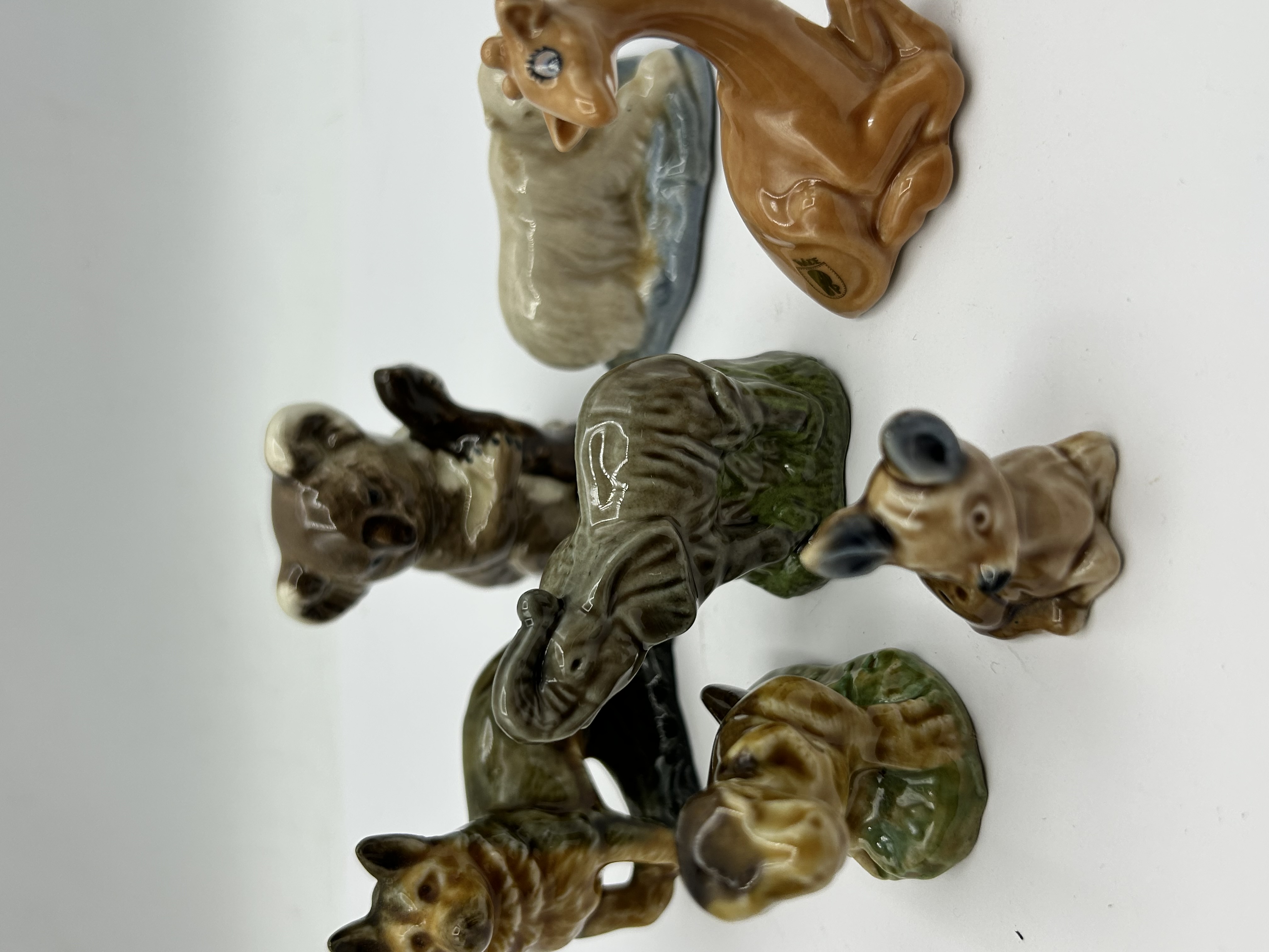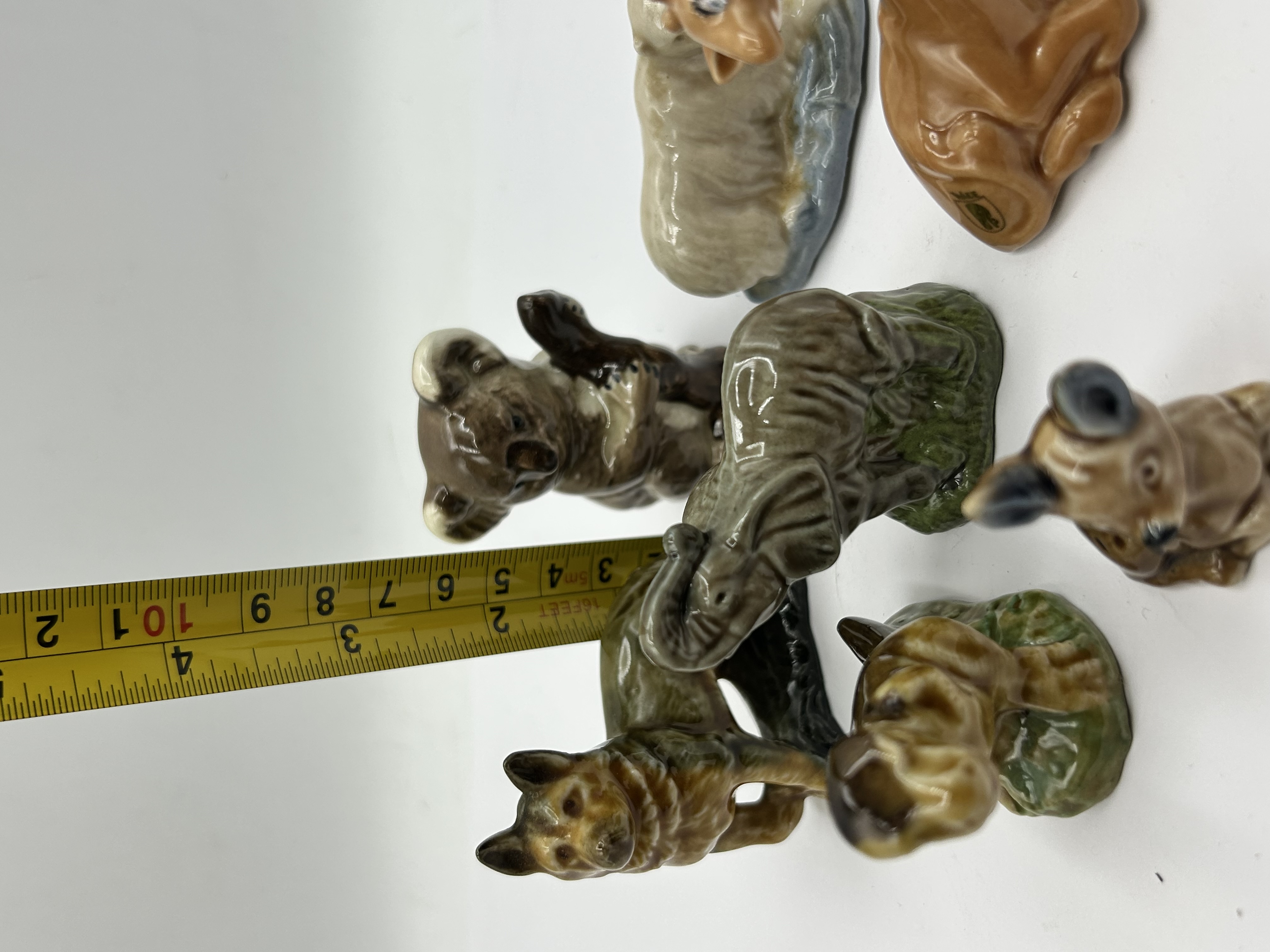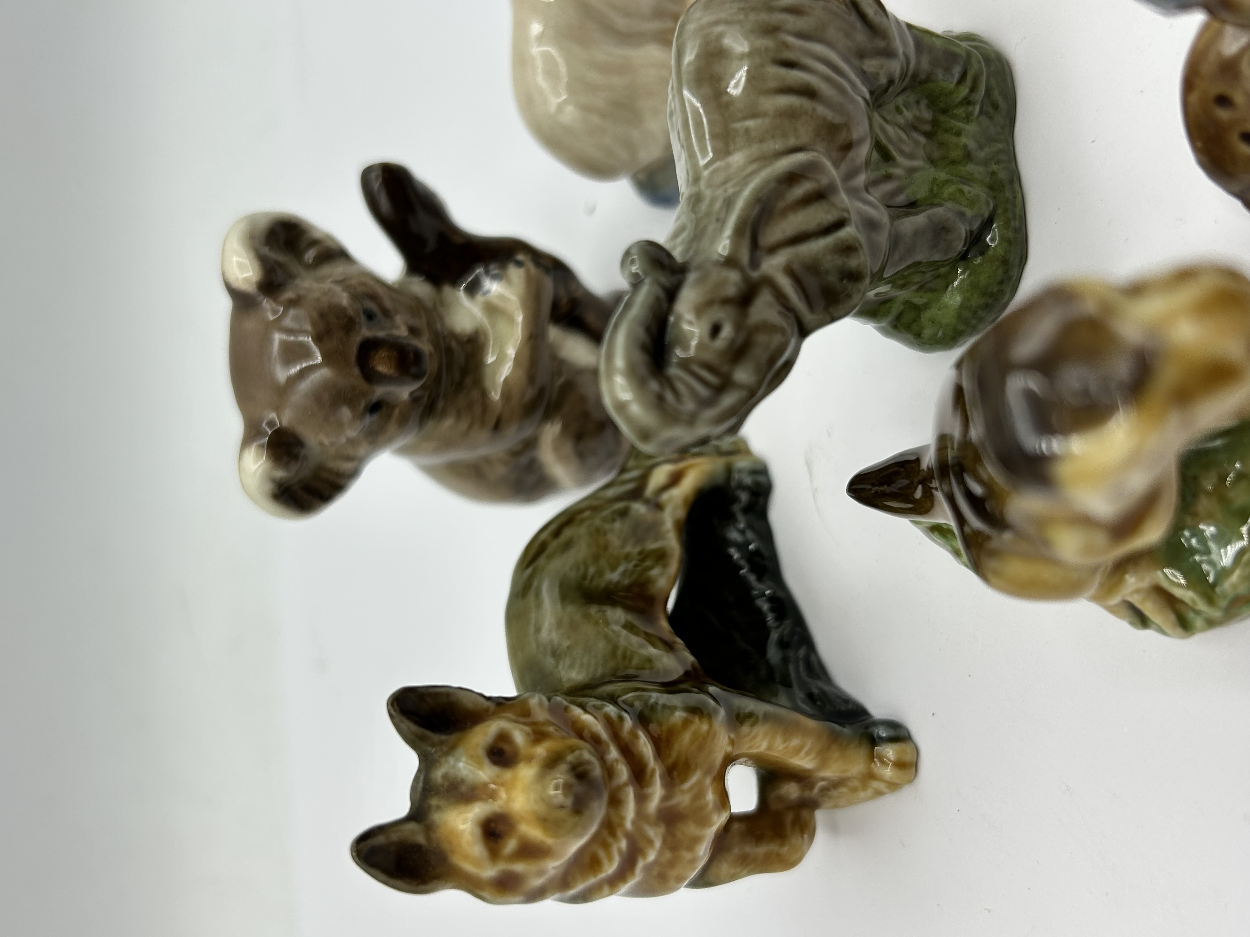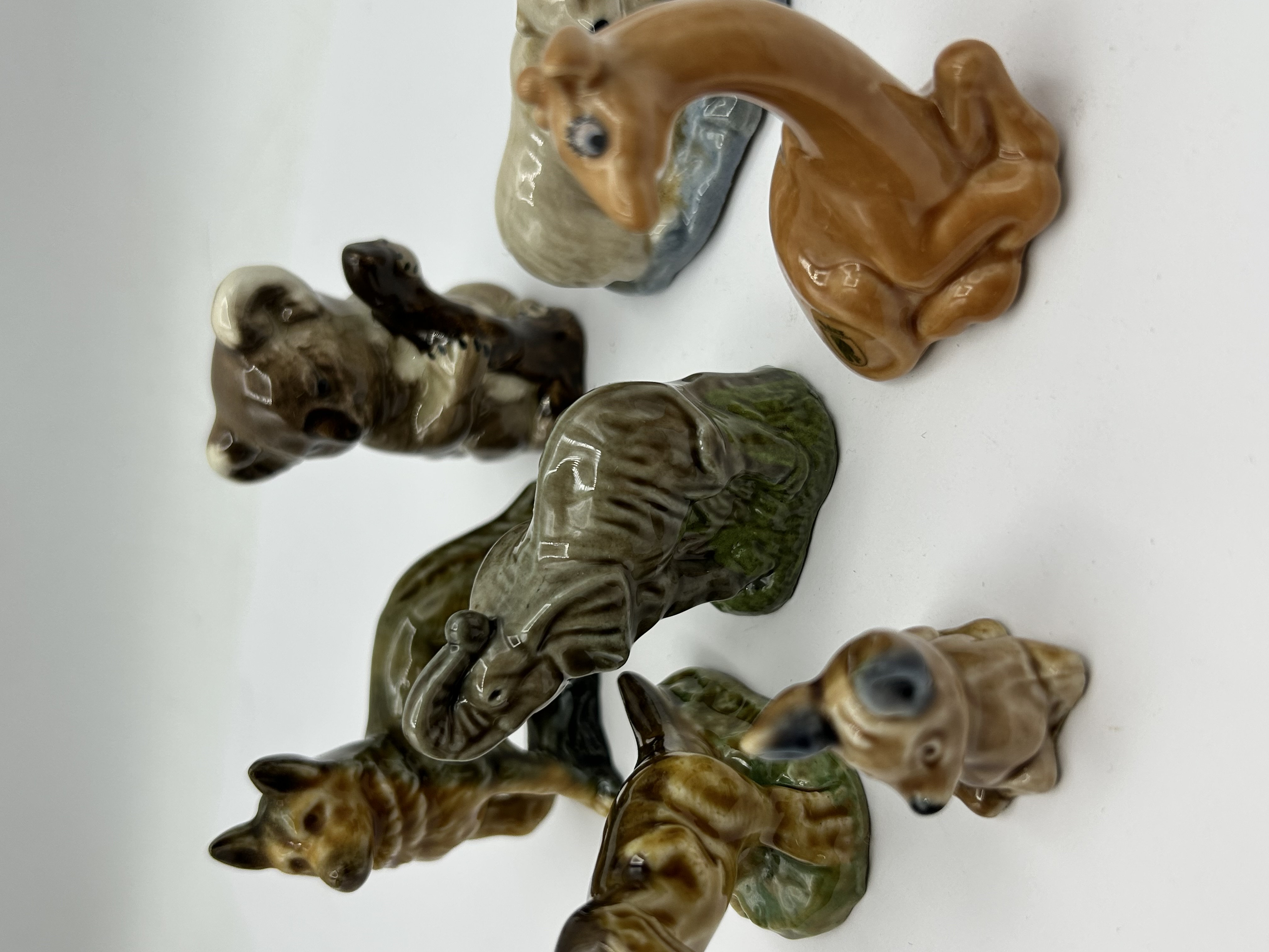 A collection of miniature glazed ceramic animal figurines from the Wade Whimsies series, produced for Red Rose Tea. The group includes a variety of animals including an elephant, a giraffe, a koala, and several canine and wildlife figures. Each figurine is finished in a high-gloss polychrome glaze with a palette of brown, tan, green, and blue tones. A circular gold-tone manufacturer’s mark is visible on the base of the giraffe figurine. The pieces are cast in various seated and standing poses, often featuring integral textured bases.