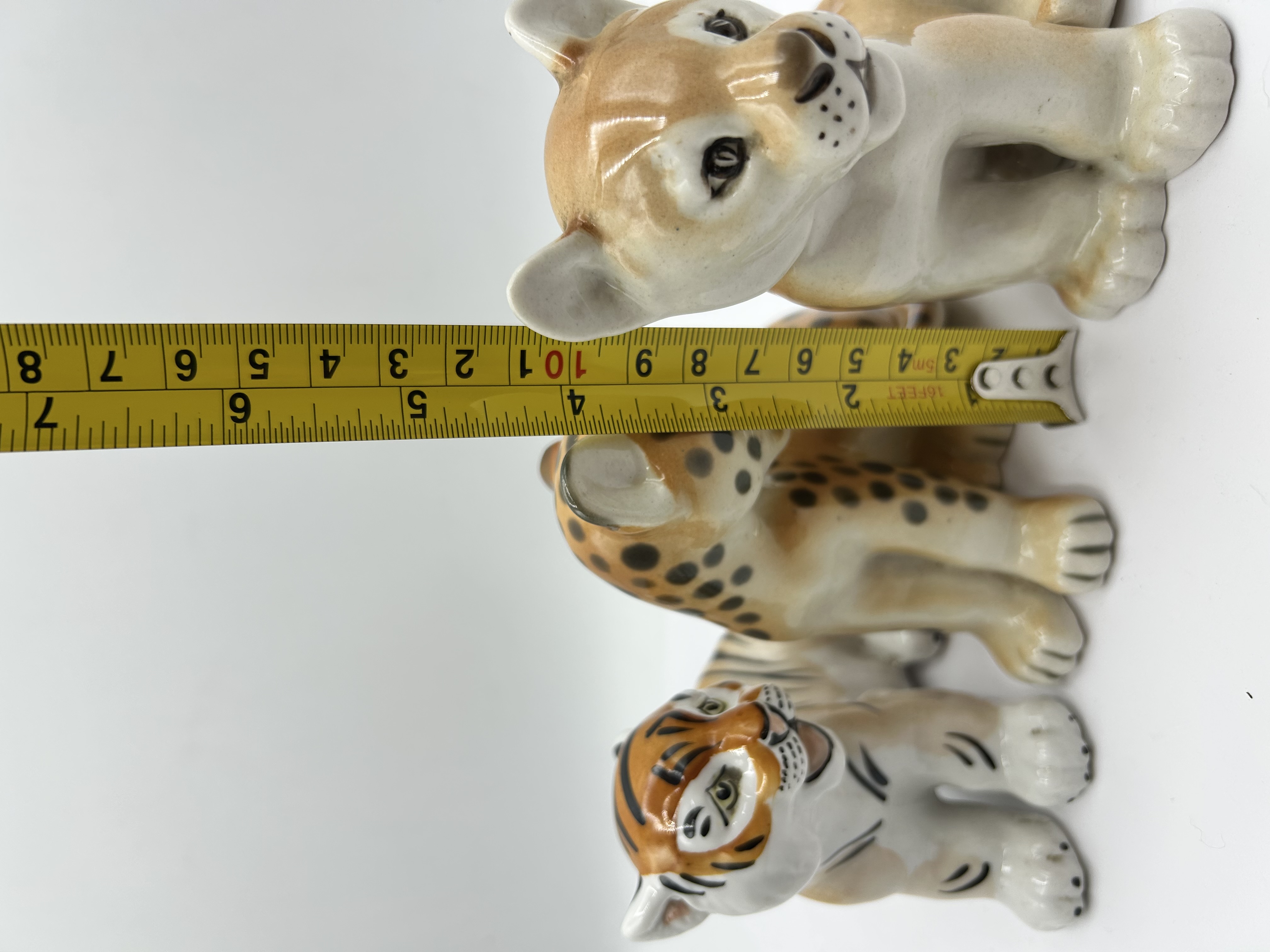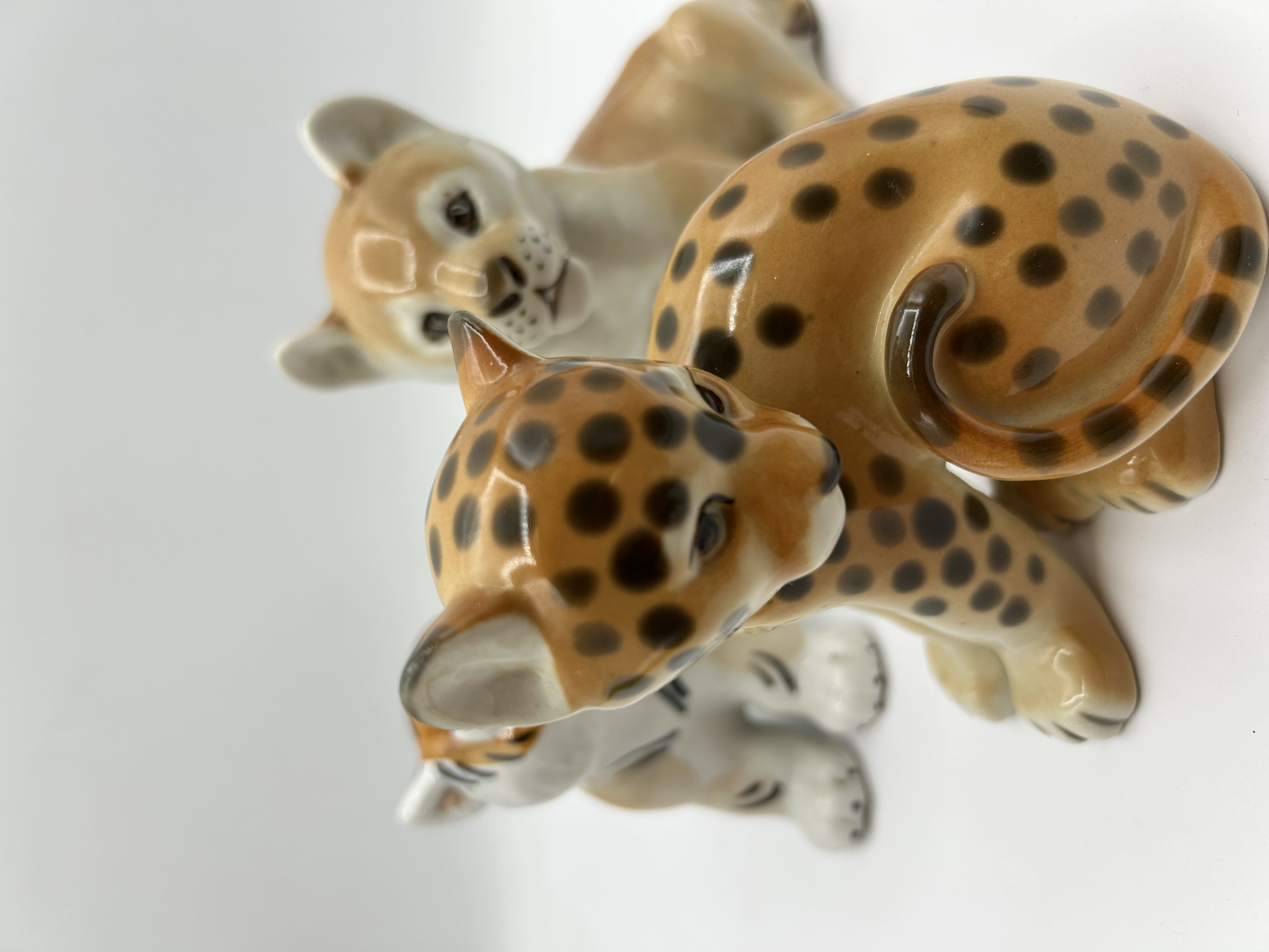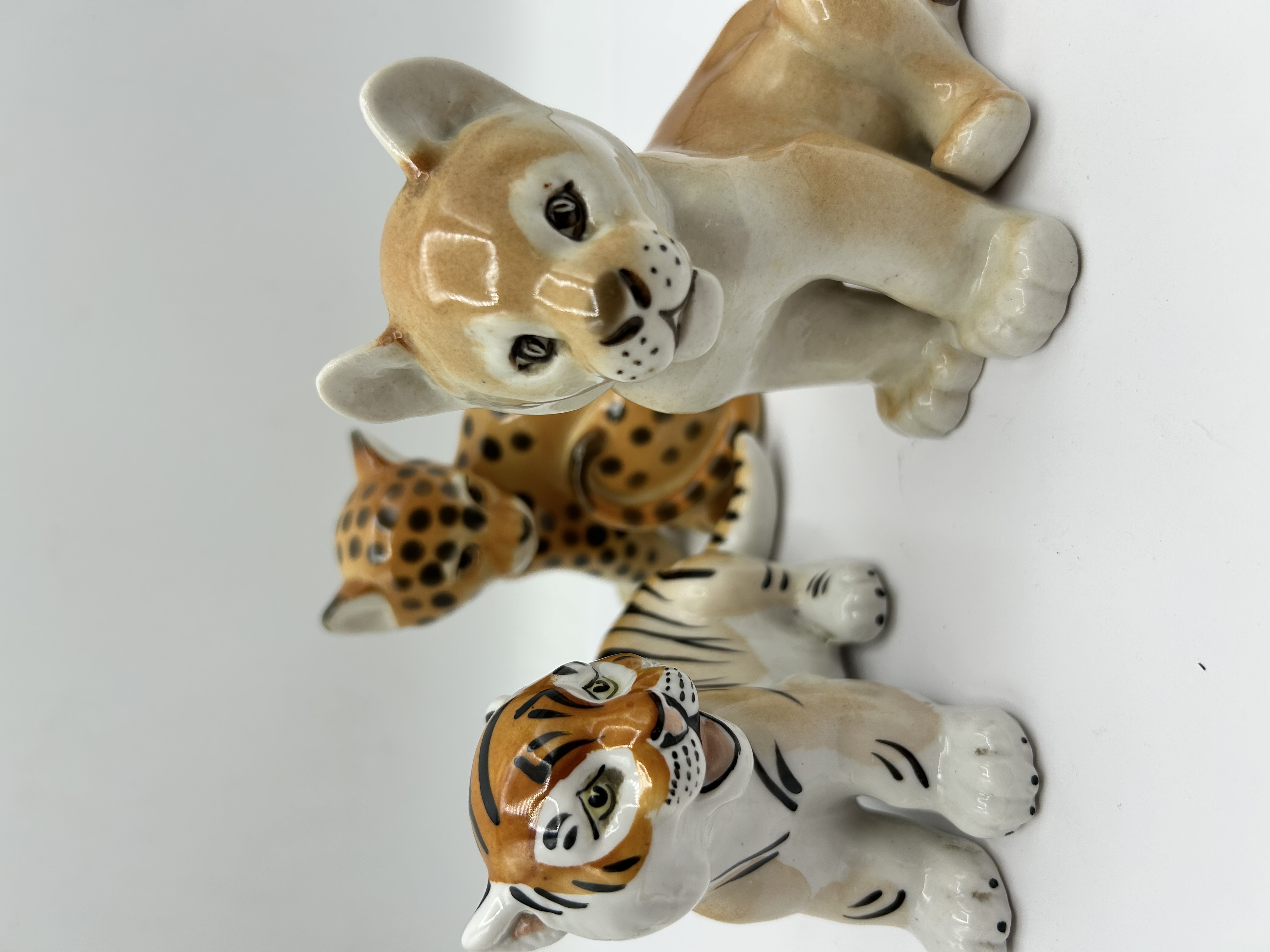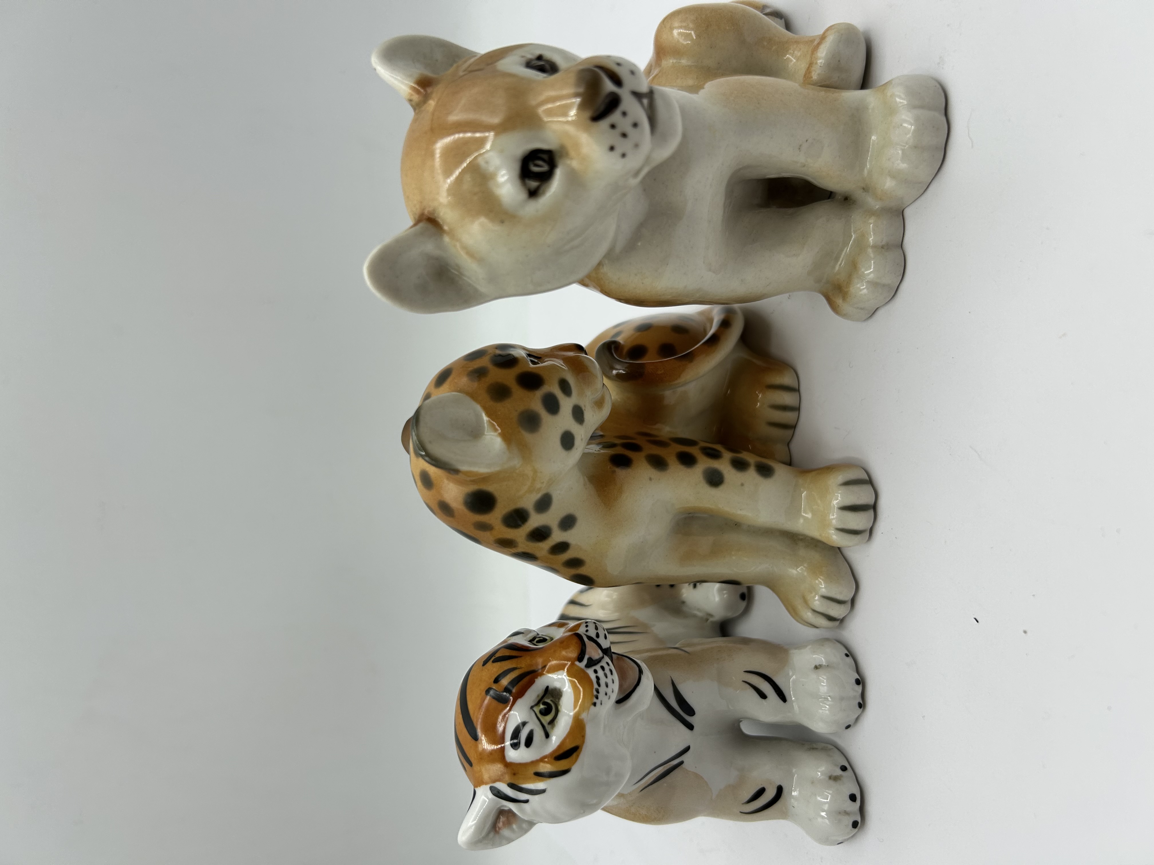 Attributed to the Lomonosov Porcelain Factory, this trio of glazed porcelain figurines depicts various big cat cubs, including a lion, a leopard, and a tiger. These stylized pieces feature a glossy, polychrome finish with hand-painted details defining the characteristic fur patterns and facial features. Each figure is depicted in a seated pose.