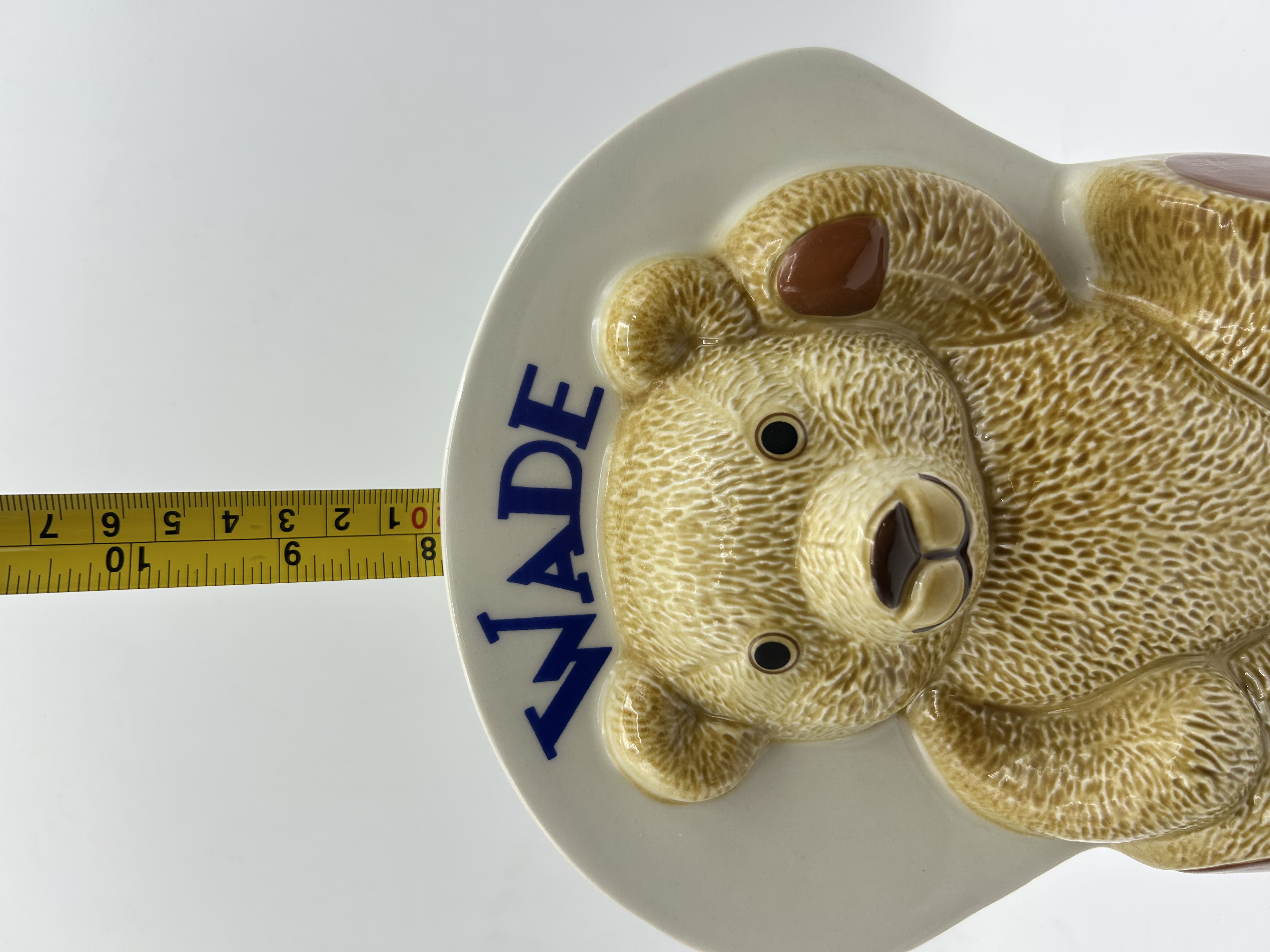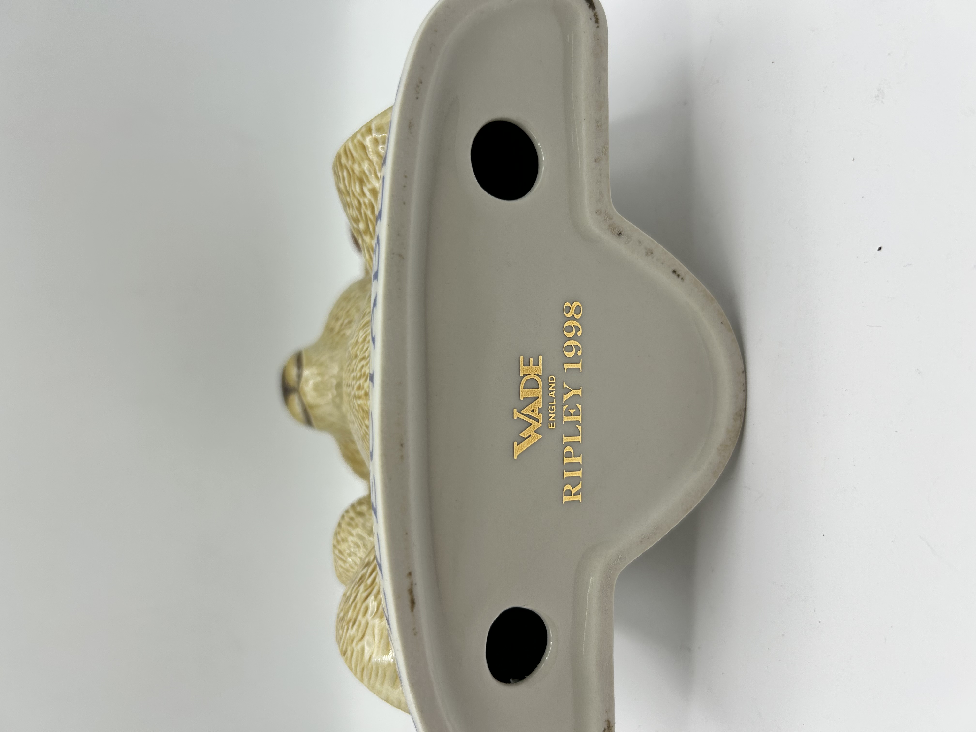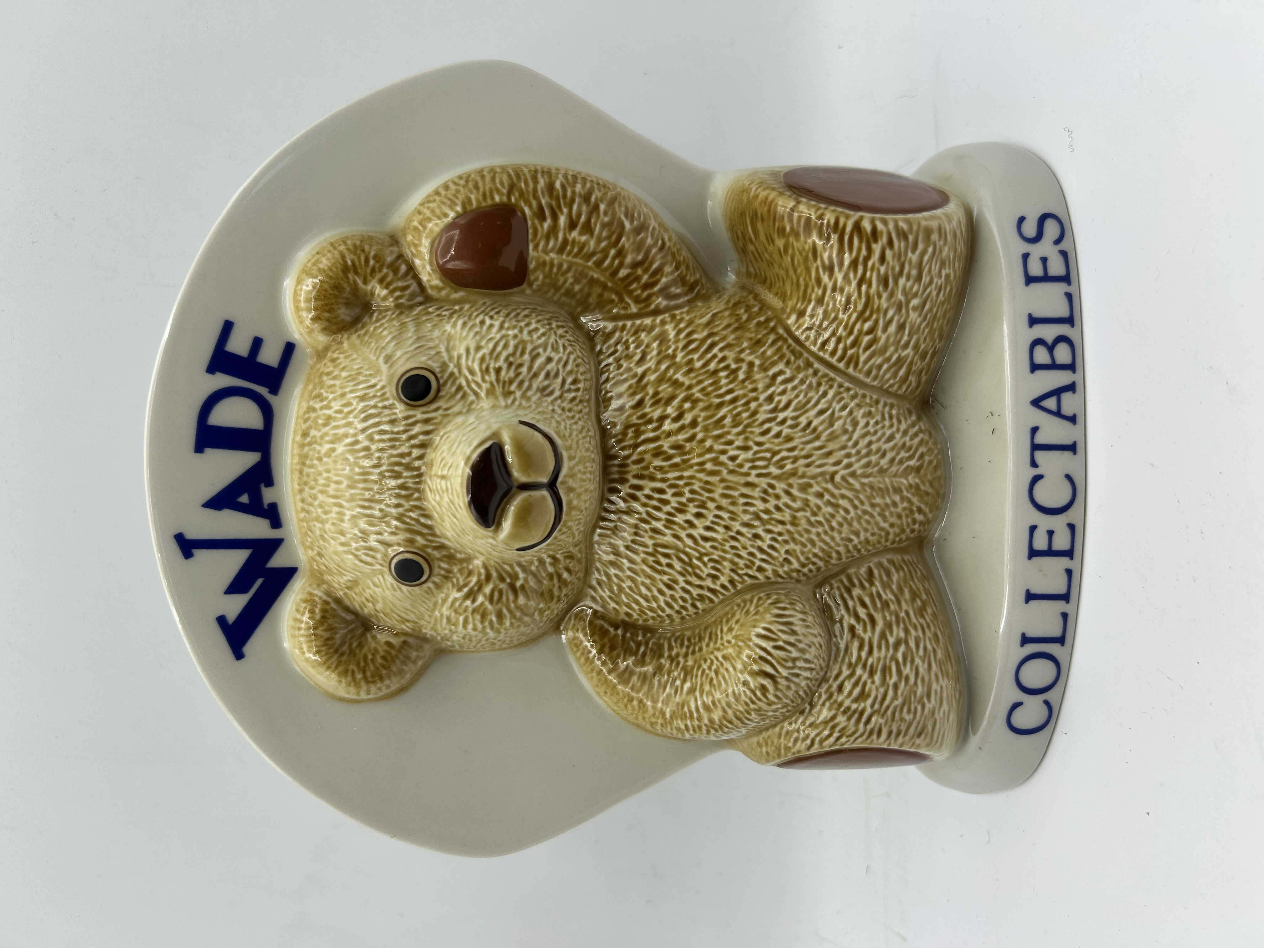 A Wade ceramic point-of-sale display stand, dated 1998. The piece features a central high-relief moulded teddy bear with a textured honey-coloured glaze and dark brown accents on its paws, nose, and eyes. The cream-coloured ceramic stand is inscribed on the front with WADE and COLLECTABLES in bold blue lettering. The base is marked with a gold-stamped insignia reading WADE ENGLAND RIPLEY 1998.