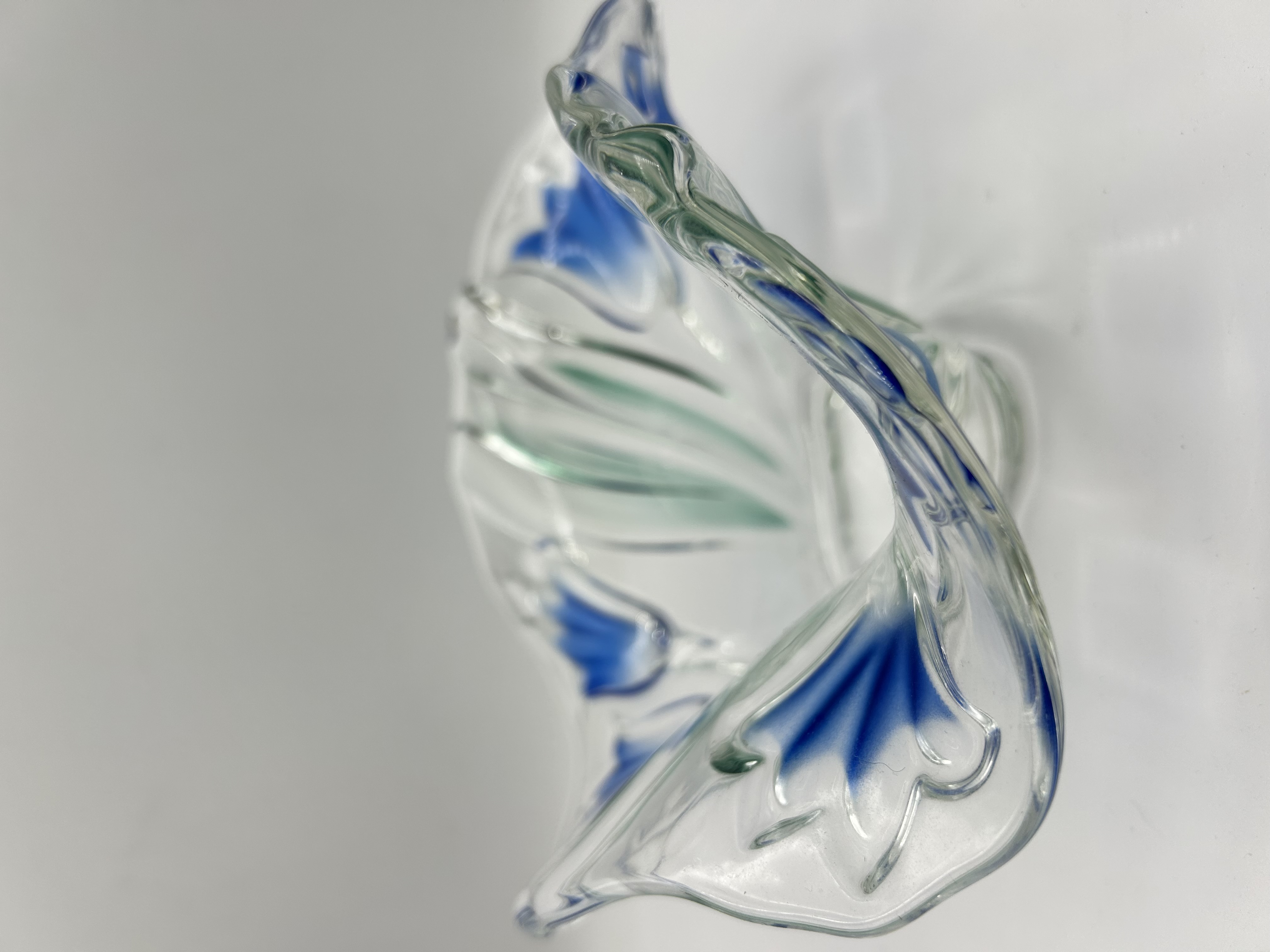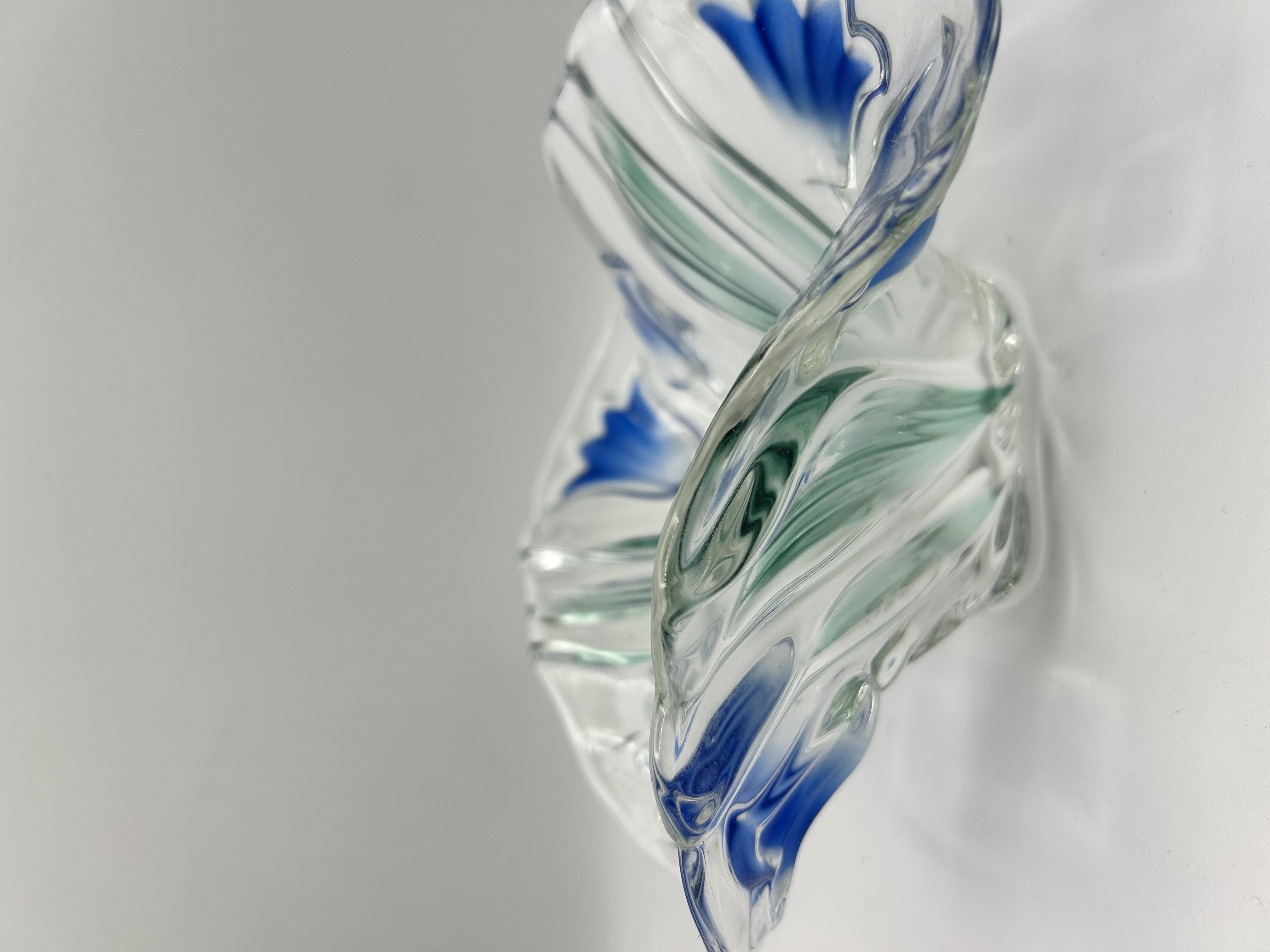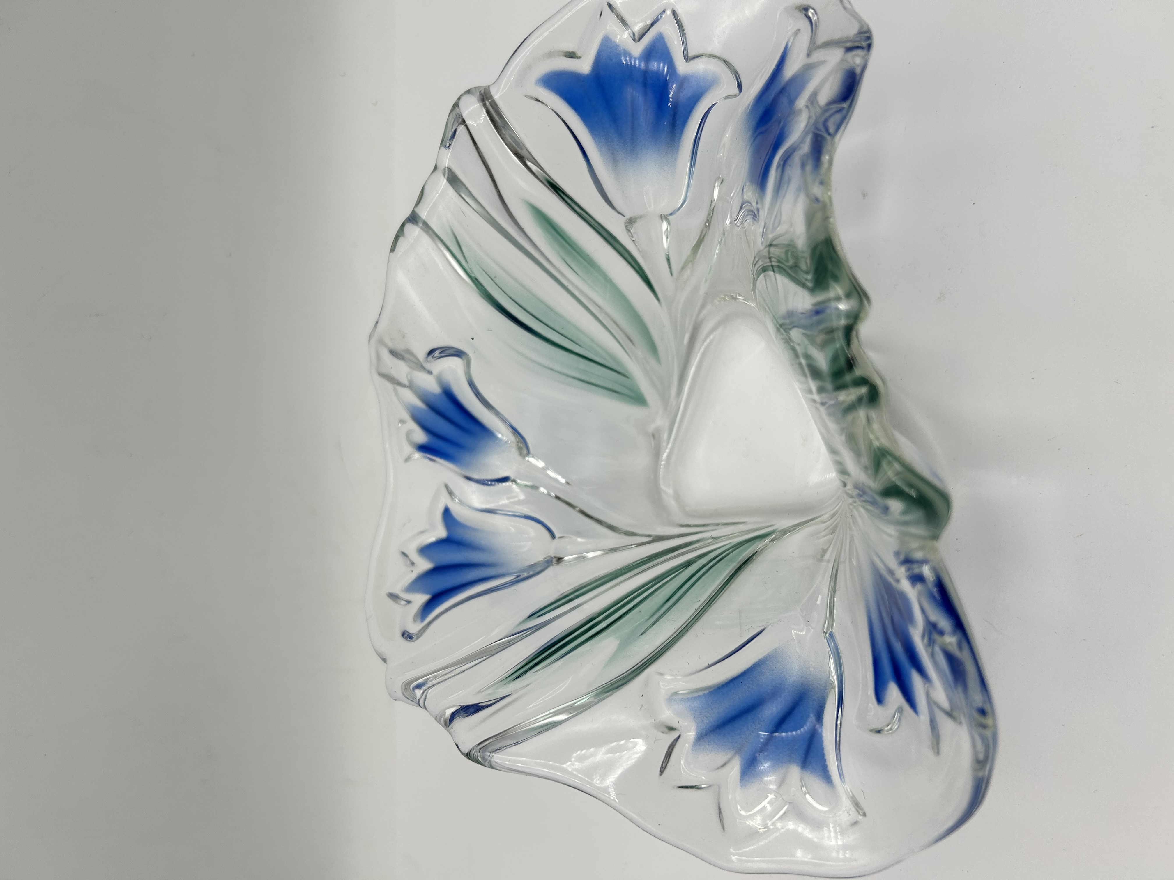 Attributed to Walther Glas in the Blue Bells pattern, this decorative bowl is constructed from clear moulded glass. The piece features a free-form undulating shape with a scalloped rim and a tri-lobed base. The decoration consists of a floral motif depicting blue bellflowers and green tapered leaves, visible from both the interior and exterior surfaces. The bowl displays an organic, stylised aesthetic. No maker’s marks or signatures are visible.