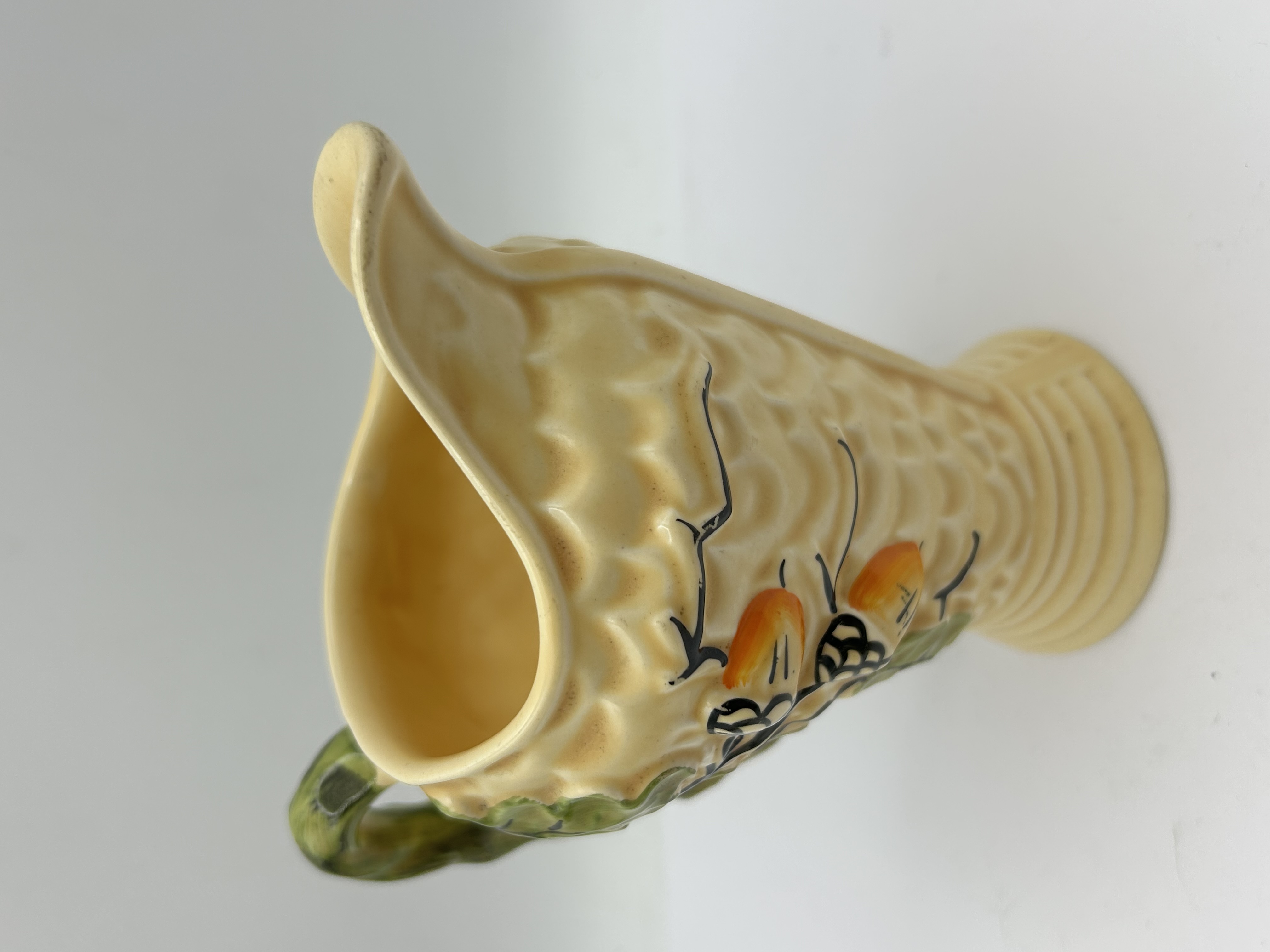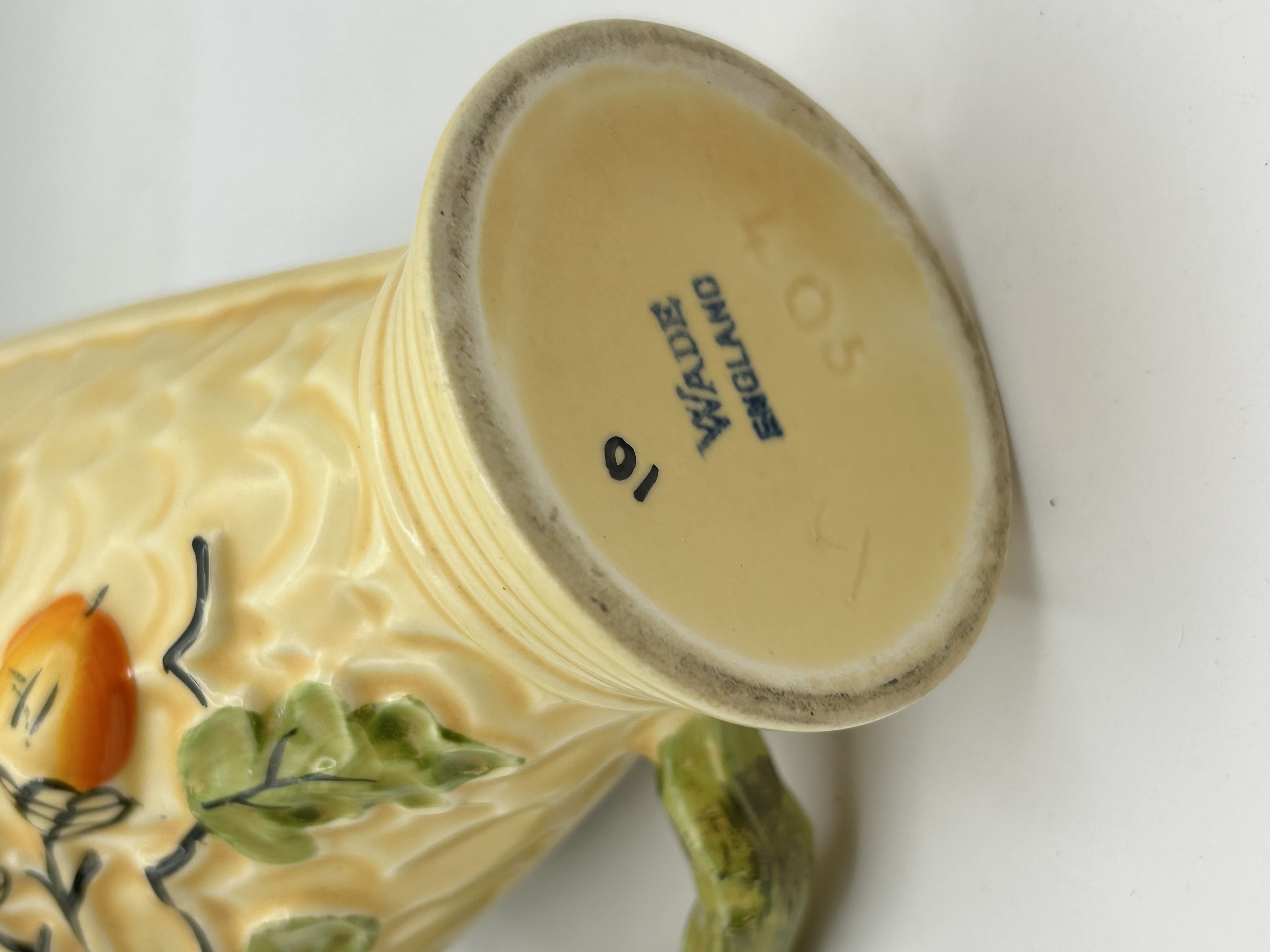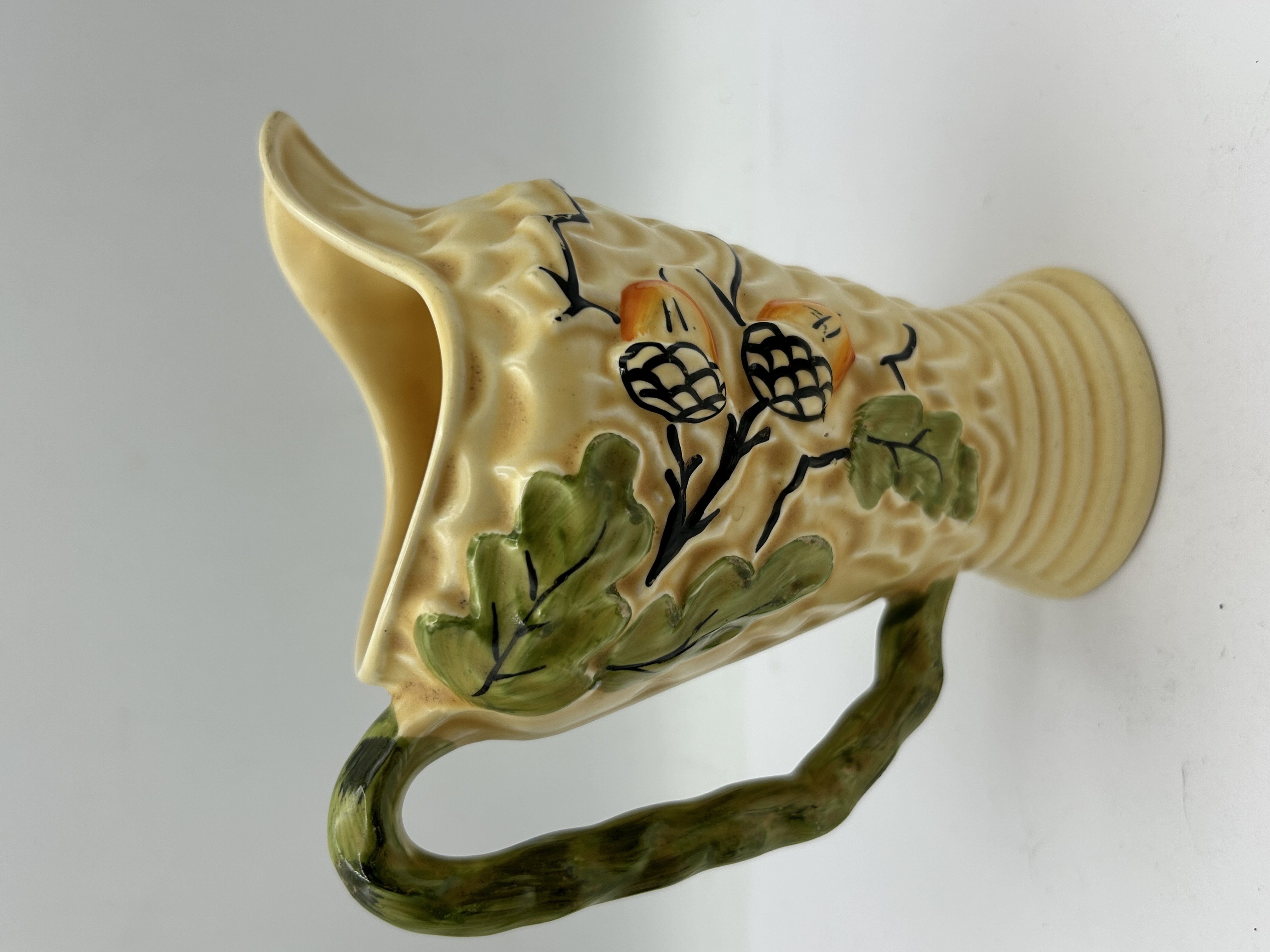 A mid-century glazed ceramic pitcher by Wade England featuring a textured honeycomb-style relief body in a cream glaze. The exterior is decorated with hand-painted motifs of green oak leaves and orange acorns on black branches, complemented by a rustic green branch-form handle. The vessel is designed with a flared, ridged base. The underside is marked with a blue WADE ENGLAND stamp, alongside the impressed shape number 105 and a hand-painted 16.