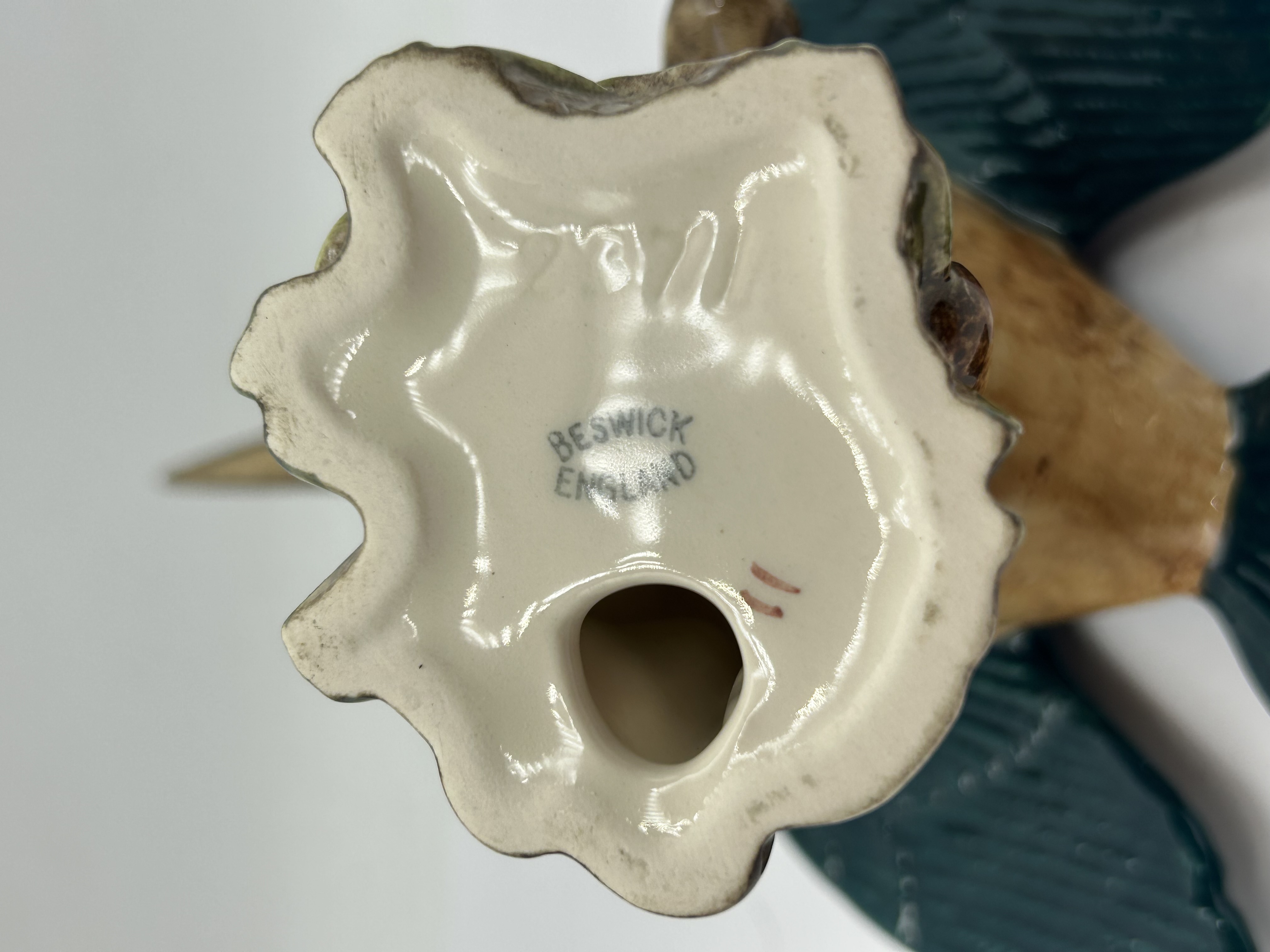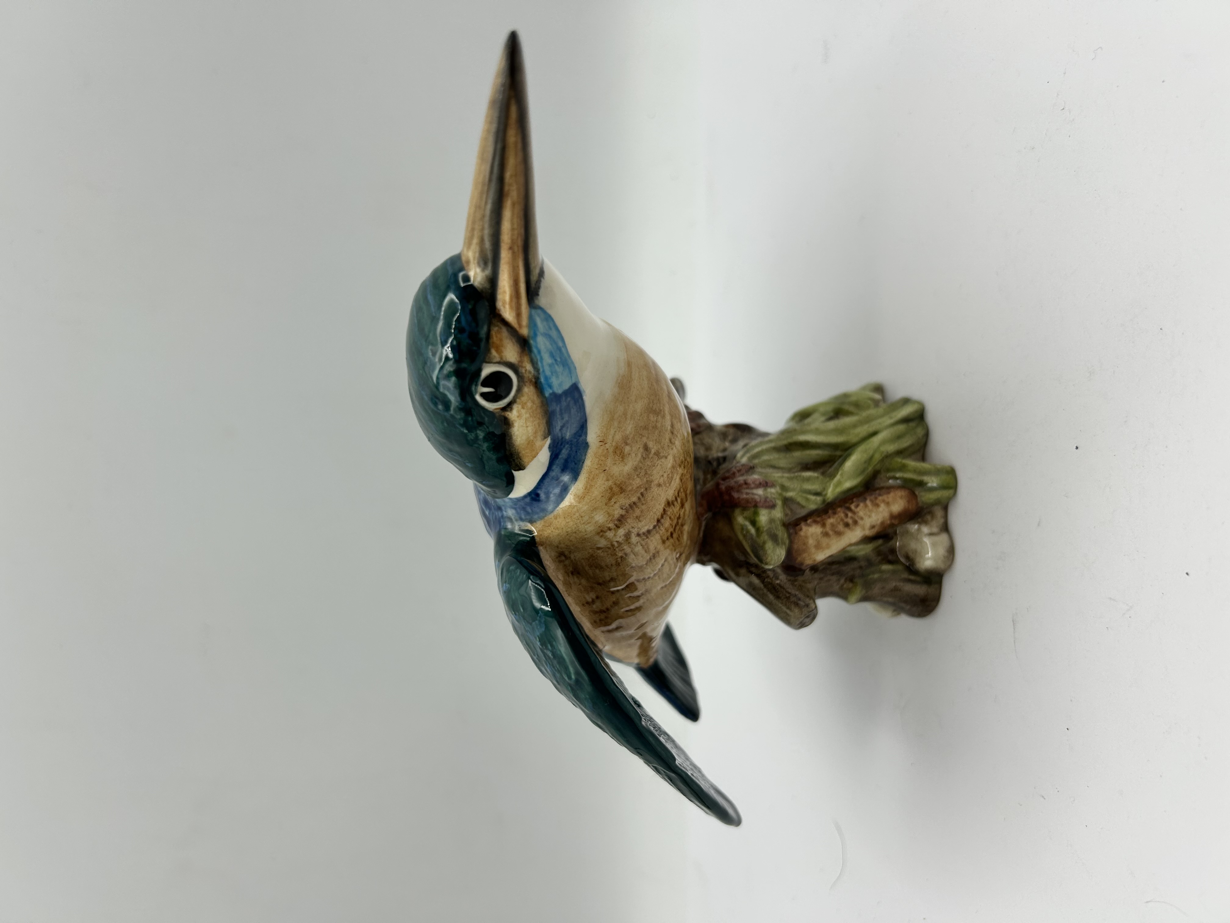 A Beswick ceramic figurine of a kingfisher, model number 2371. The bird is realistically modelled in a perched position upon a naturalistic base depicting marshland with green reeds and bulrushes. The figurine is decorated in polychrome glazes, with teal and blue plumage to the head and wings, an orange-brown breast, and a white throat, finished with a high-gloss glaze. The underside of the base features a blue printed backstamp reading BESWICK ENGLAND and an impressed model number 2371.