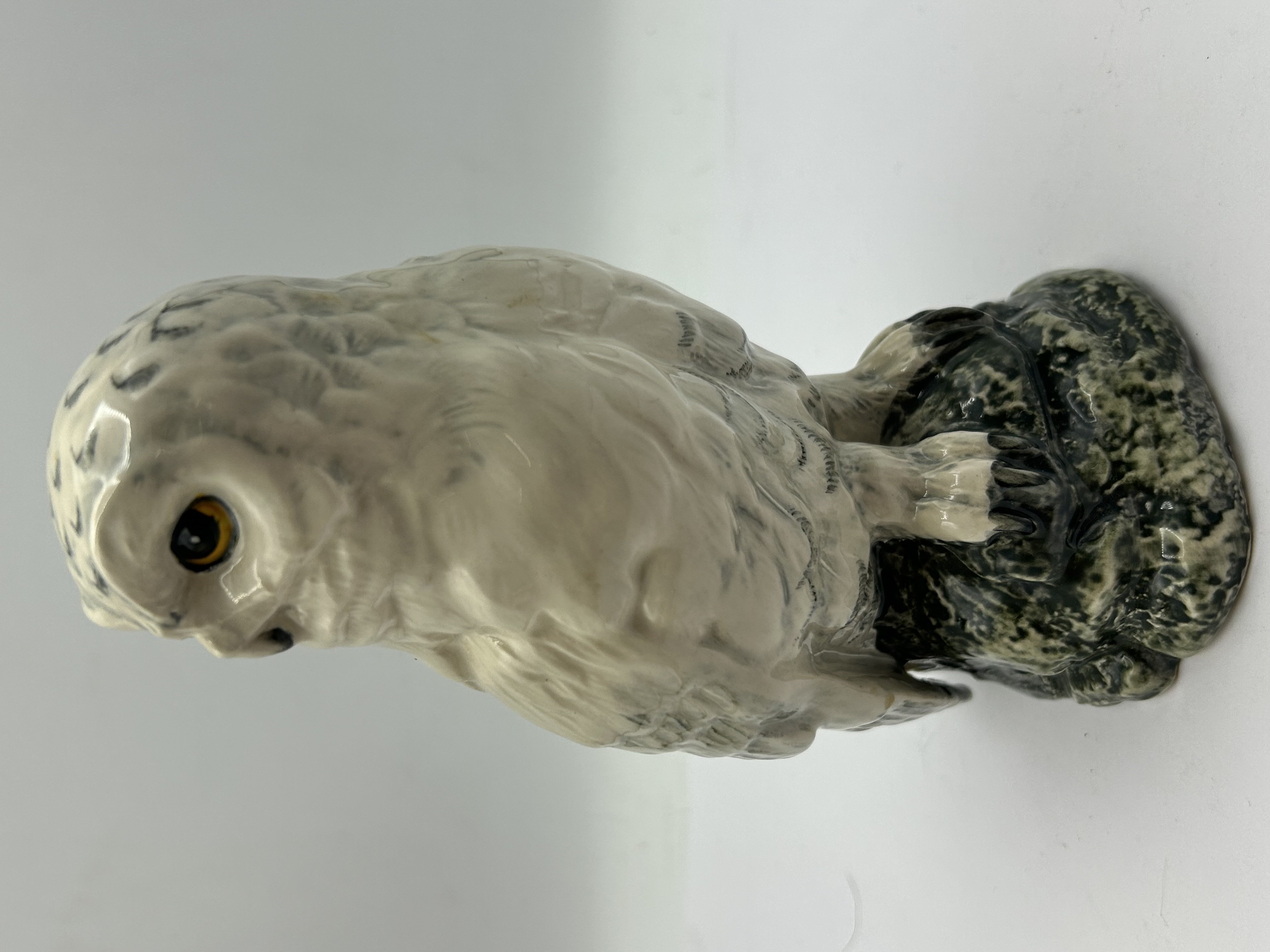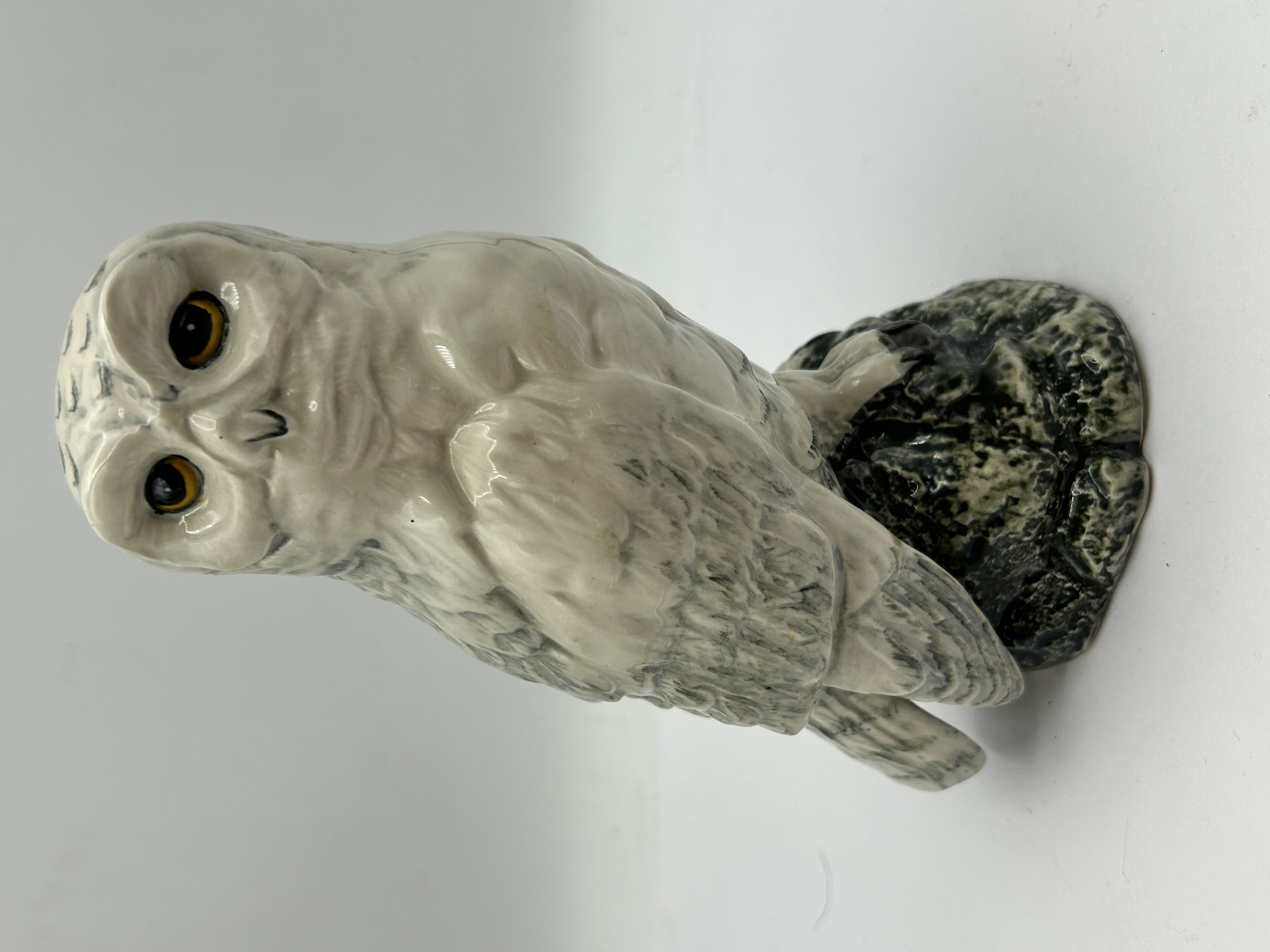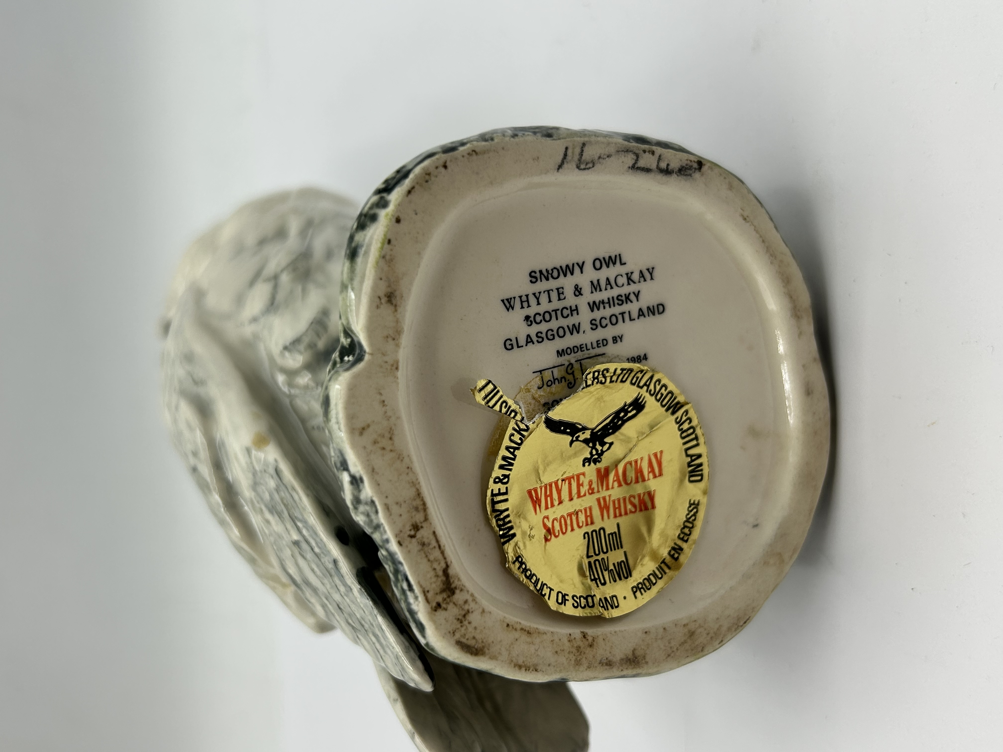 A Royal Doulton ceramic Snowy Owl whisky decanter produced for Whyte & Mackay, Glasgow. The figurine is realistically modelled and glazed, depicting a snowy owl with grey-flecked white plumage and yellow eyes, perched upon a mottled dark green and grey rock-form base. The underside is printed with the following information: Snowy Owl, Whyte & Mackay Scotch Whisky, Glasgow, Scotland, Modelled by John G. Tongue, 1984. The item retains a partially torn gold foil seal indicating a 200ml capacity and 40% vol. The underside also bears a handwritten ink reference number.