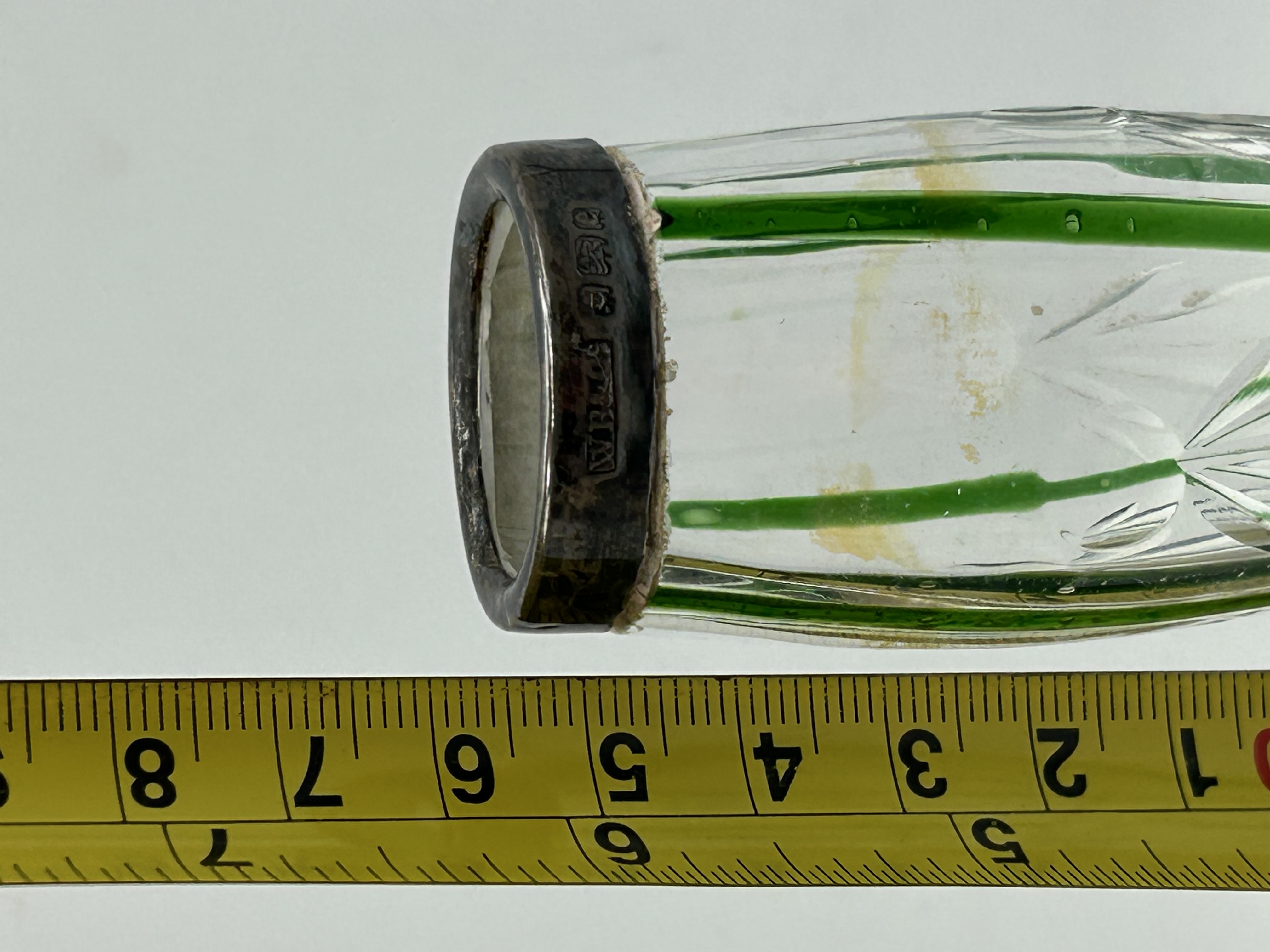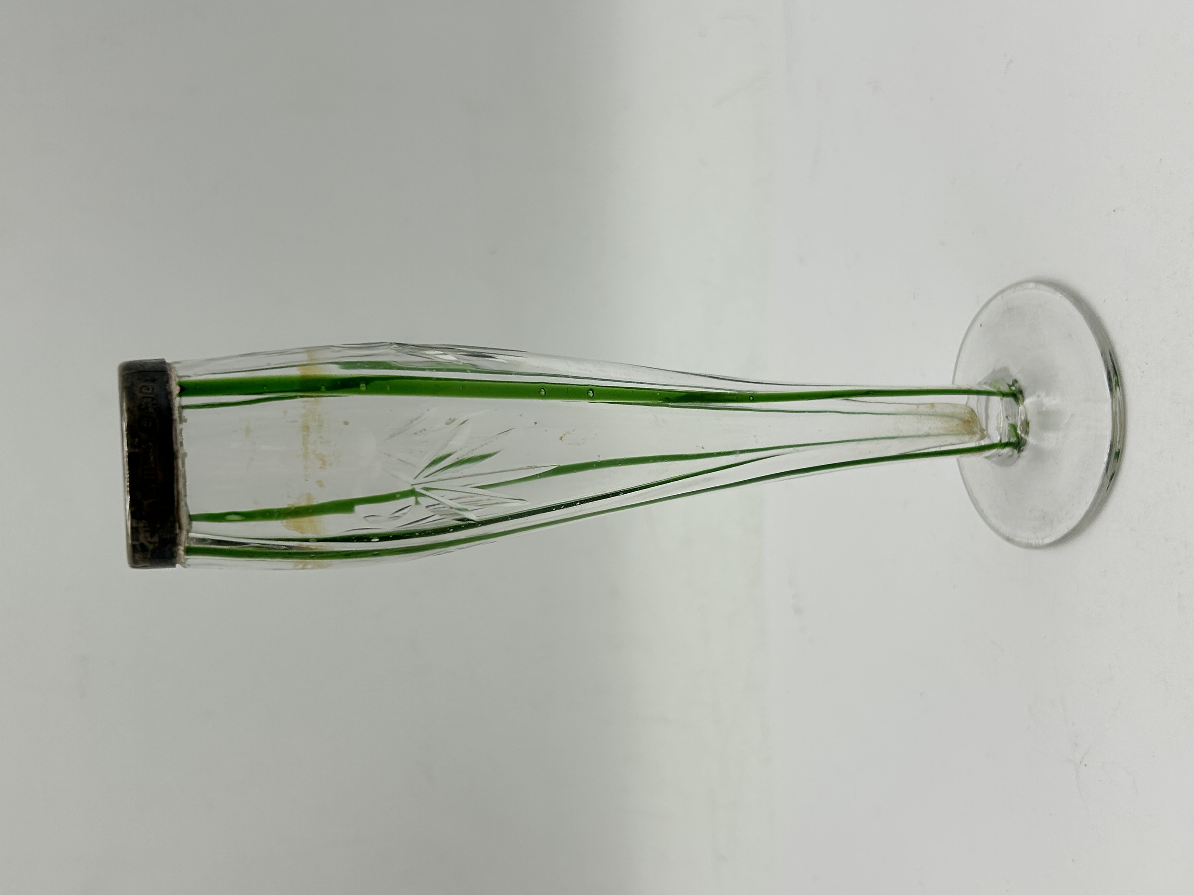 An Edwardian bud vase featuring a slender, tapered clear glass body decorated with vertical green trailing and faint etched floral patterns. The vessel rises from a circular foot to a hallmarked sterling silver collar. The silver rim is stamped with the maker’s mark WB&S for William Base & Sons, the lion passant for sterling silver, the leopard’s head for the London assay office, and a date letter. The style of the glass trailing is characteristic of Stourbridge glass houses of the early 20th century.