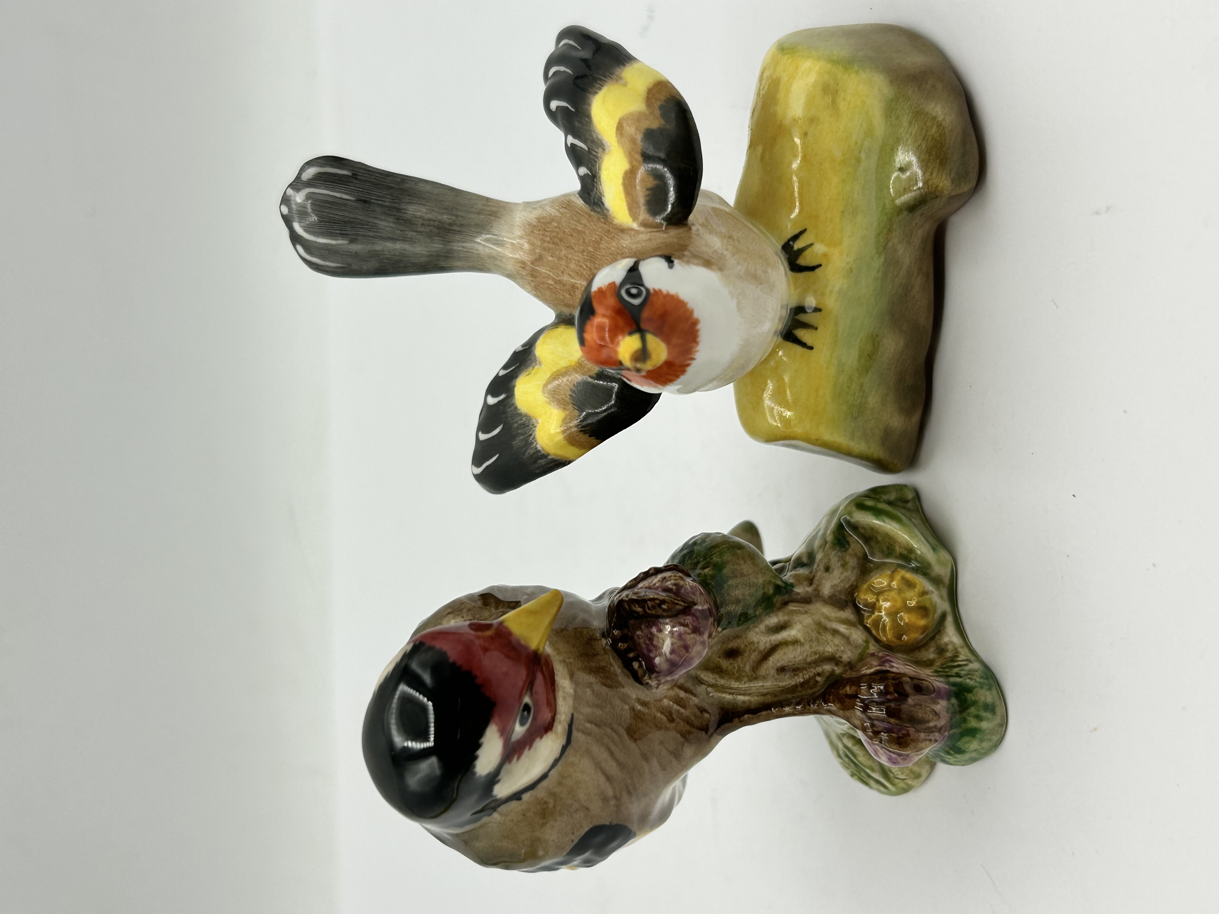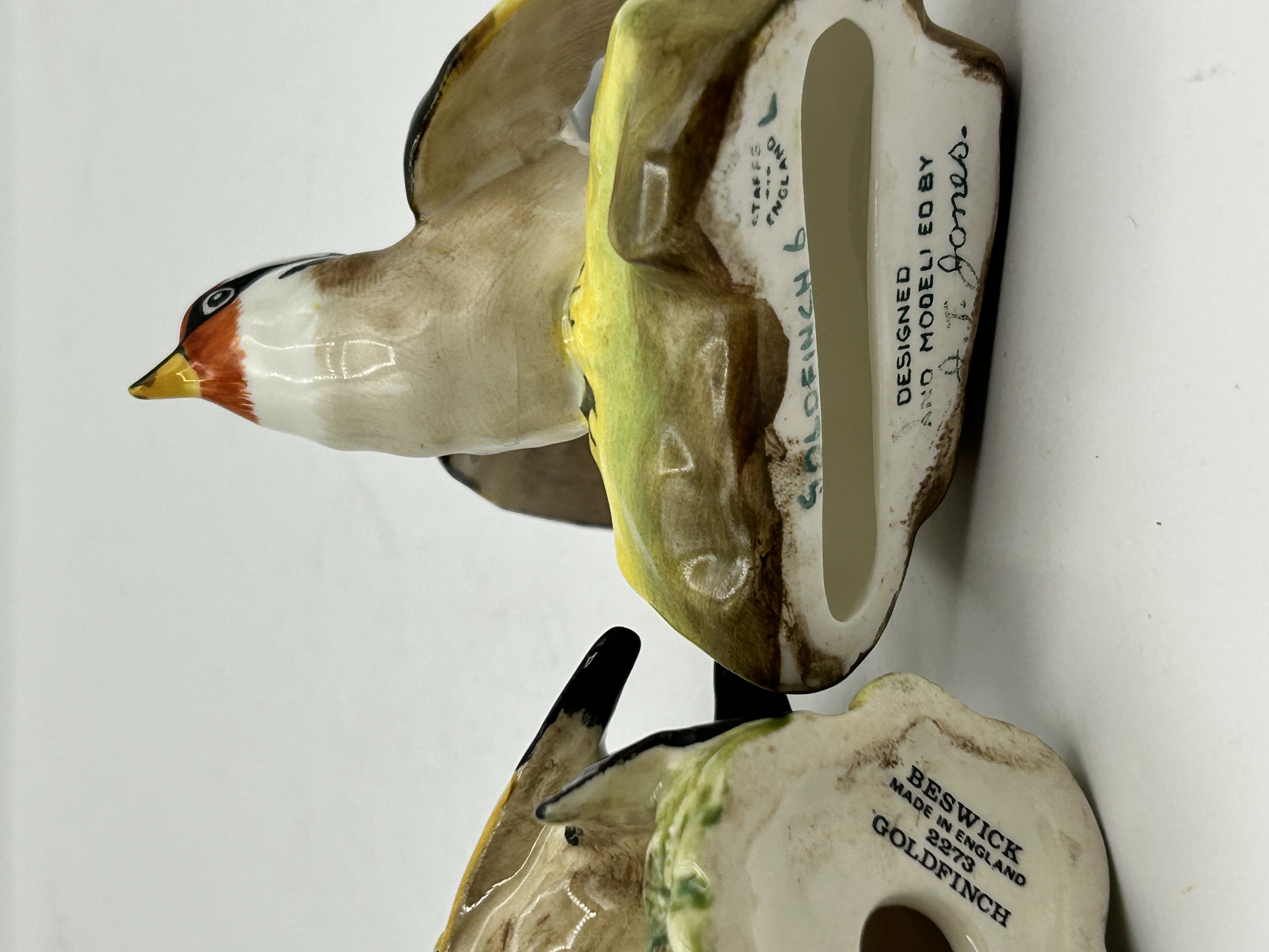 Two glazed porcelain bird figurines depicting European goldfinches. The first figurine is a Staffordshire production designed and modelled by J. T. Jones, featuring a goldfinch with wings partially spread, perched on a smooth, moss-green base. The underside is marked DESIGNED AND MODELLED BY J. T. Jones and STAFFS ENGLAND, with a handwritten GOLDFINCH 6. The second figurine is by Beswick, depicting a goldfinch perched on a textured branch adorned with purple thistles. The base is stamped BESWICK MADE IN ENGLAND 2273 GOLDFINCH. Both pieces are hand-painted with characteristic red facial markings and yellow-and-black wing patterns under a high-gloss glaze.