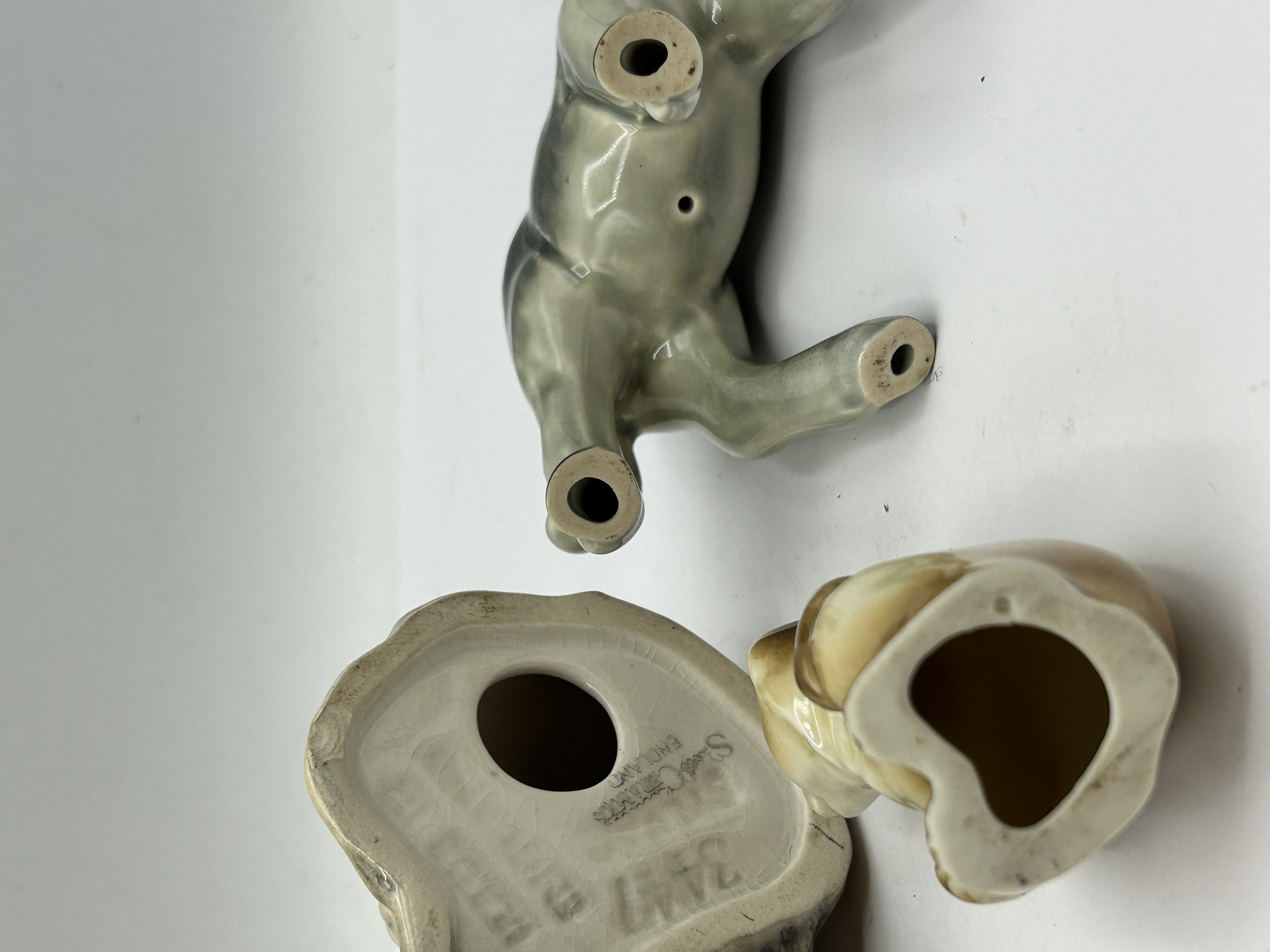 A trio of vintage glazed ceramic animal figurines, comprising a standing donkey, a terrier-type dog, and a small seated bear cub. The dog figurine is finished in a multi-tonal grey and tan glossy glaze and is marked on the underside with a SANDICRAFT ENGLAND stamp and an impressed model number 3441. The standing donkey and seated bear cub are unmarked but feature similar multi-tonal glazes in shades of grey and brown, consistent with the style of the marked piece. All three figurines exhibit the glossy finish and stylised forms characteristic of mid-century decorative pottery.