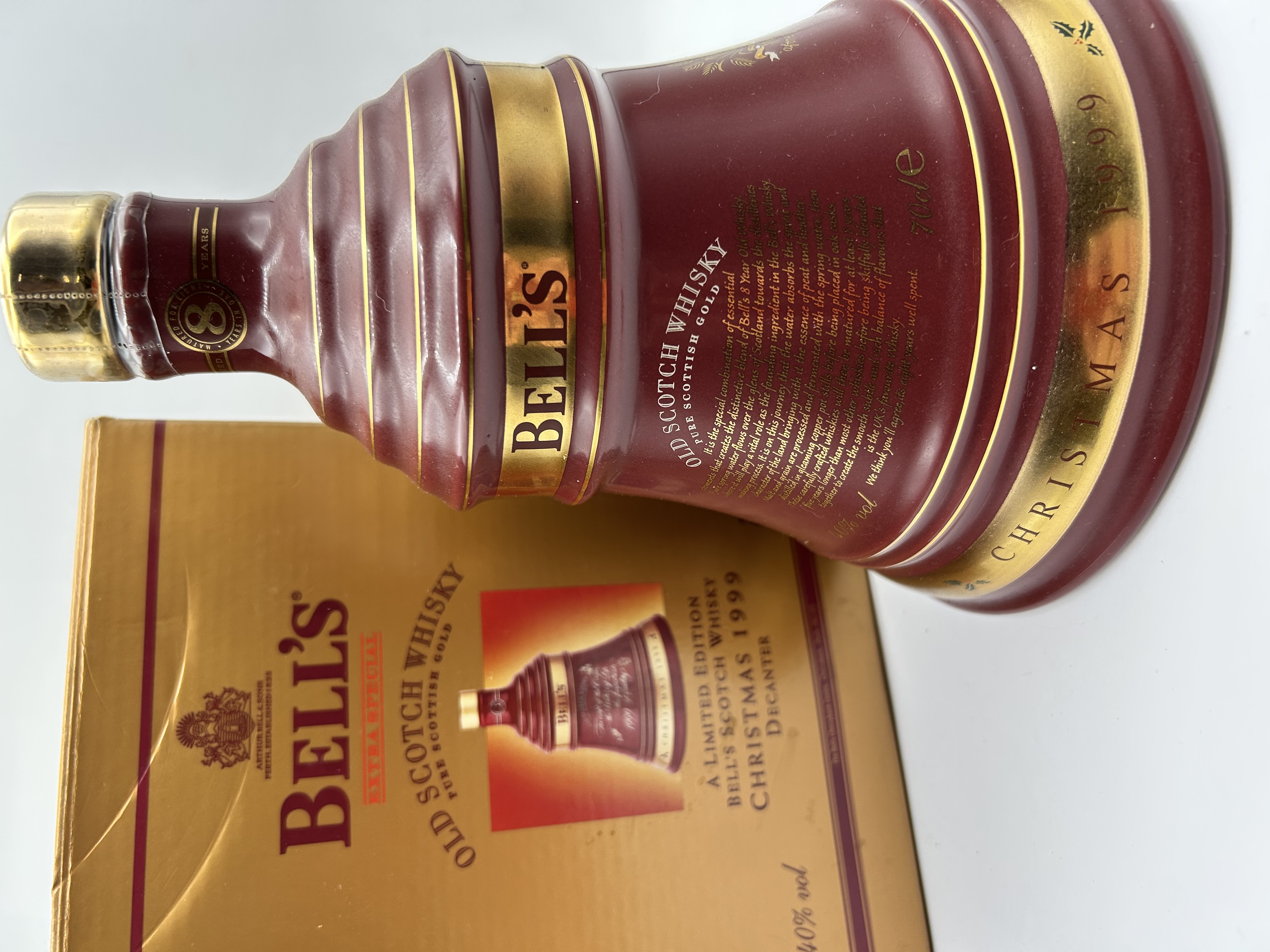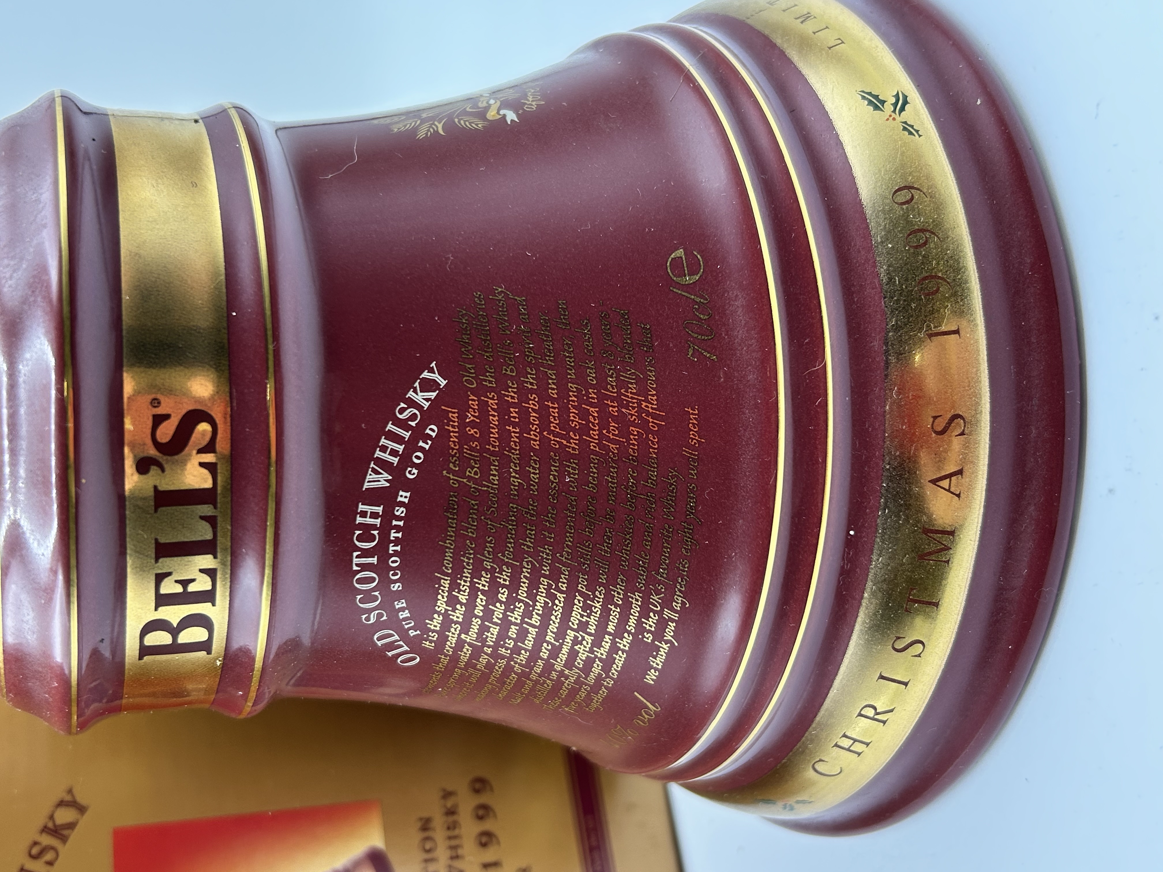 A Bell’s Christmas 1999 limited edition Scotch whisky ceramic decanter with its original presentation box. The bell-shaped decanter is finished in a maroon glaze with gold-tone banding and printed text. The body of the decanter bears the marks Bell’s, Old Scotch Whisky, Pure Scottish Gold, and Christmas 1999. It is labelled as 70cl with a 40% vol alcohol content. The vessel is topped with a gold-tone cap featuring a seal stating the whisky was matured for eight years. The accompanying gold-coloured cardboard box is marked A Limited Edition Bell’s Scotch Whisky Christmas 1999 Decanter and Arthur Bell & Sons.