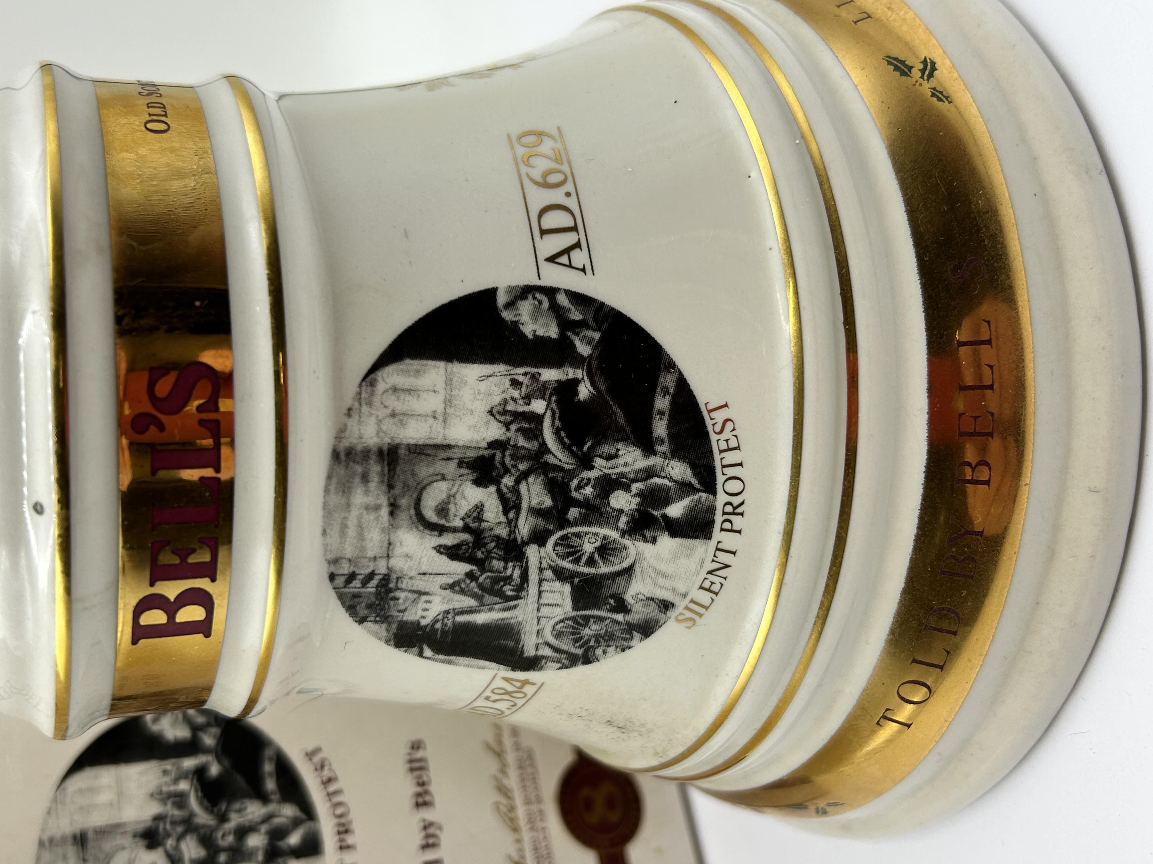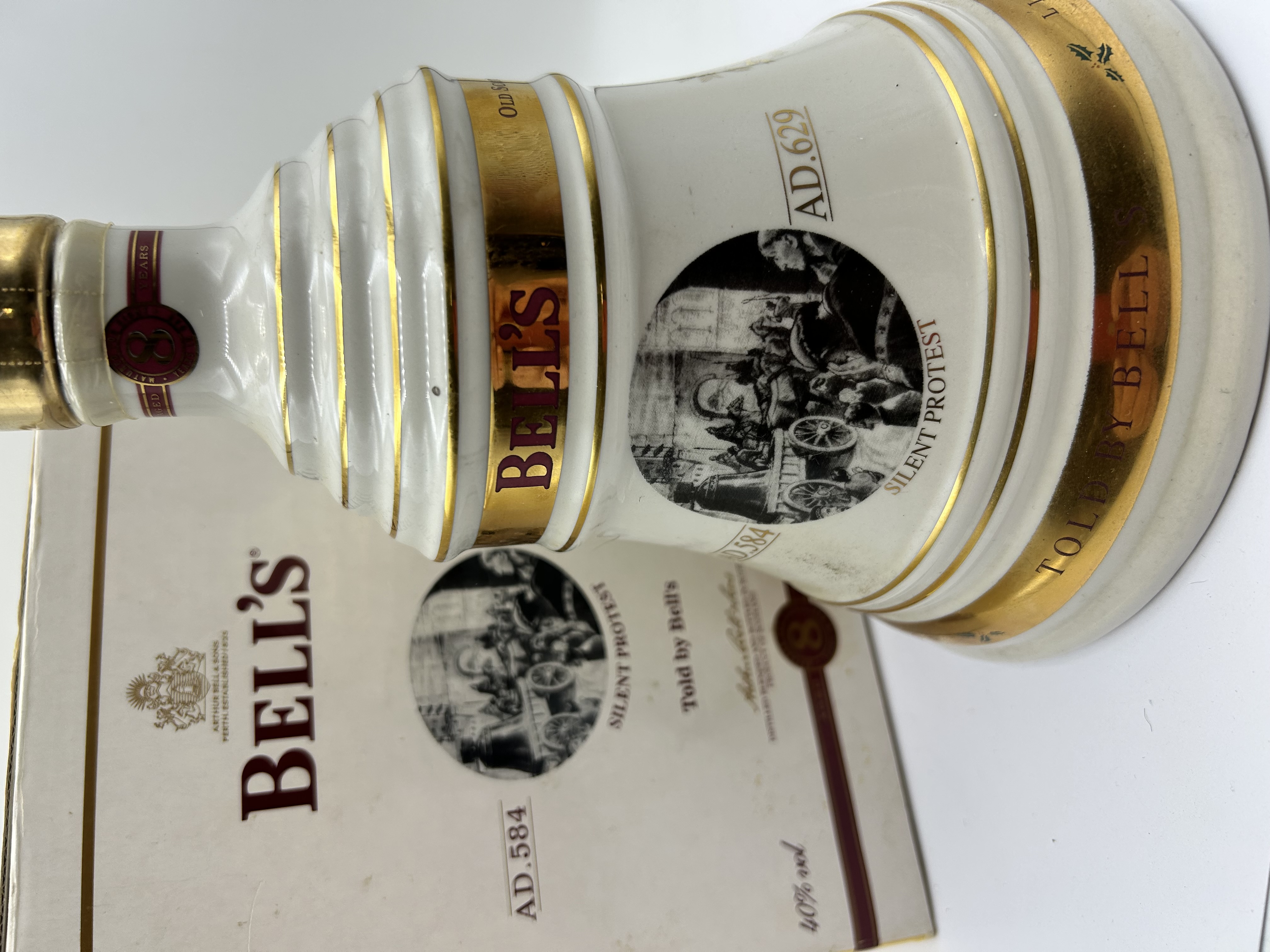 A ceramic bell-shaped decanter for Bell’s Old Scotch Whisky, presented with its original cardboard packaging. The white ceramic vessel features multiple gilt bands and a central monochrome circular illustration titled Silent Protest, flanked by the dates AD.584 and AD.629. The maker’s name Bell’s is printed in red on a major gilt band, and the base bears the gilt-printed text Told by Bell’s. The neck features a red seal with the number 8, denoting an 8-year-old aged spirit. The matching box repeats the Silent Protest motif and the maker’s name, also indicating an alcohol content of 40% vol.
