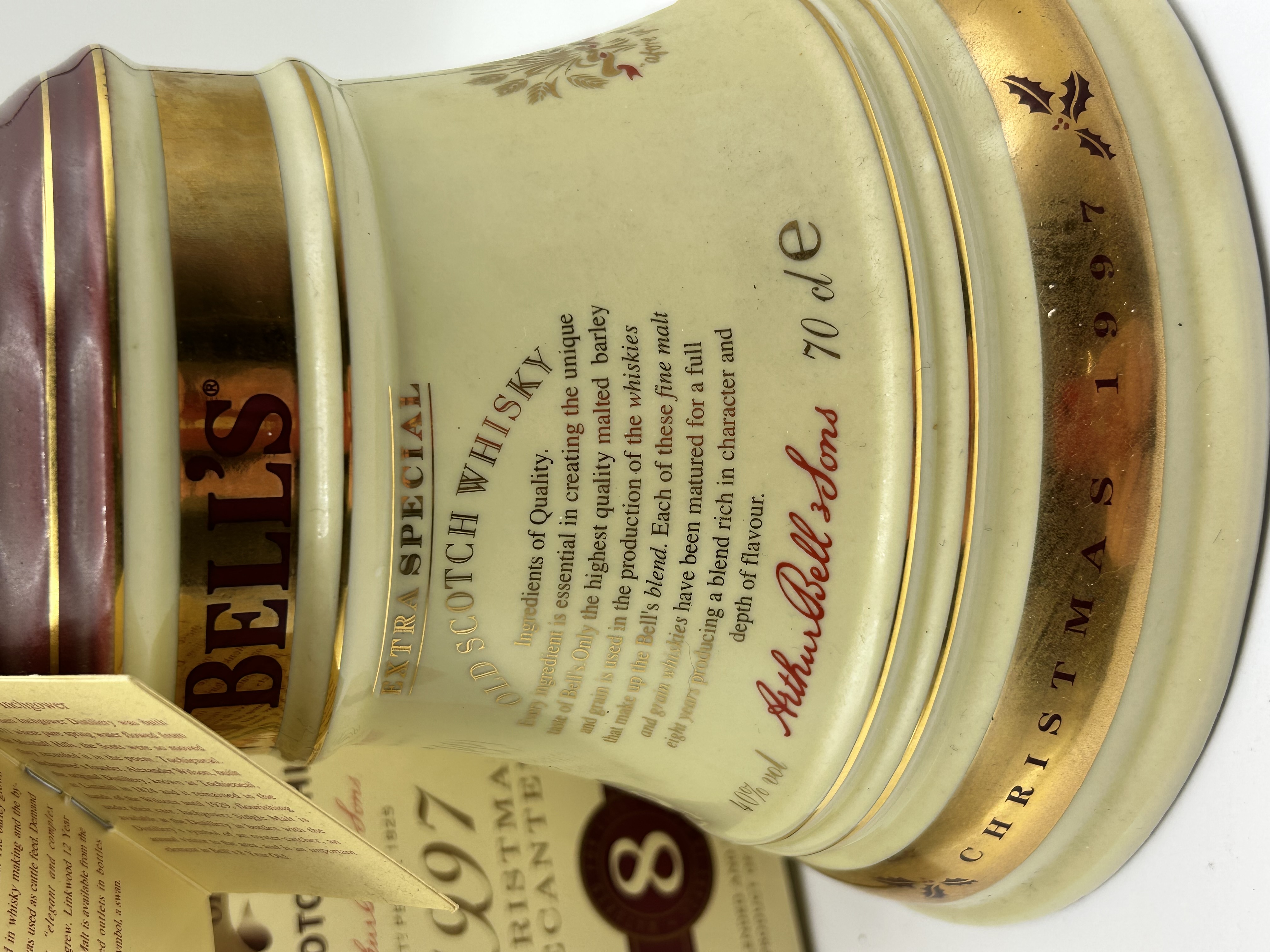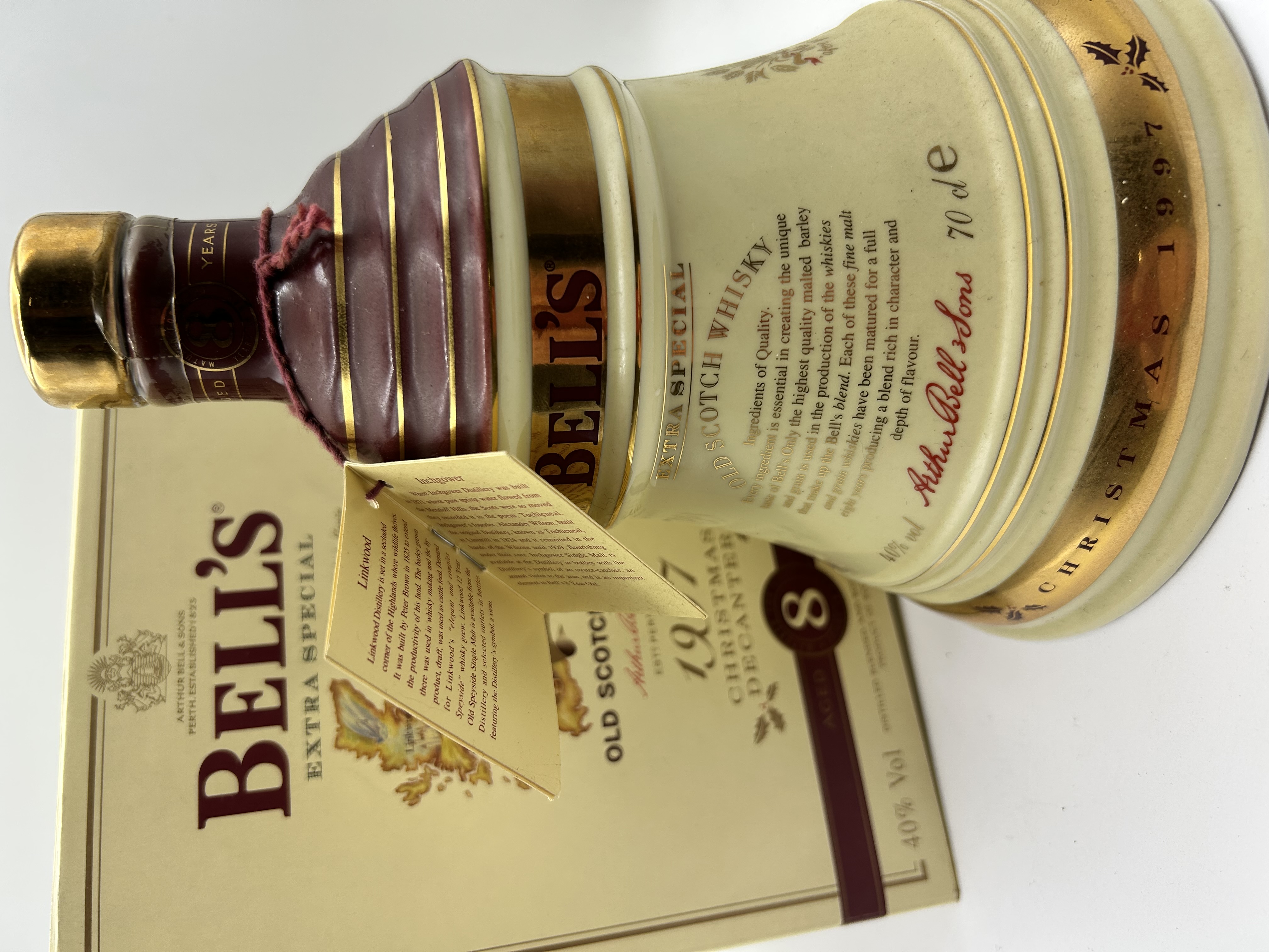 A 70cl ceramic bell-shaped decanter of Bell’s Extra Special Old Scotch Whisky, produced for Christmas 1997 by Arthur Bell & Sons. The decanter features a cream-coloured body with gold-toned banding and a deep burgundy neck. The central gold band is printed with the name BELLS, with EXTRA SPECIAL above and CHRISTMAS 1997 on the base rim interspersed with holly leaf motifs. Additional printed text on the body includes OLD SCOTCH WHISKY, 40% vol, Arthur Bell & Sons, and 70 cl e. The item is accompanied by its original cardboard informational tag detailing the Linkwood and Inchgower distilleries, and its original cardboard presentation box which specifies the whisky is aged 8 years. The decanter remains sealed with a gold-toned cap and red cord.