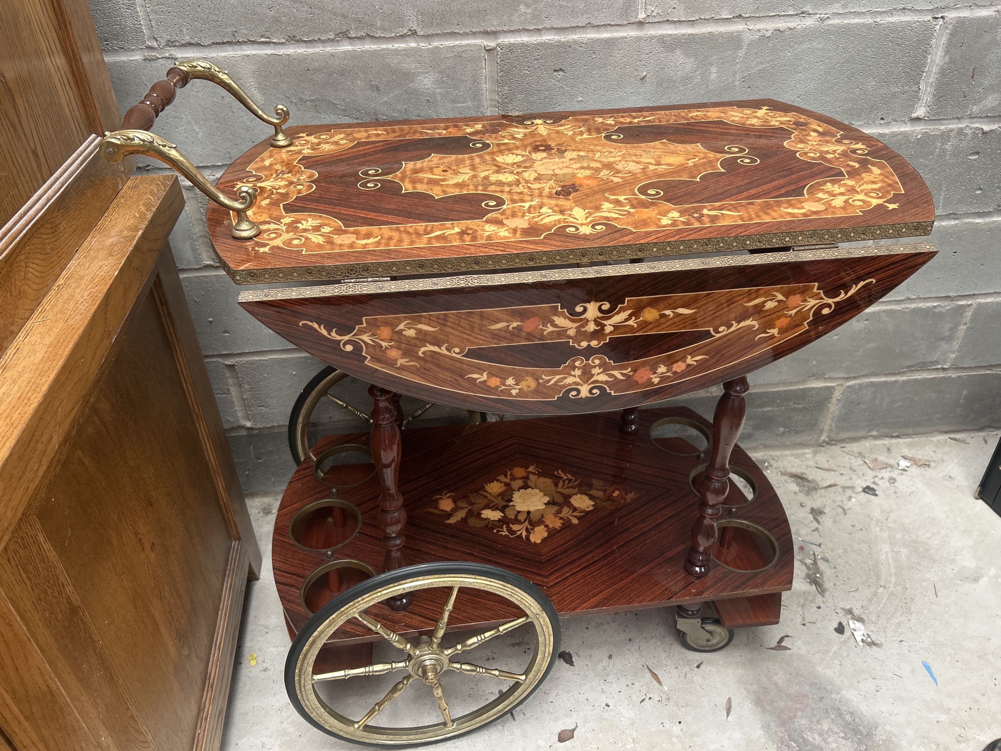 An Italian style marquetry inlaid drinks trolley, dating to the mid-20th century. The piece is constructed with mahogany-toned wood veneers featuring light-coloured floral and foliate marquetry inlays, characteristic of the Sorrento style. The two-tier design features a drop-leaf top with two semi-elliptical leaves that create an oval surface when extended. The top tier is finished with a pierced brass gallery. The lower tier, joined by four turned wooden supports, includes a central floral marquetry spray and is fitted with six brass-toned circular bottle holders. Mobility is provided by a pair of large, spoked, brass-finished wheels at the front and two small swivel casters at the rear. A double-arm brass handle with a central turned wooden grip is mounted to one side. The item is presented in as found condition.