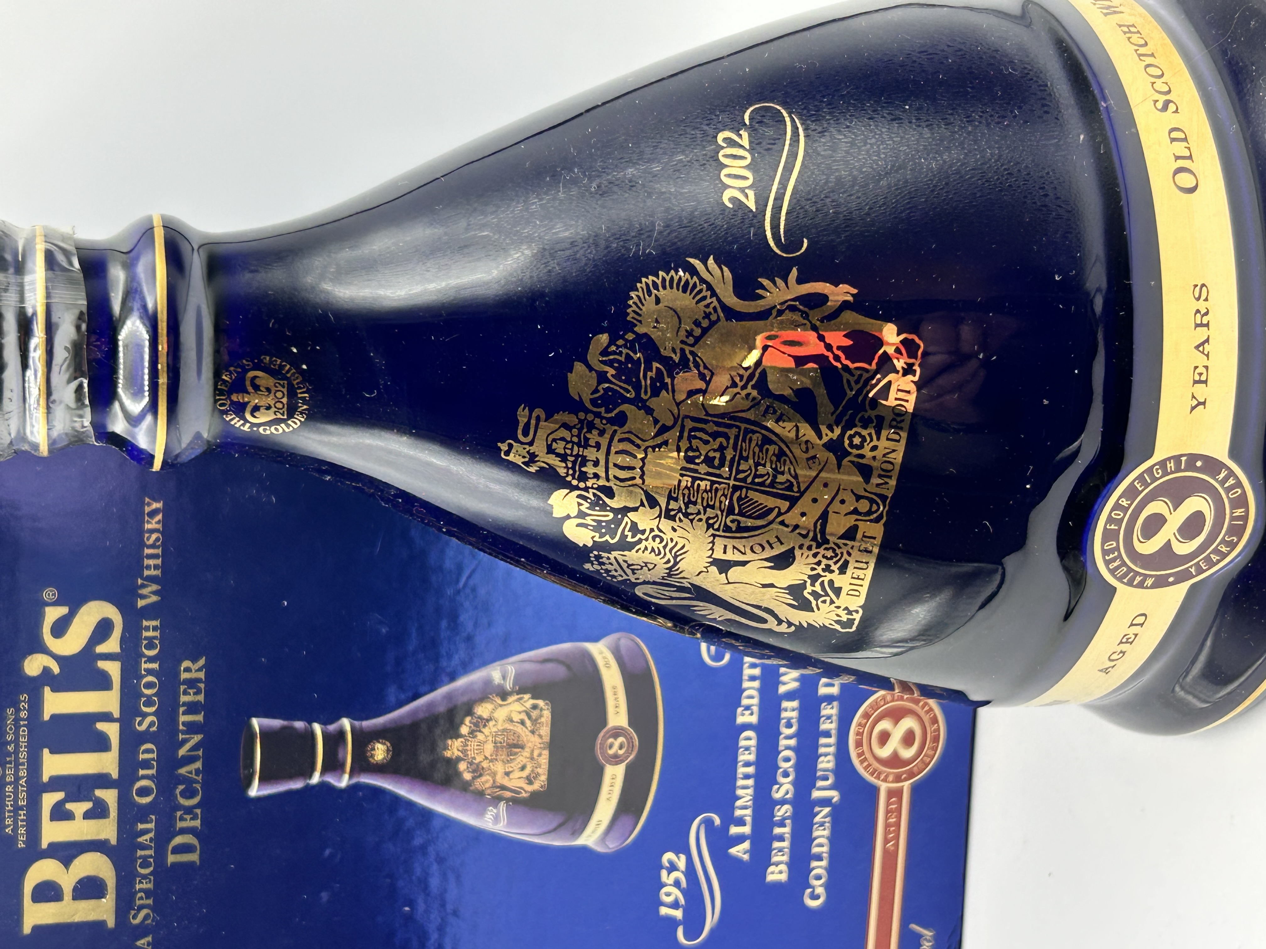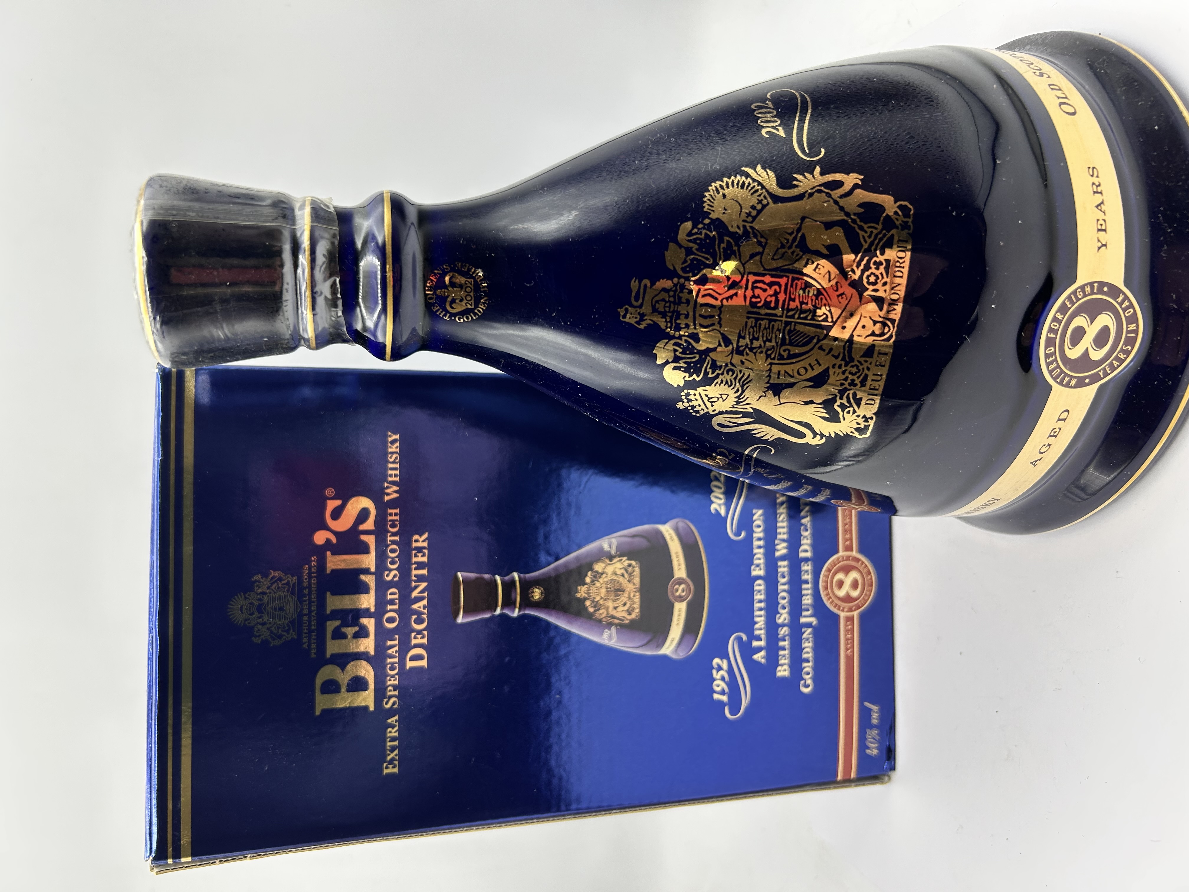 A limited edition commemorative ceramic decanter of Bell’s Extra Special Old Scotch Whisky, produced to celebrate the Golden Jubilee of Queen Elizabeth II (1952-2002). The bell-shaped decanter is finished in a cobalt blue glaze with gilt decoration. The body features the Royal Coat of Arms, while the shoulder bears a circular mark inscribed THE QUEEN’S GOLDEN JUBILEE 2002 and the year 2002. A gold-toned band at the base is inscribed OLD SCOTCH WHISKY, AGED 8 YEARS, and MATURED FOR EIGHT YEARS IN OAK. The item is presented in its original blue cardboard box, which features the text ARTHUR BELL & SONS, PERTH, ESTABLISHED 1825, BELL’S, and EXTRA SPECIAL OLD SCOTCH WHISKY DECANTER. The box also indicates a strength of 40% vol.