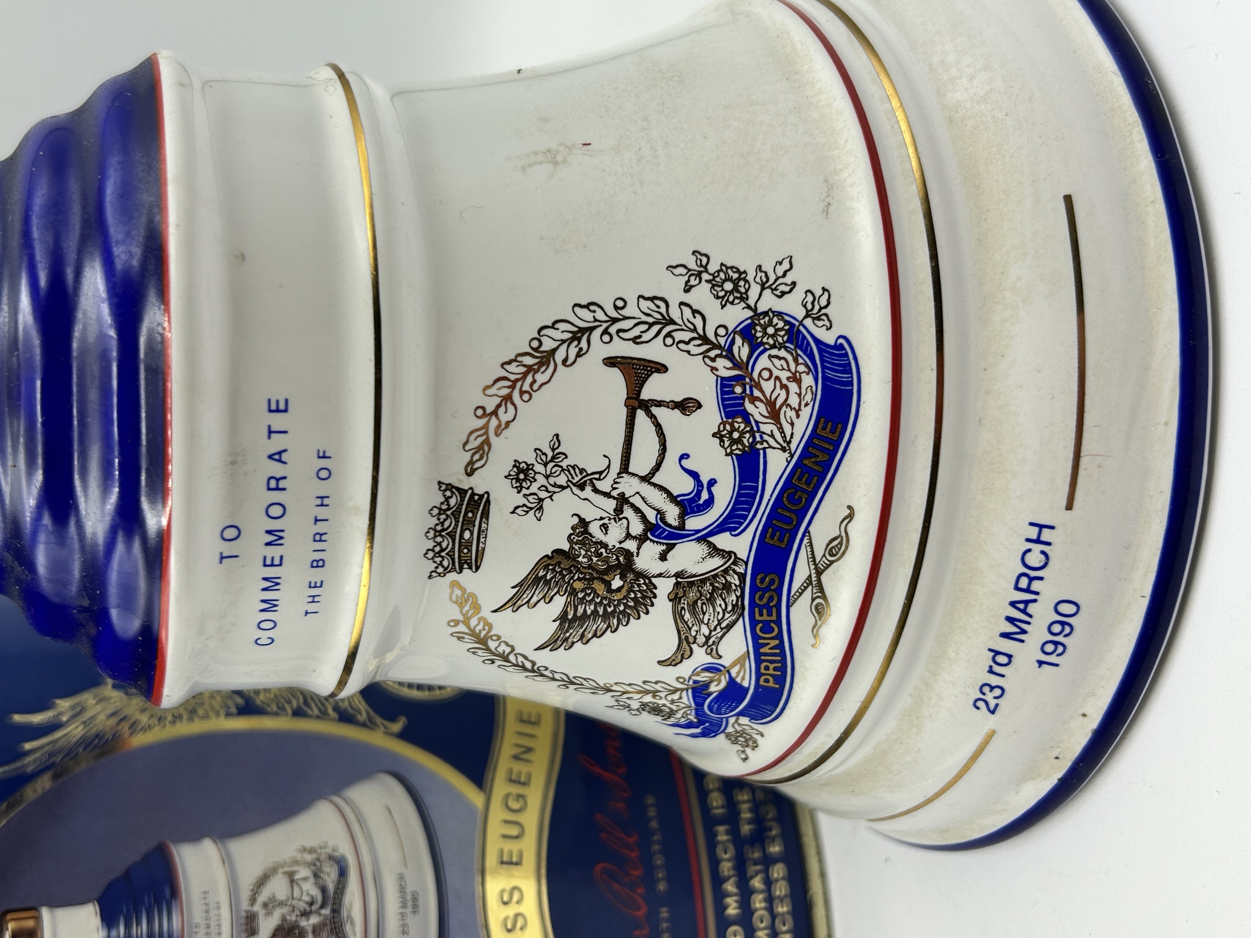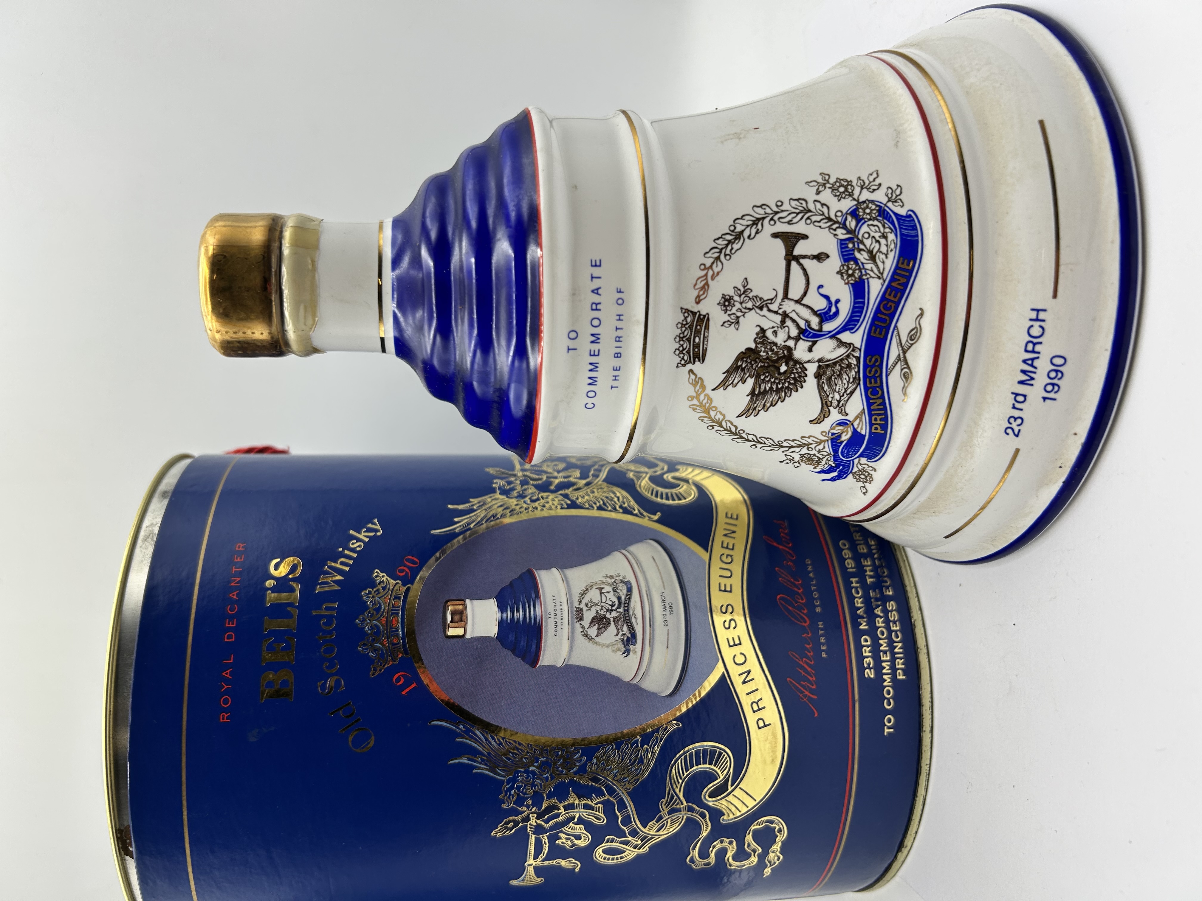 A Bell’s Old Scotch Whisky commemorative ceramic decanter produced to mark the birth of Princess Eugenie on 23rd March 1990. The bell-shaped decanter is constructed from white glazed ceramic featuring cobalt blue ribbing at the neck and gilt highlights. The body is decorated with a polychrome illustration of a winged cherub and bears the printed inscriptions TO COMMEMORATE THE BIRTH OF, PRINCESS EUGENIE, and 23rd MARCH 1990. The decanter retains its gold-toned stopper which is factory sealed with a clear plastic wrap. The accompanying blue cylindrical metal presentation tin is printed with the text BELL’S Old Scotch Whisky, Arthur Bell & Sons PERTH SCOTLAND, and matching commemorative details. Based on web consensus, the decanter contains 75cl of whisky at 43% ABV.