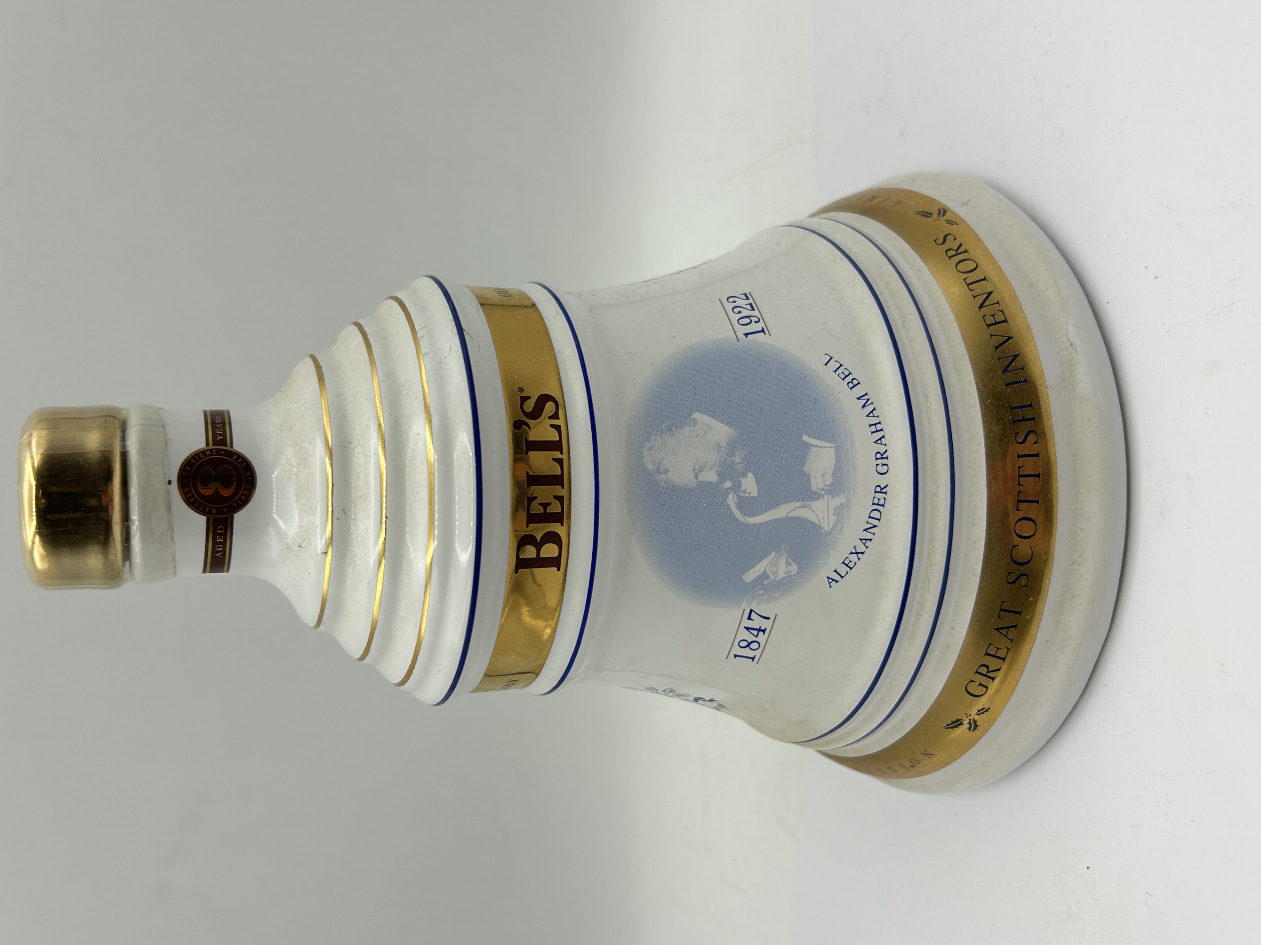 A ceramic bell-shaped decanter produced for Bell’s Blended Scotch Whisky. The vessel is finished in a white glaze with gilt-banded accents and blue-toned transfer-printed decoration. The body features a circular portrait of Alexander Graham Bell, flanked by the dates 1847 and 1922. A central gold band is printed with the brand name BELL’S, while a lower gold band bears the inscription GREAT SCOTTISH INVENTORS. The neck retains a paper seal indicating the contents were aged for 8 years. The item is topped with a gold-toned stopper. This decanter is part of a series celebrating notable Scottish figures.