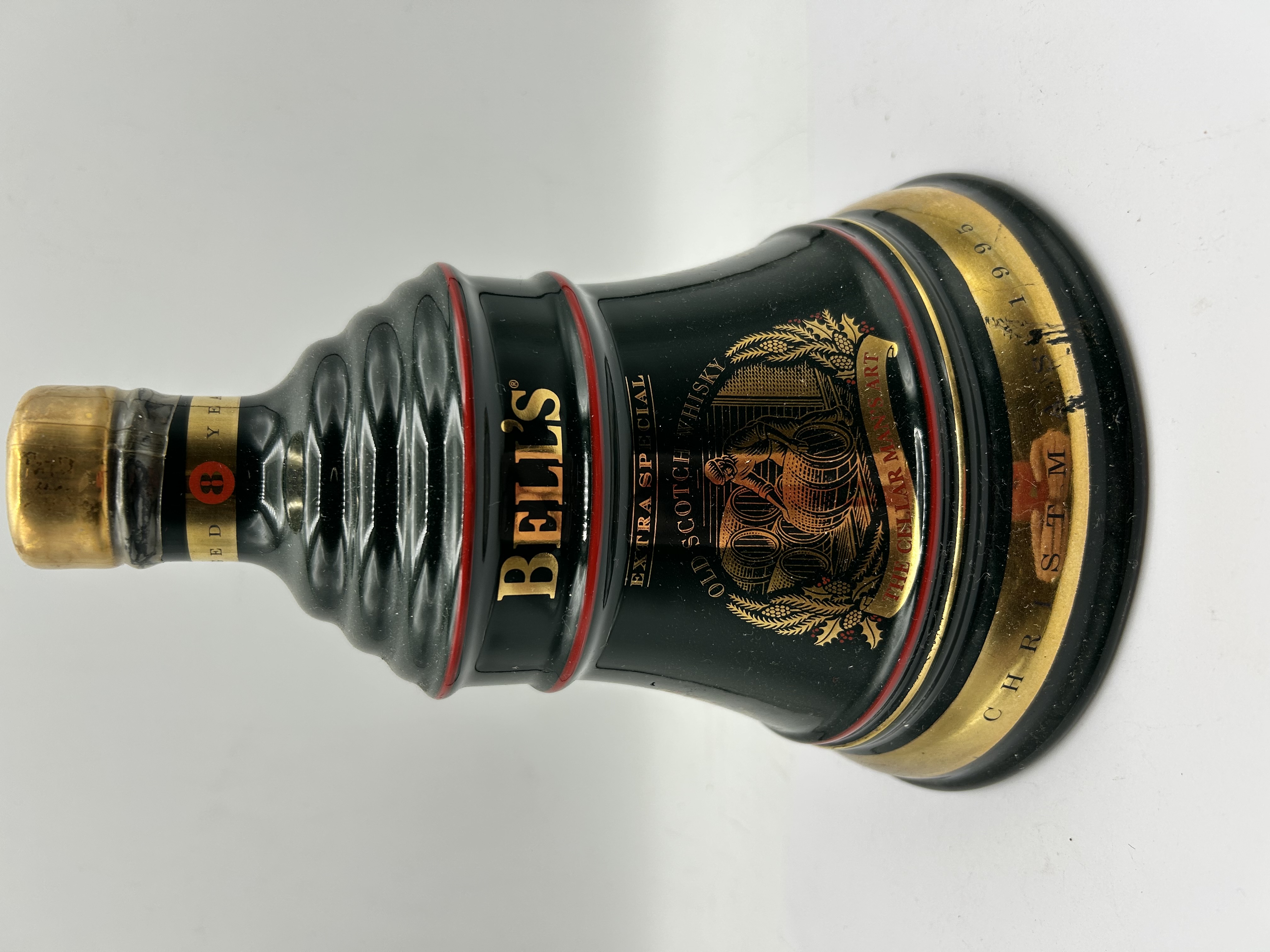 A limited edition ceramic decanter of Bell’s Extra Special Old Scotch Whisky, released for Christmas 1995. This release is titled The Cellarman’s Art and contains blended Scotch whisky aged for 8 years. The decanter is made of dark green glazed ceramic in a bell-shaped form. The body features a central graphic depicting a cellarman with barrels, titled The Cellarman’s Art, alongside the text Bell’s Extra Special Old Scotch Whisky. A gold-tone band around the base is inscribed Christmas 1995. The neck features a label with a red circular emblem stating 8 Aged Years.
