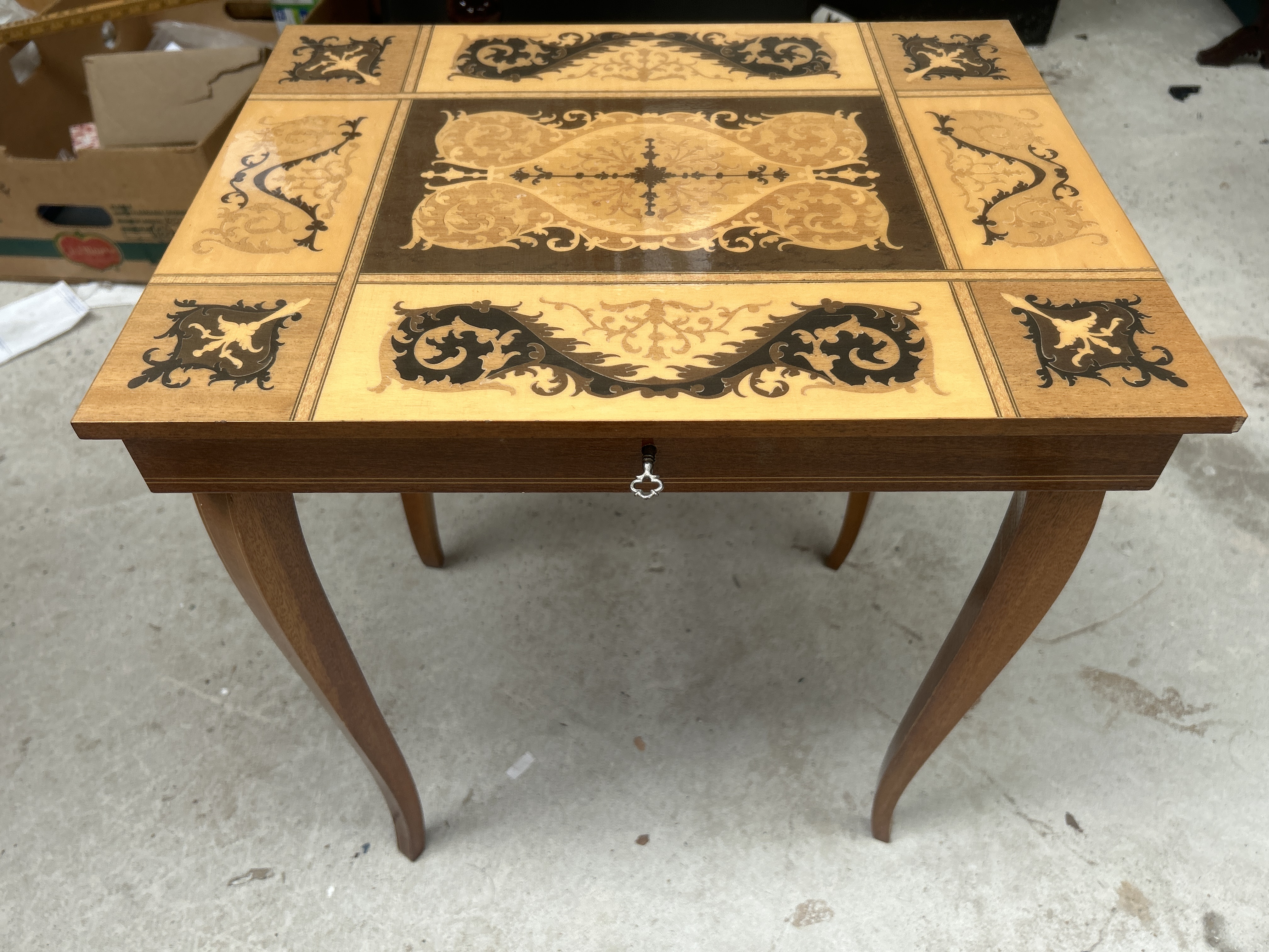 A mid-20th-century Italian side table in the Sorrento style, featuring a rectangular top decorated with intricate multi-wood marquetry and parquetry. The veneered top is divided into nine distinct panels, each containing scrolling foliate, arabesque, and fleur-de-lis motifs in contrasting light and dark wood veneers. The table is supported by four slender cabriole legs. The front frieze includes a central keyhole with the associated key present, typically indicating an internal musical movement or jewellery compartment. The body and legs are finished in a warm-toned wood, possibly walnut or fruitwood, with a high-gloss lacquer to the top surface.