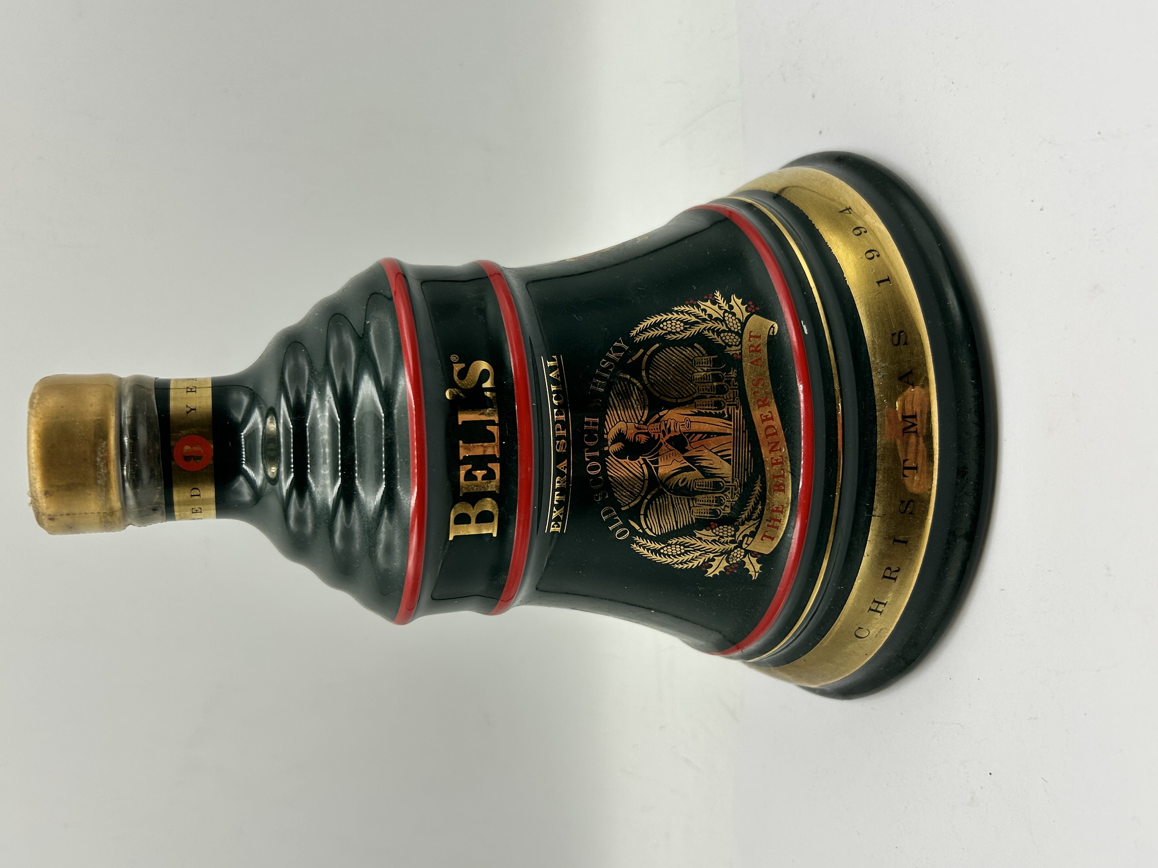 A commemorative ceramic decanter for Bell’s Extra Special Old Scotch Whisky, released as the Christmas 1994 edition. The vessel is bell-shaped and finished in a dark green glaze with decorative red and gold banding. The body features printed gold lettering for BELL’S EXTRA SPECIAL OLD SCOTCH WHISKY and THE BLENDER’S ART, with the base further inscribed CHRISTMAS 1994. The decanter is topped with a gold-toned stopper and an intact seal which reads AGED 8 YEARS. Market consensus for this specific release indicates a volume of 70cl and an alcohol content of 40% ABV.