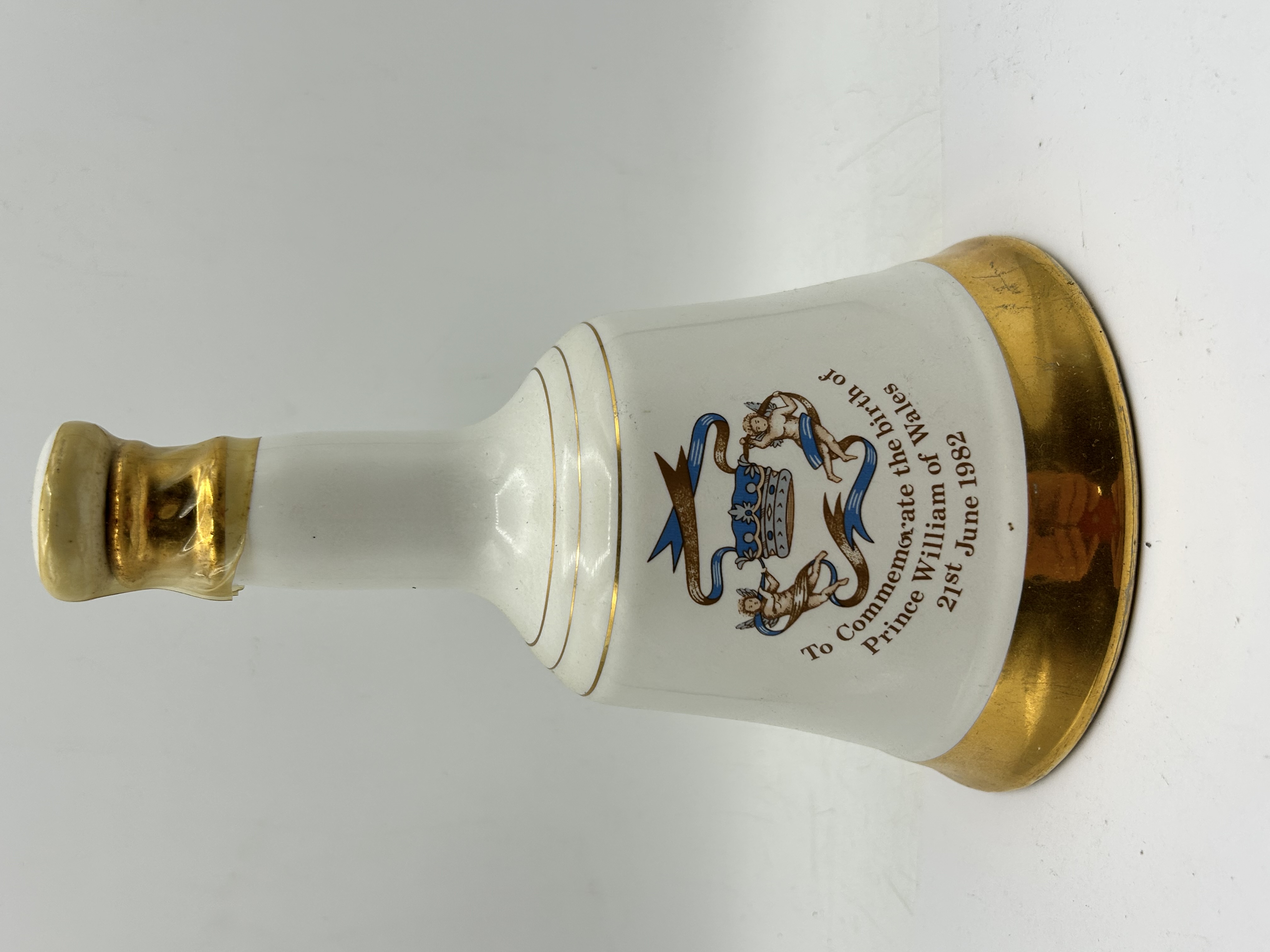 A white porcelain commemorative decanter produced by Wade for Bell’s Scotch Whisky to mark the birth of Prince William of Wales. The bell-shaped vessel features a printed heraldic design to the front, depicting a crown flanked by two cherubic figures and blue ribbons. It bears the printed inscription To Commemorate the birth of Prince William of Wales 21st June 1982. The construction includes a broad, heavily gilded base and gold-tone bands around the tapering neck. The top is finished with a gold-coloured seal which appears to be intact, suggesting the contents remain sealed.