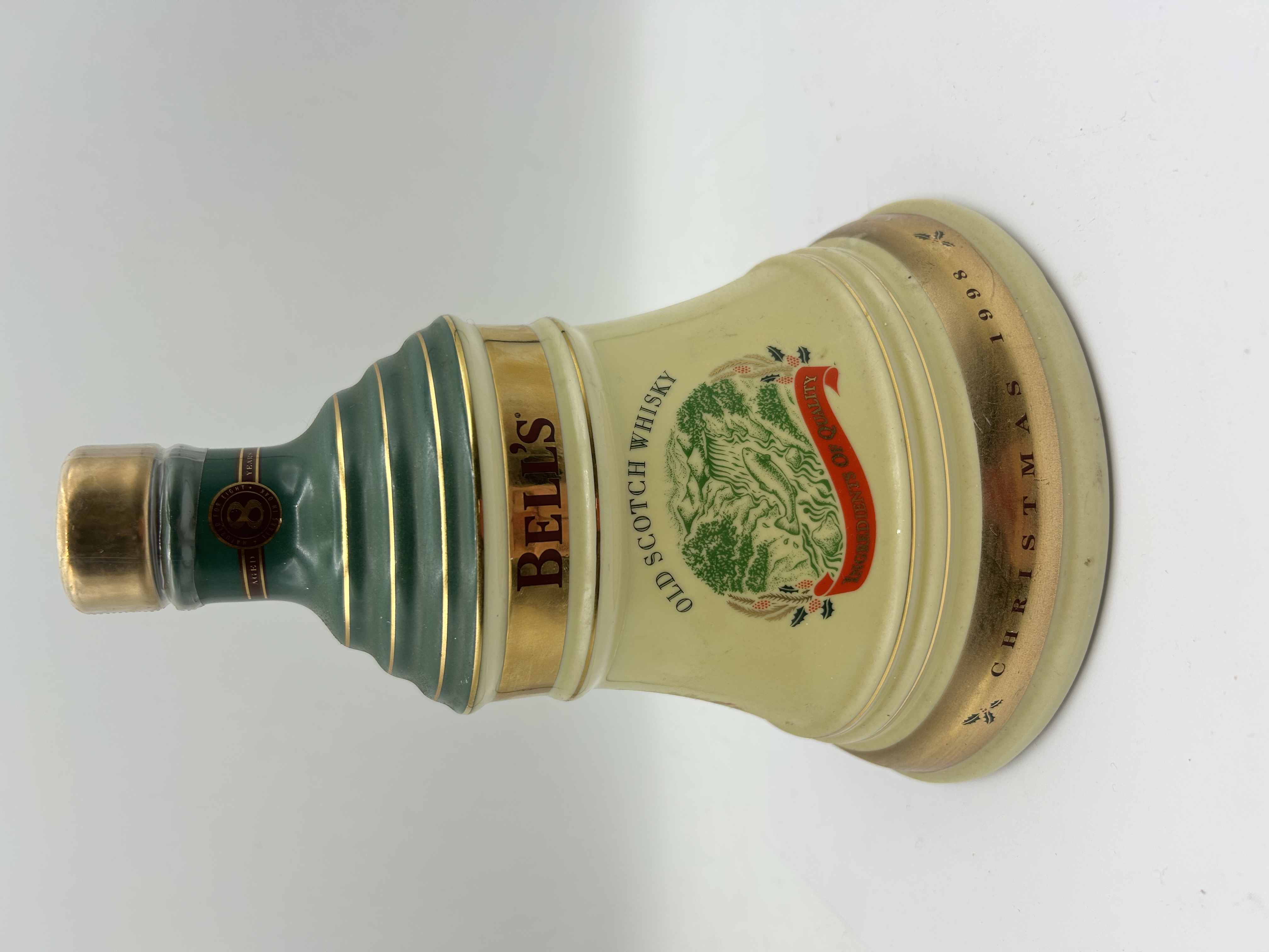 A commemorative ceramic bell-shaped decanter containing Bell’s Old Scotch Whisky, produced for the Christmas 1998 season. The decanter features a cream-coloured body with a green neck accented by horizontal gold-tone banding. A central gold-tone band is inscribed with the name BELL’S. Below this, the text OLD SCOTCH WHISKY surrounds a central graphic depicting a landscape with a red banner inscribed INGREDIENTS OF QUALITY. The flared base features a gold-tone band inscribed CHRISTMAS 1998. The neck is sealed with a gold-tone cap under a clear plastic seal, which includes a label indicating the contents are AGED 8 YEARS. Based on web consensus for this specific release, the decanter has a capacity of 70cl and the spirit is bottled at 40% ABV.