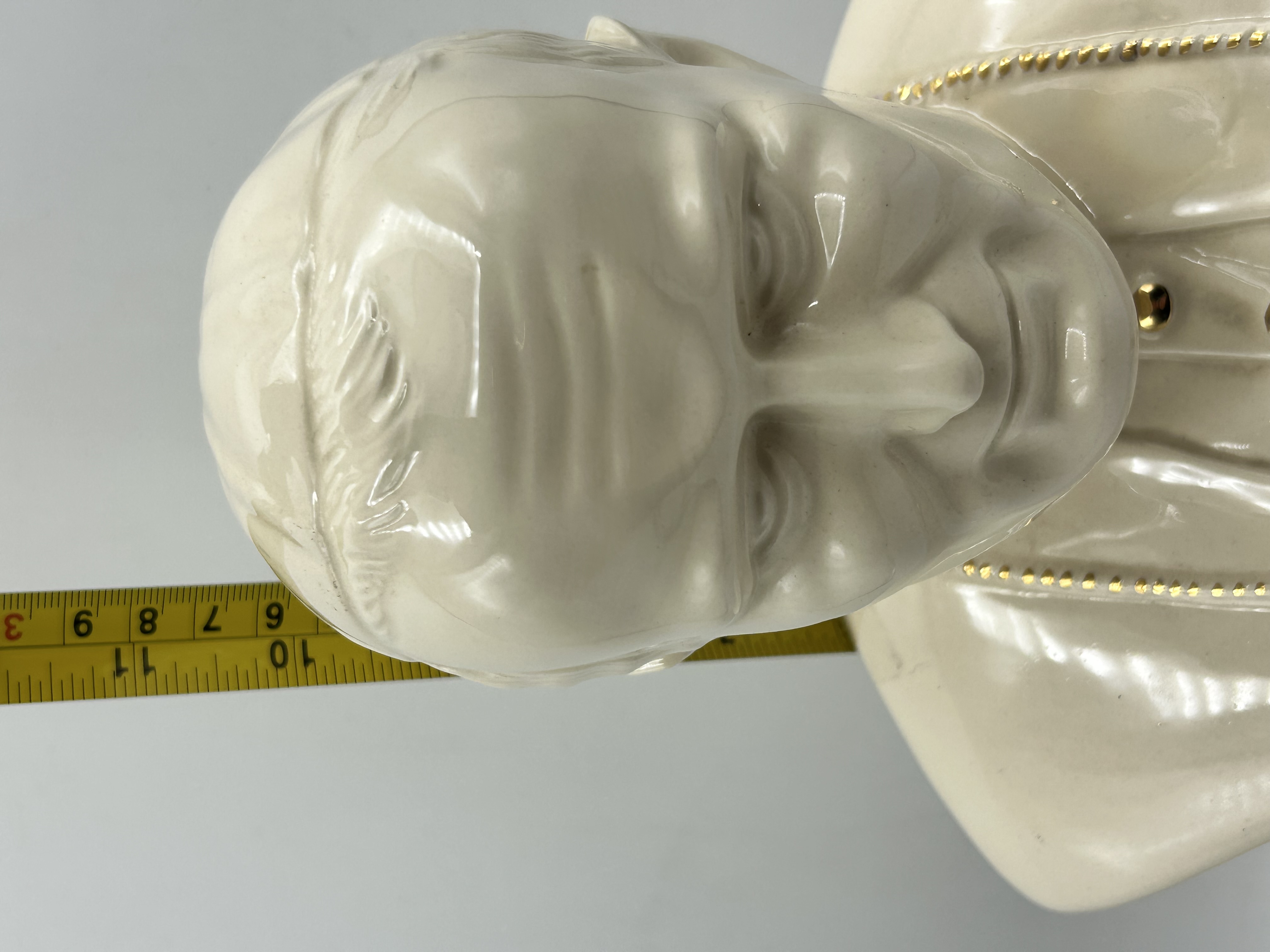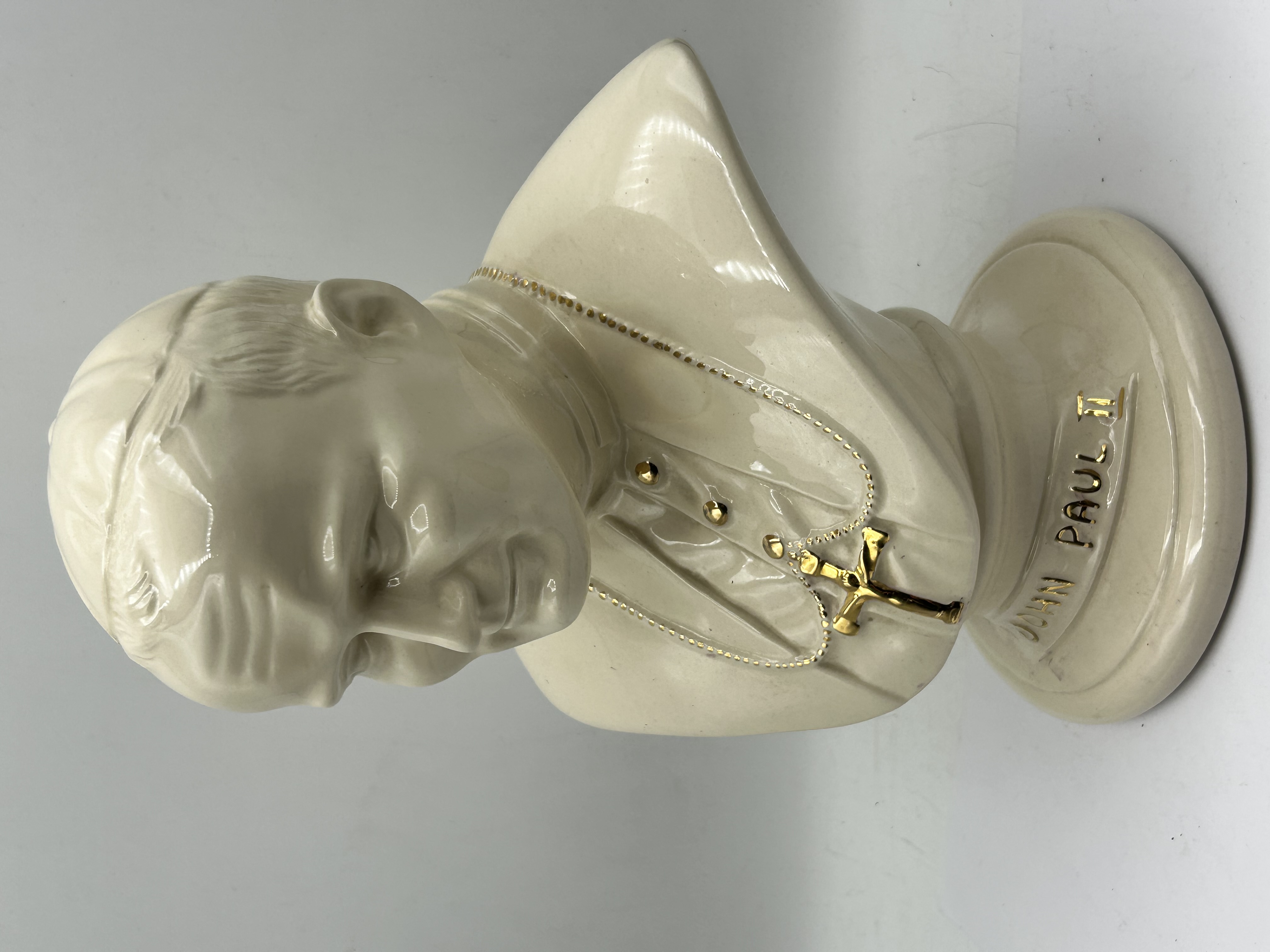 A glazed ceramic bust depicting Pope John Paul II in ecclesiastical attire. The subject is portrayed wearing a zucchetto, a mozzetta, and a pectoral cross suspended from a chain. The piece is finished in a high-gloss cream-coloured glaze with gilt detailing applied to the buttons, the pectoral cross, the chain, and the inscription on the base. The figure is mounted on an integral circular pedestal base which bears the gilt inscription JOHN PAUL II. No maker’s marks or model numbers are visible on the exterior of the piece.