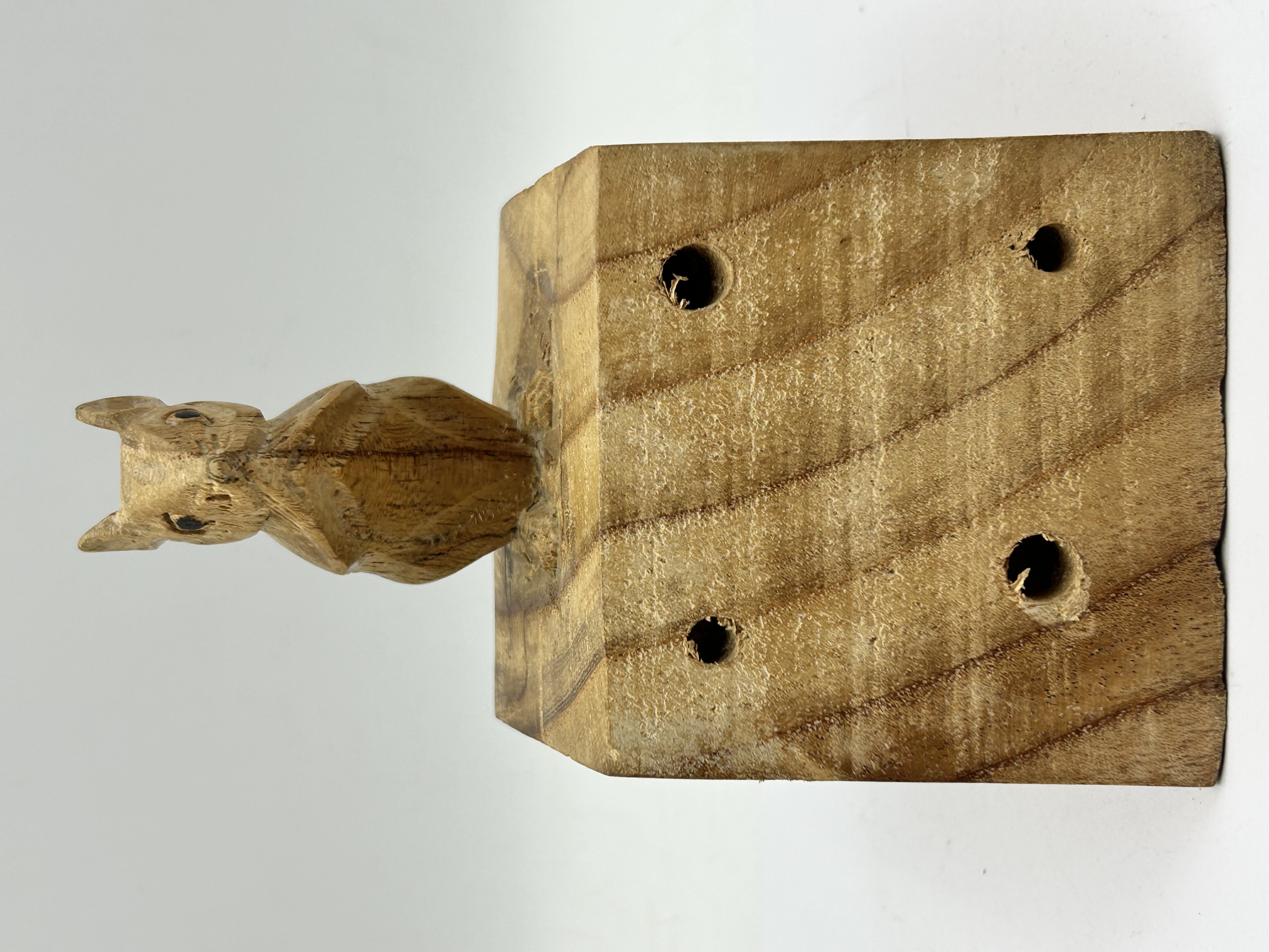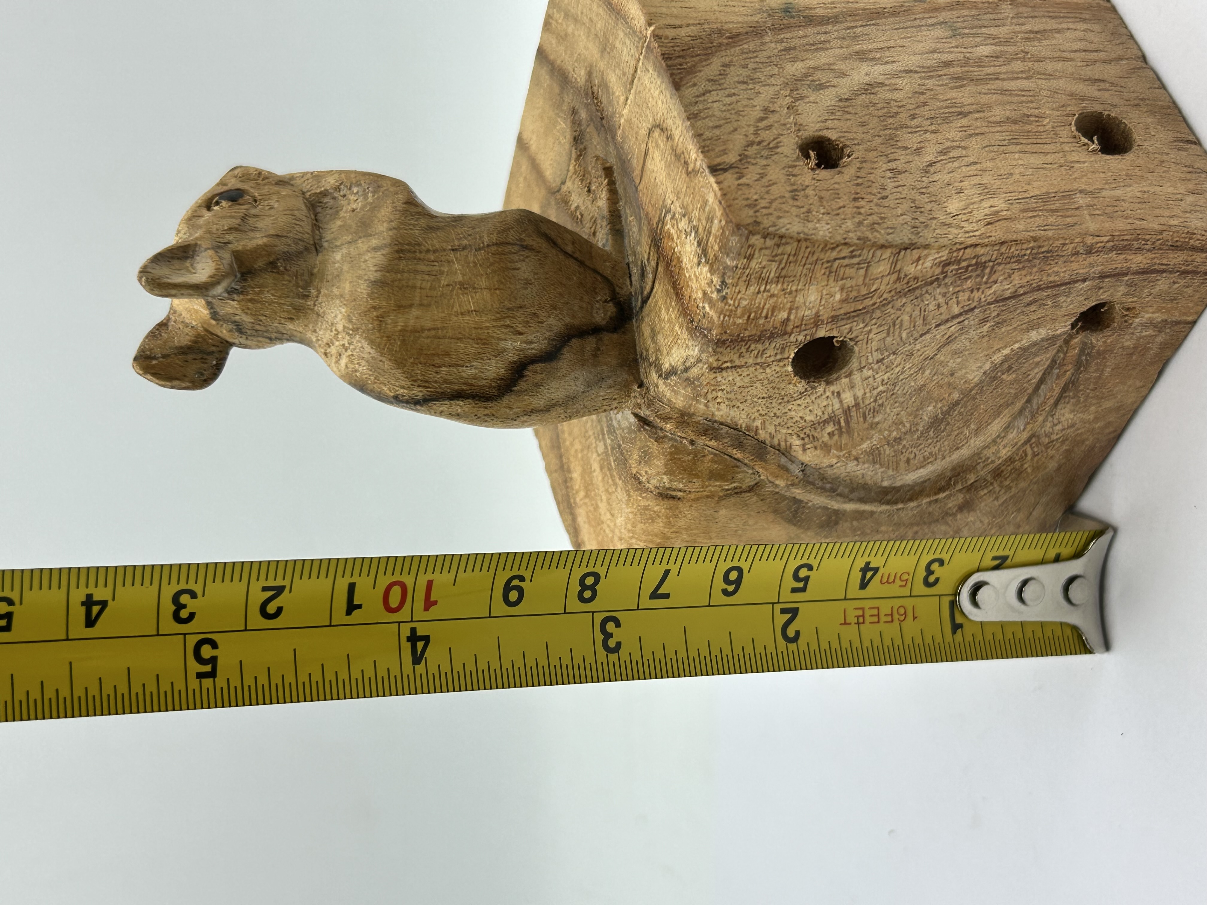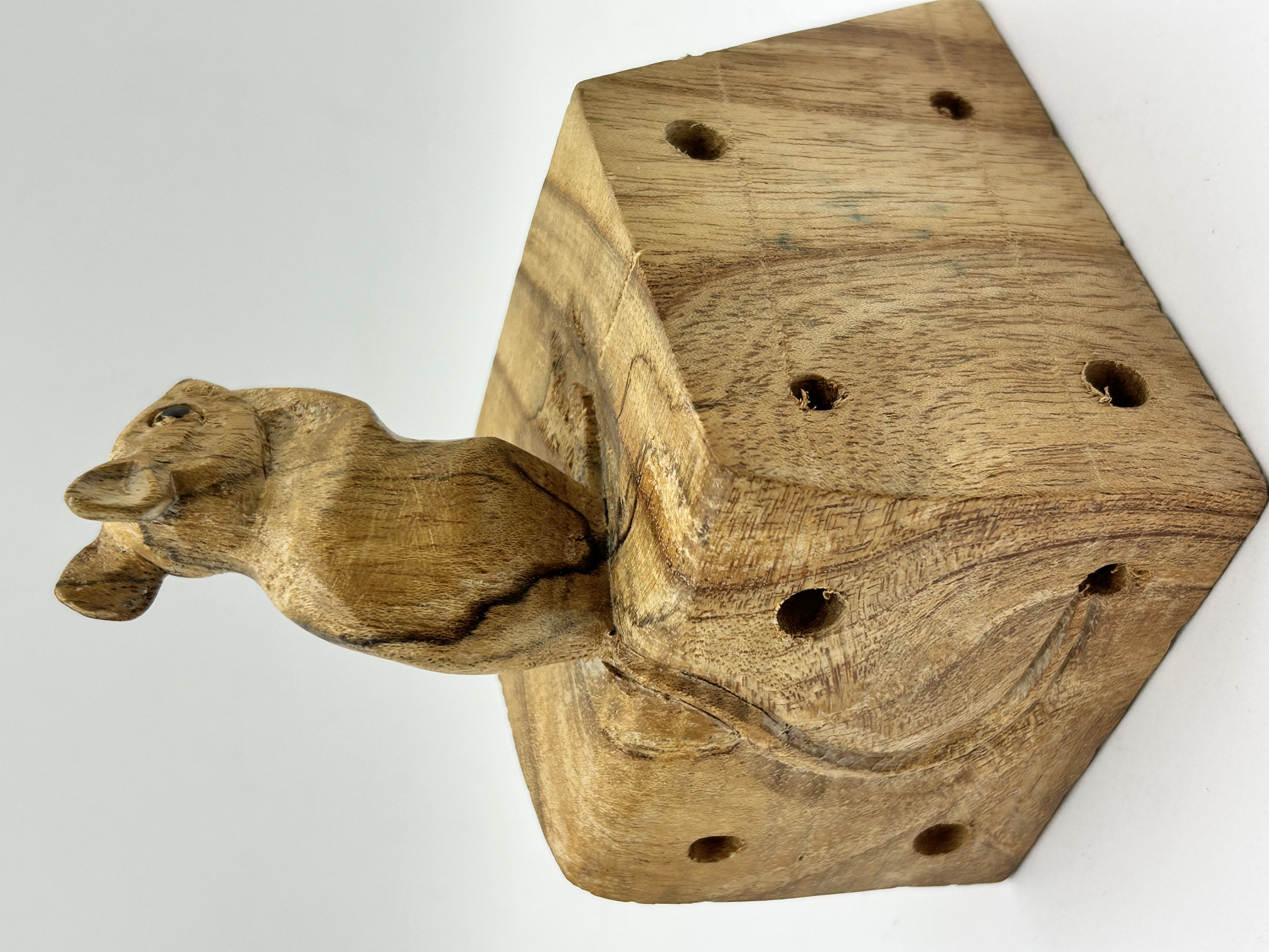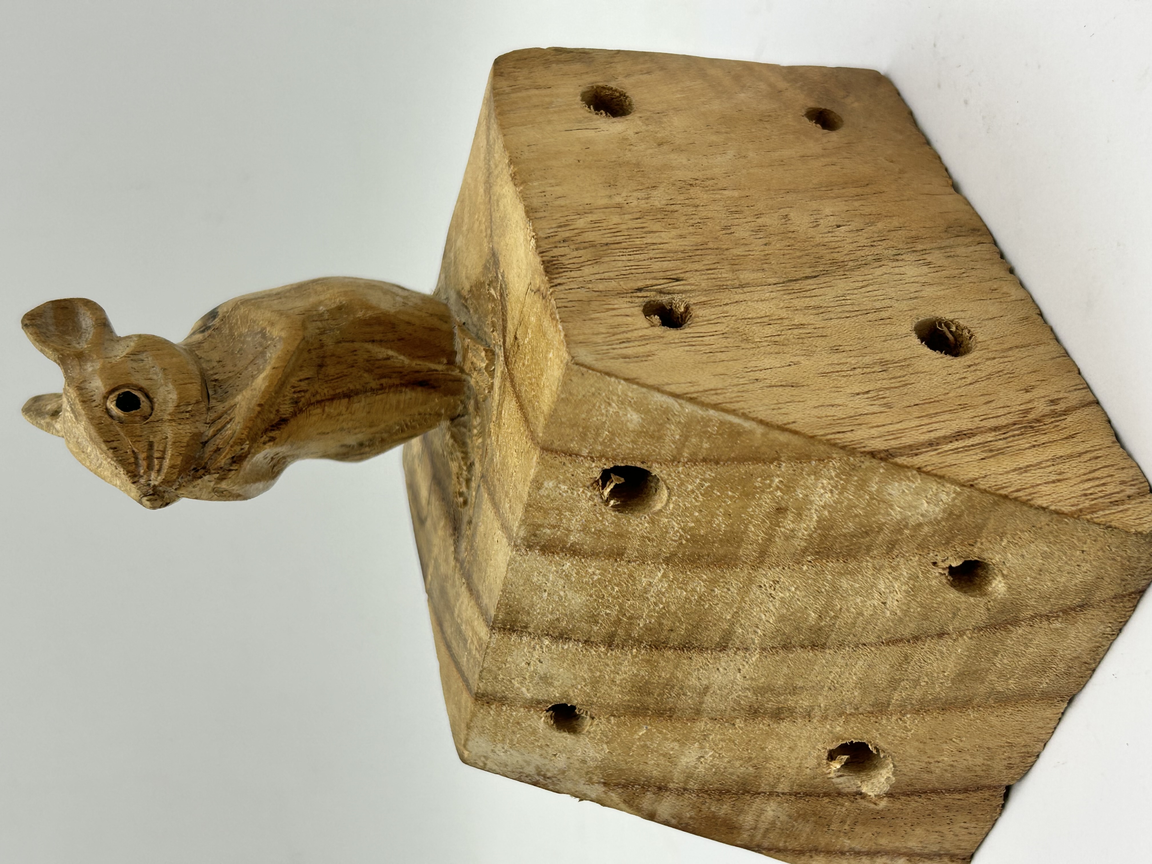 A hand-carved decorative sculpture depicting a stylized mouse positioned atop a wedge of cheese. The item is crafted from a light-toned wood with a prominent grain and natural knots, characteristic of suar wood. The mouse is rendered with faceted chisel marks and features dark, bead-like inset eyes. The base is shaped as an angular block punctuated with several drilled holes to simulate Swiss cheese. No maker’s marks, signatures, or inscriptions are visible on the piece. The style of the carving is reminiscent of the Yorkshire school of woodcarving, though the material and execution suggest a more contemporary, hand-crafted origin.