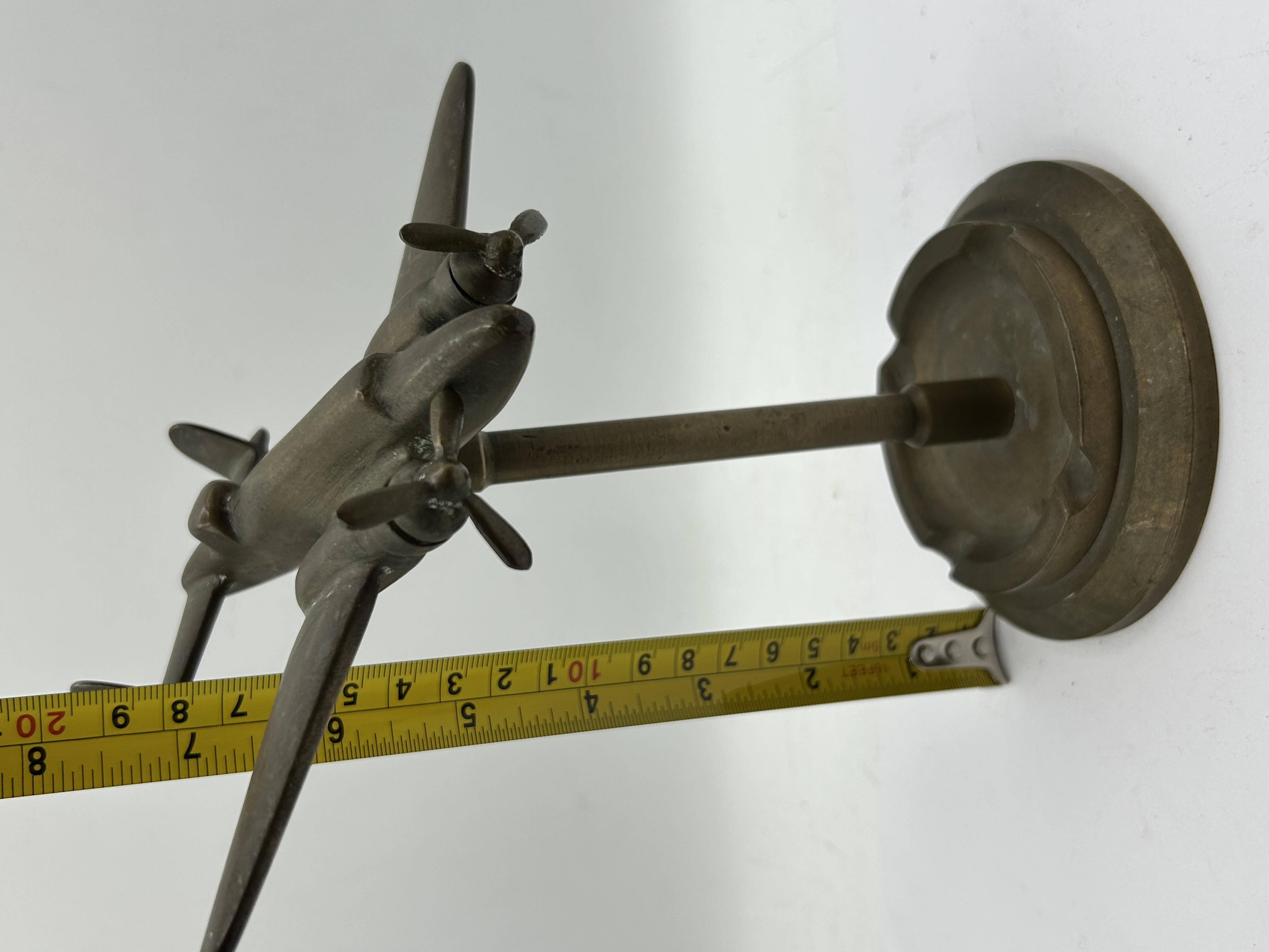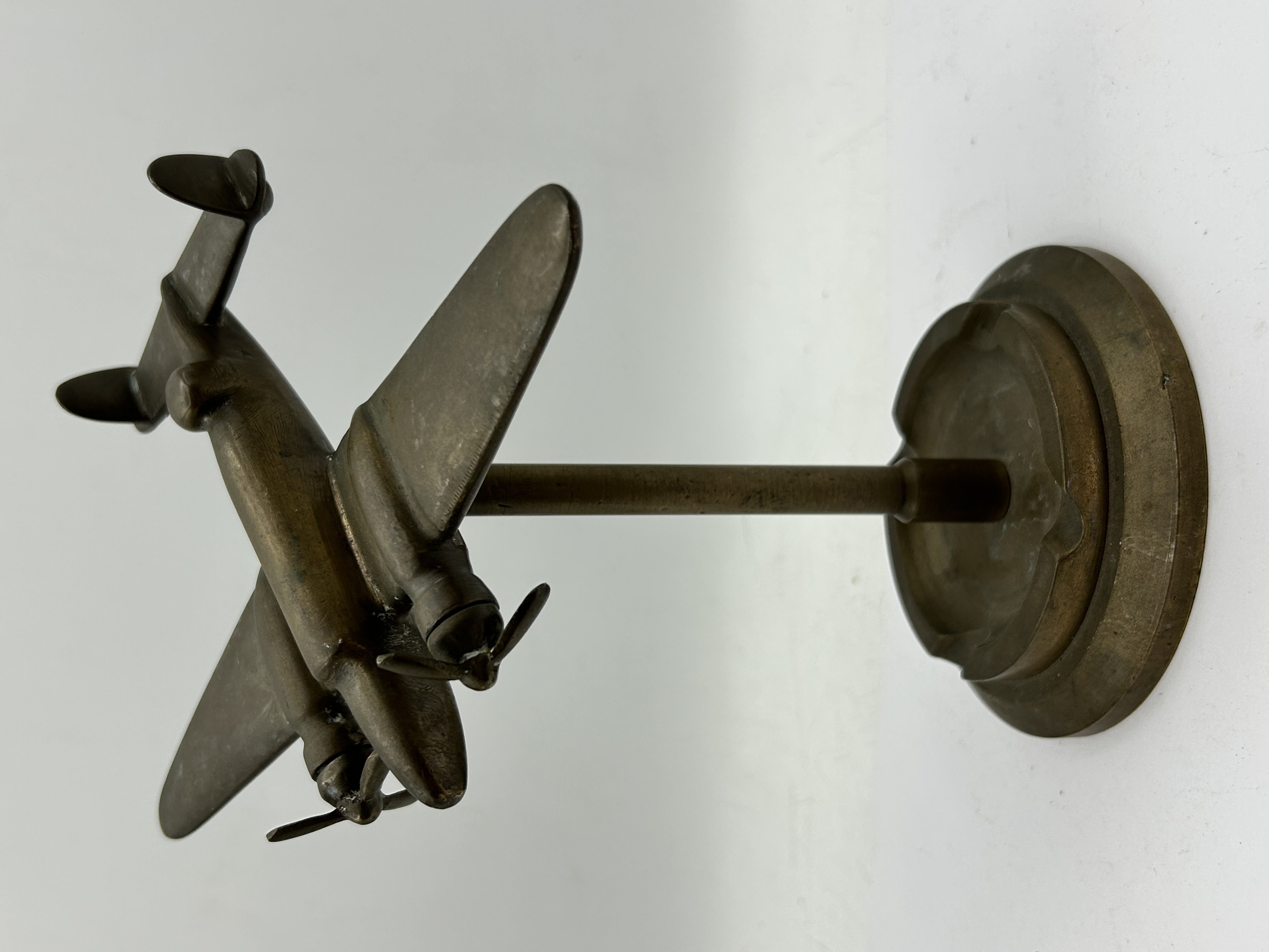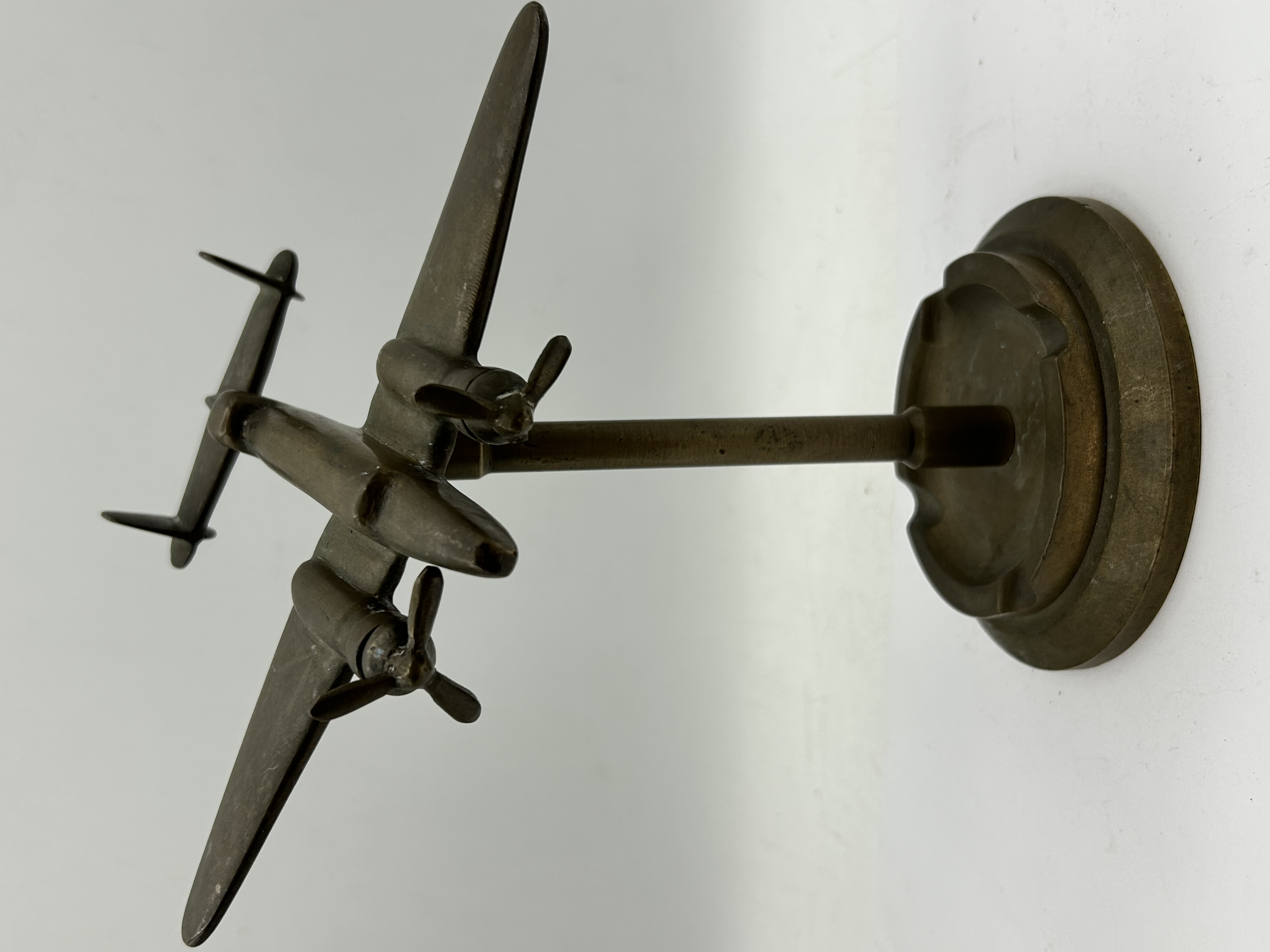 A mid-20th century cast brass desk model of a twin-engine aircraft, attributed to the style of a Lockheed Hudson bomber. The aircraft is designed with a twin-tailplane configuration and features two rotating two-blade propellers. The model is mounted on a central support rod fixed to a circular stepped base. The base includes three integrated rests, identifying the piece as a desk ashtray. The metal displays a dark aged patina throughout. No registration markings or Hull Identification Numbers (HIN) are present. As a static decorative model, there are no recorded engine hours or electronic systems. This listing is based on a visual inspection only.