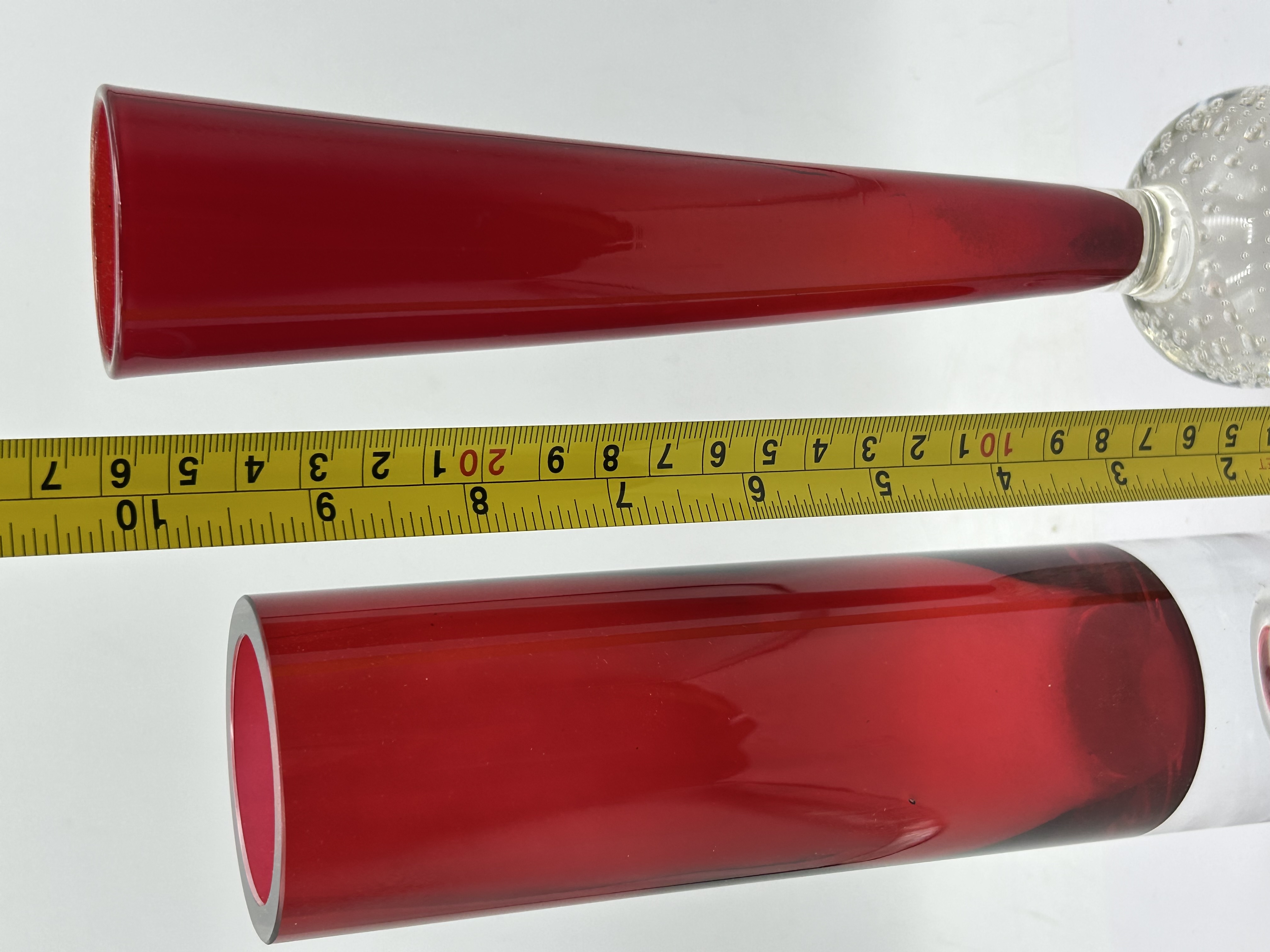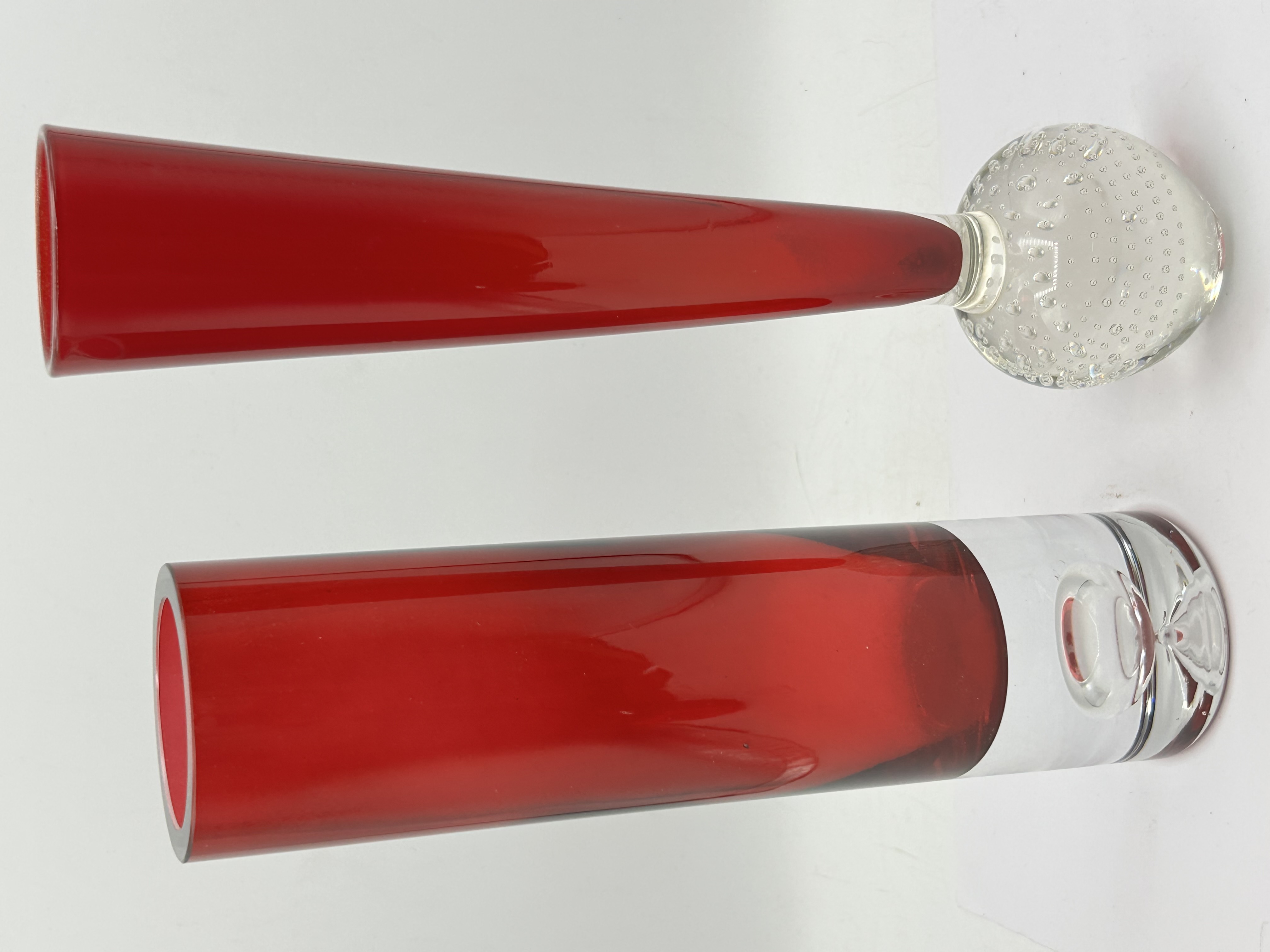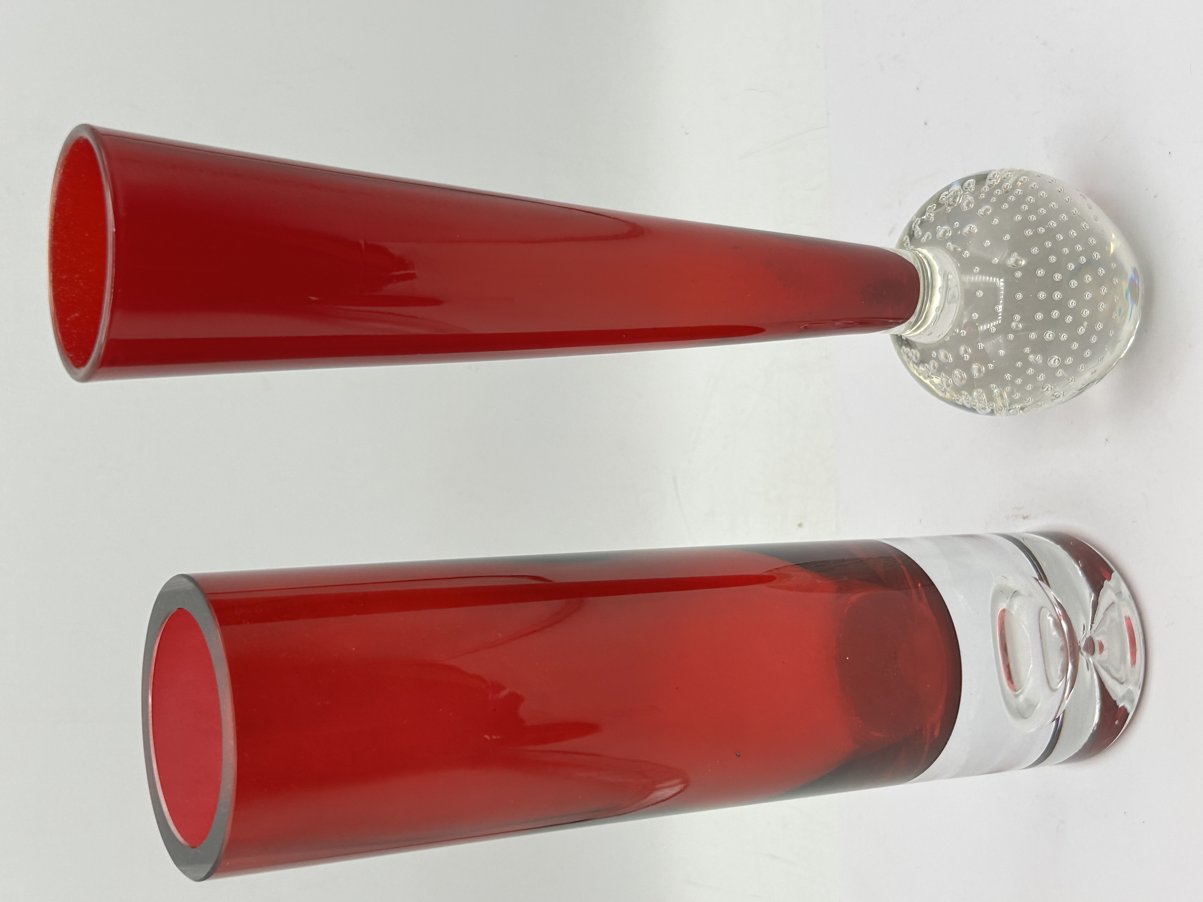 Two mid-century modern art glass bud vases of differing forms. The first item is a tapering bud vase featuring a ruby red glass body cased over a clear interior, joined to a clear glass spherical base. The base is decorated using the bullicante technique, which consists of a regular pattern of controlled internal air bubbles. The second item is a cylindrical bud vase with a ruby red body cased over a clear interior, terminating in a heavy, solid clear glass base with a smooth, polished finish and a central indentation to the underside. This cylindrical form is reminiscent of the Whitefriars Chimney vase, pattern number 9655. Both pieces are hand-blown and do not display any visible maker marks, signatures, or labels.