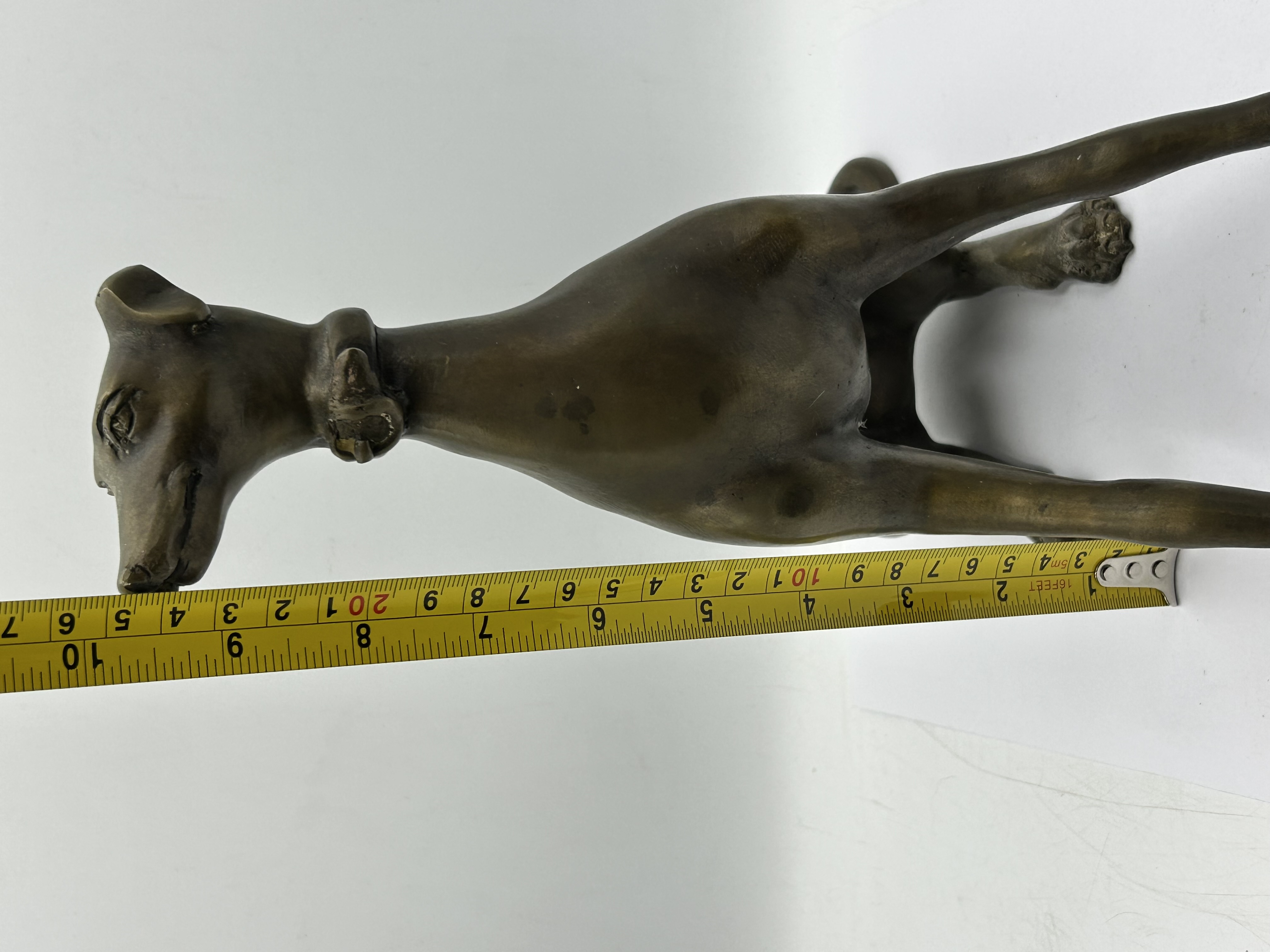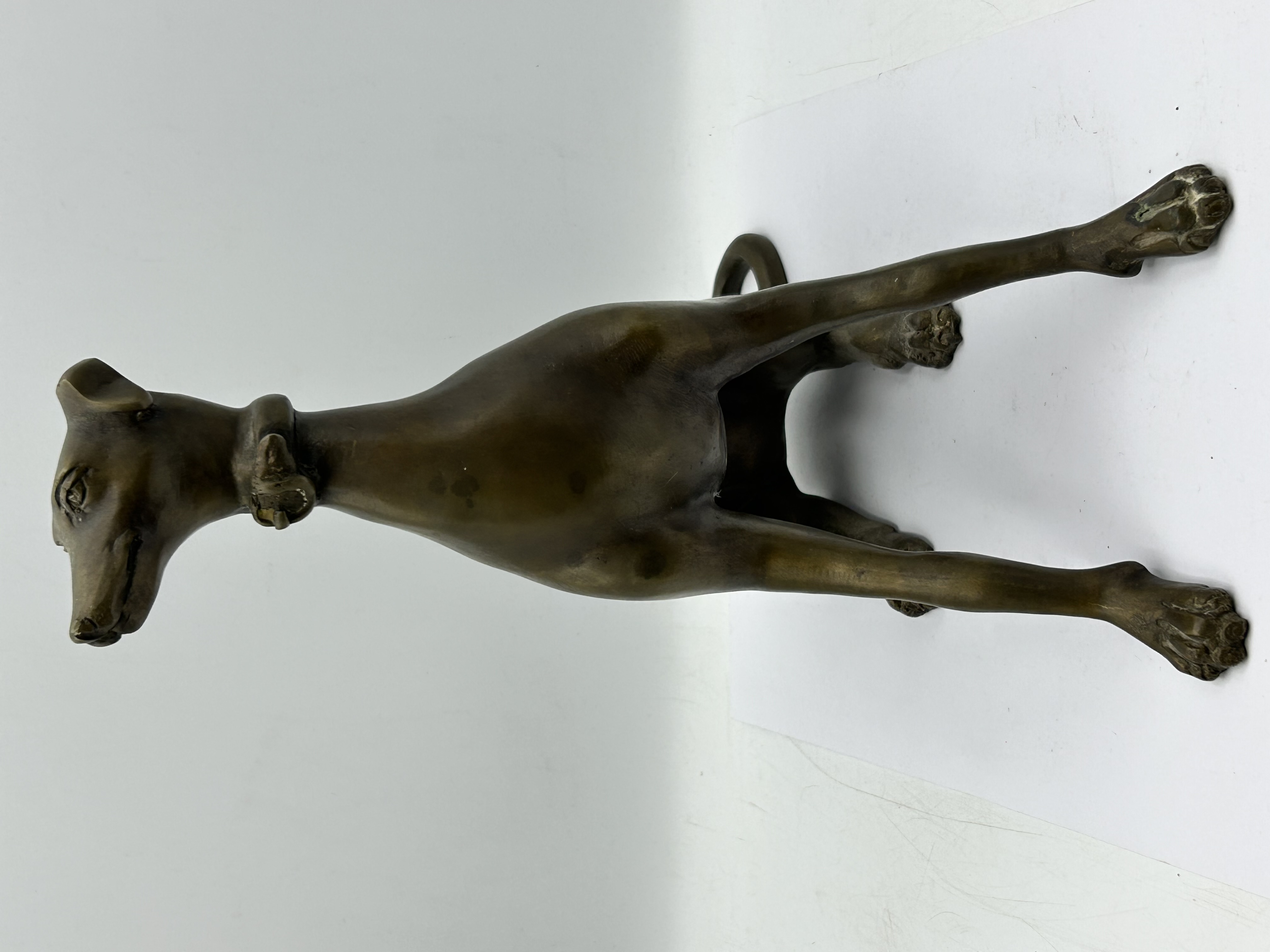 An Art Deco patinated brass sculpture of a seated greyhound.The figure is rendered in a stylised manner with smooth, elongated forms, depicting the dog in an alert posture wearing a buckled collar. The piece is finished with a dark brown patina featuring lighter highlights to the raised details of the ears, nose, and collar. The sculpture is cast without a separate plinth, sitting directly upon its four feet. No signatures, foundry marks, or edition numbers are visible.