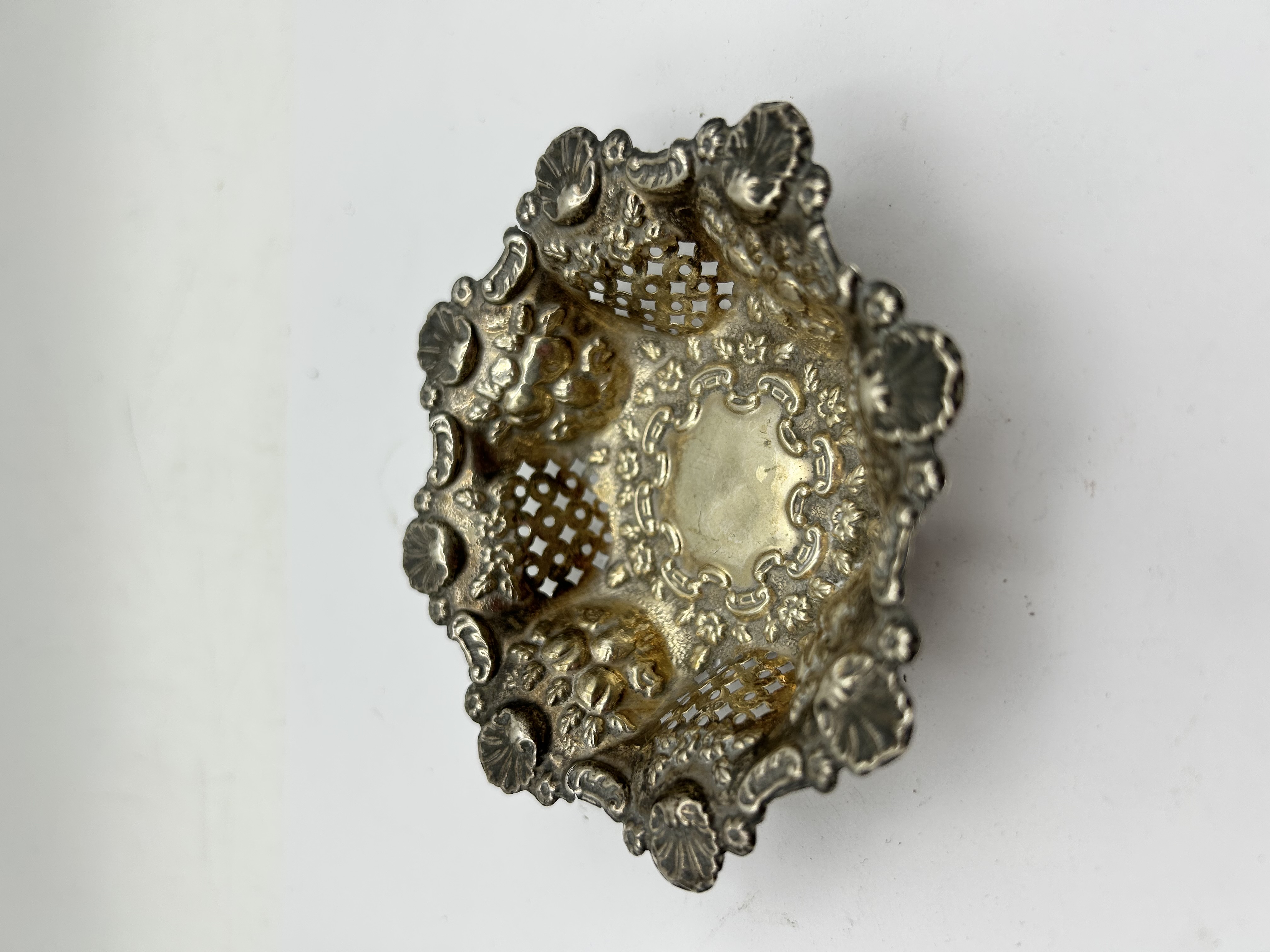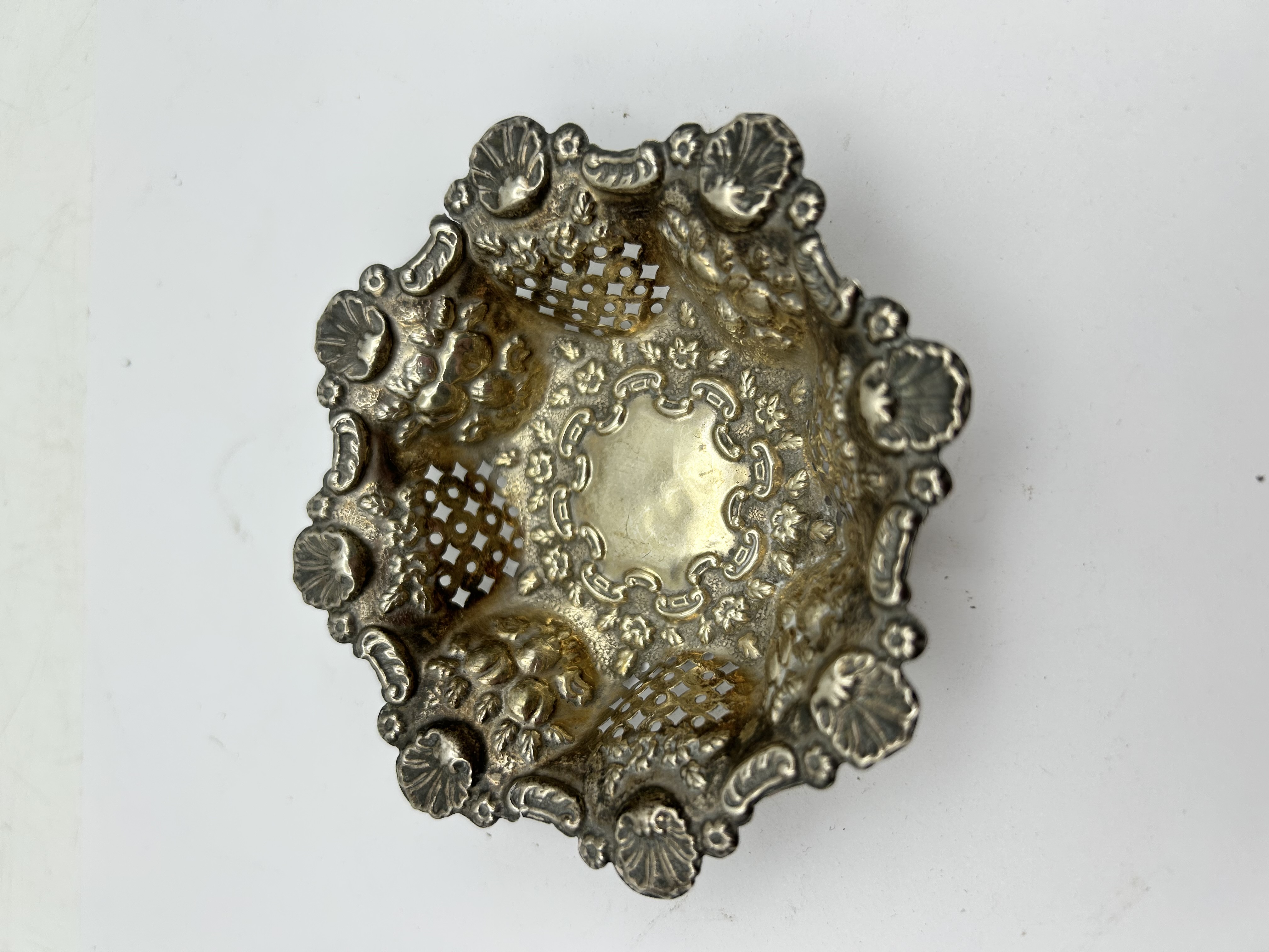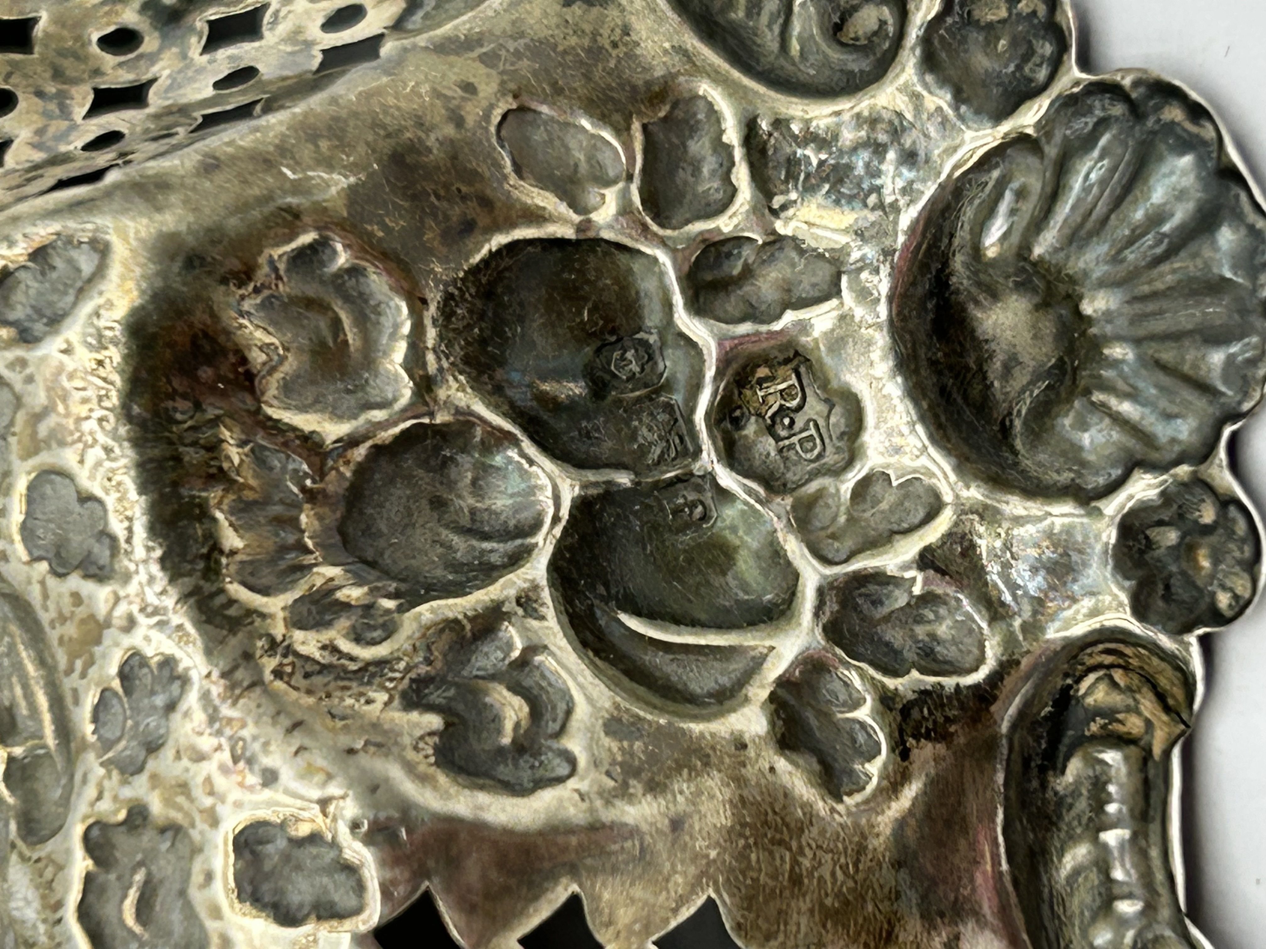 A Victorian sterling silver bonbon dish of circular form featuring a scalloped rim with alternating shell and scroll motifs. The body is decorated with embossed floral and foliate sprays interspersed with three panels of pierced trellis work. The centre of the bowl contains a plain circular cartouche within a decorative scroll and foliate border. The item bears full English hallmarks on the underside of the rim including the maker mark RP for Robert Pringle and Sons, the lion passant for sterling silver, the leopard head for the London assay office, and the date letter a for 1896.