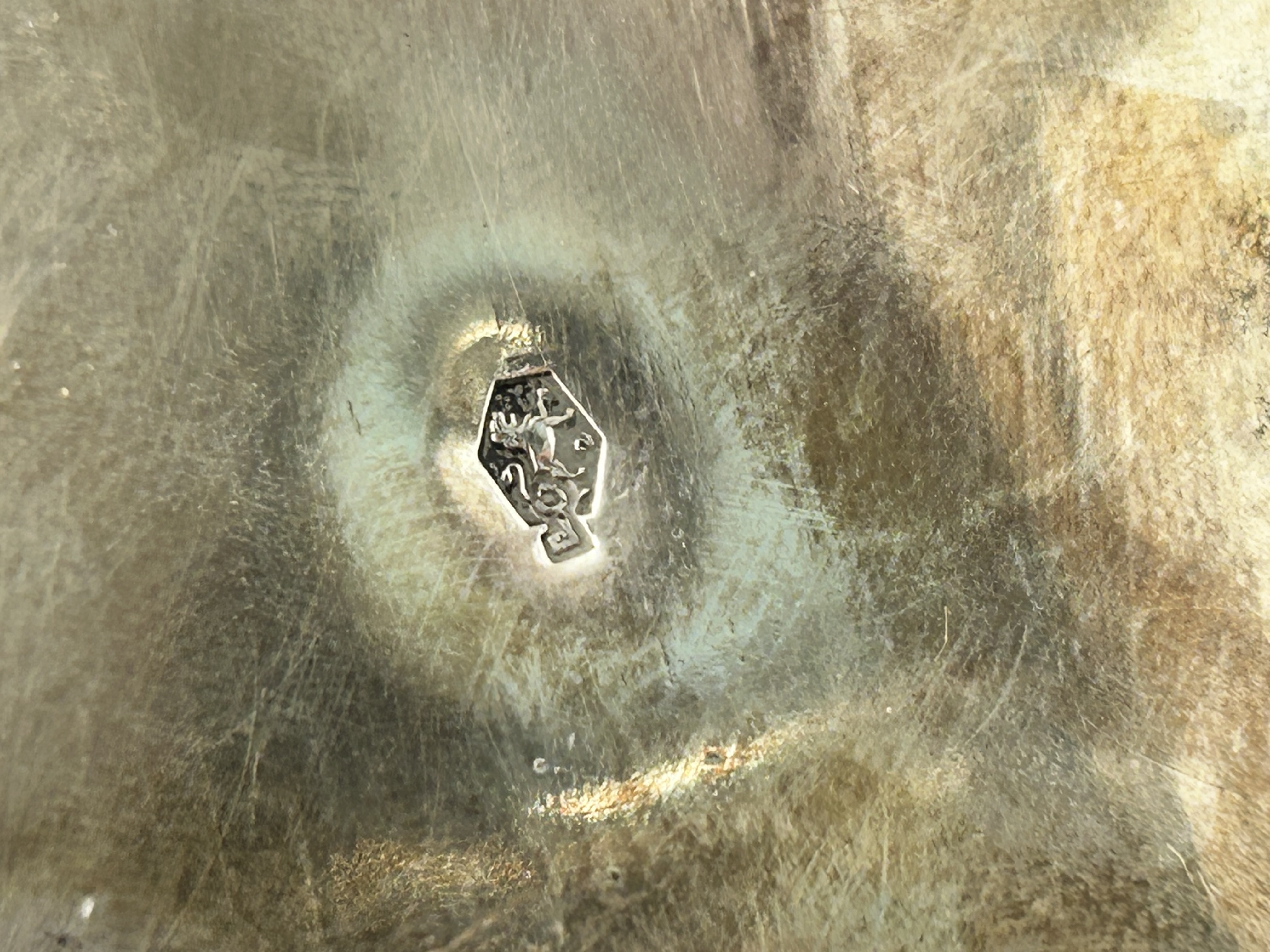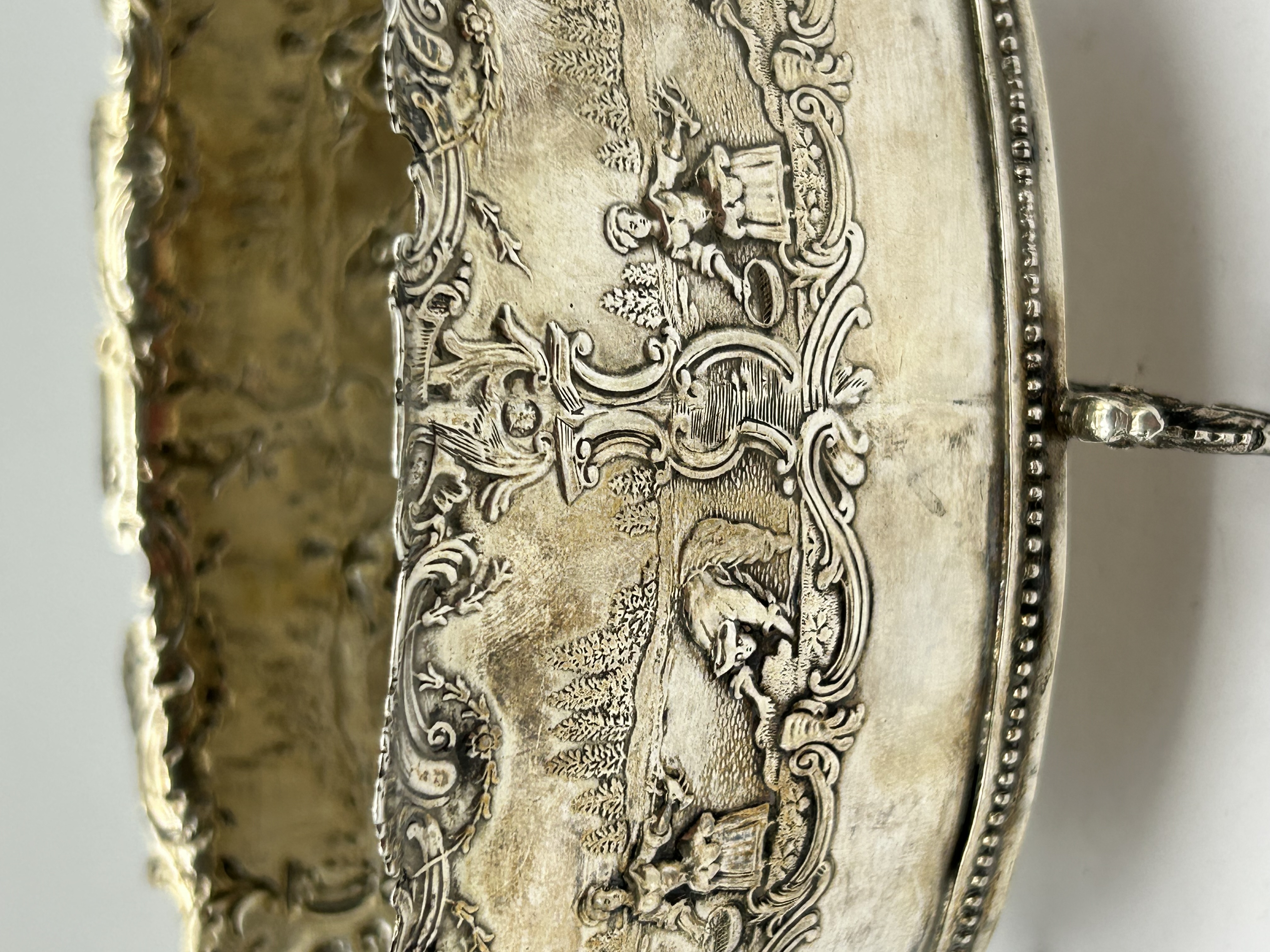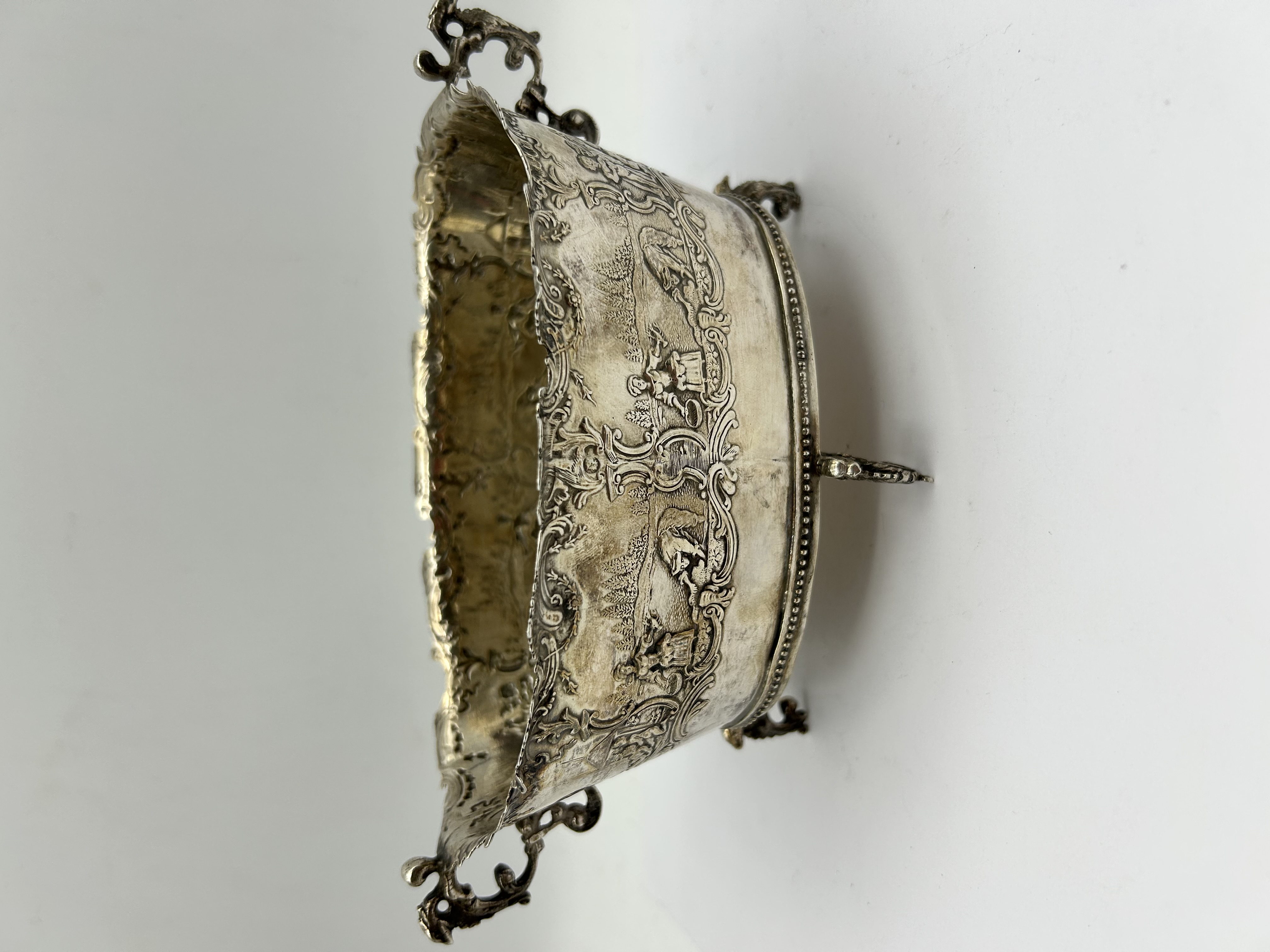 A Dutch silver centrepiece bowl of oval form, featuring high-relief repoussé decoration. The body is ornamented with pastoral scenes depicting figures within landscape settings, including trees and architectural elements, all framed by scrolling rocaille and foliate cartouches. The vessel is designed with an irregular, leaf-cast scalloped rim and two openwork C-scroll handles. The piece is raised on four integral scrolled feet. The base is stamped with a single hallmark within a vertical hexagonal punch, depicting a rampant lion facing left above the numeral 2, which identifies the piece as Dutch second standard silver of .833 fineness.