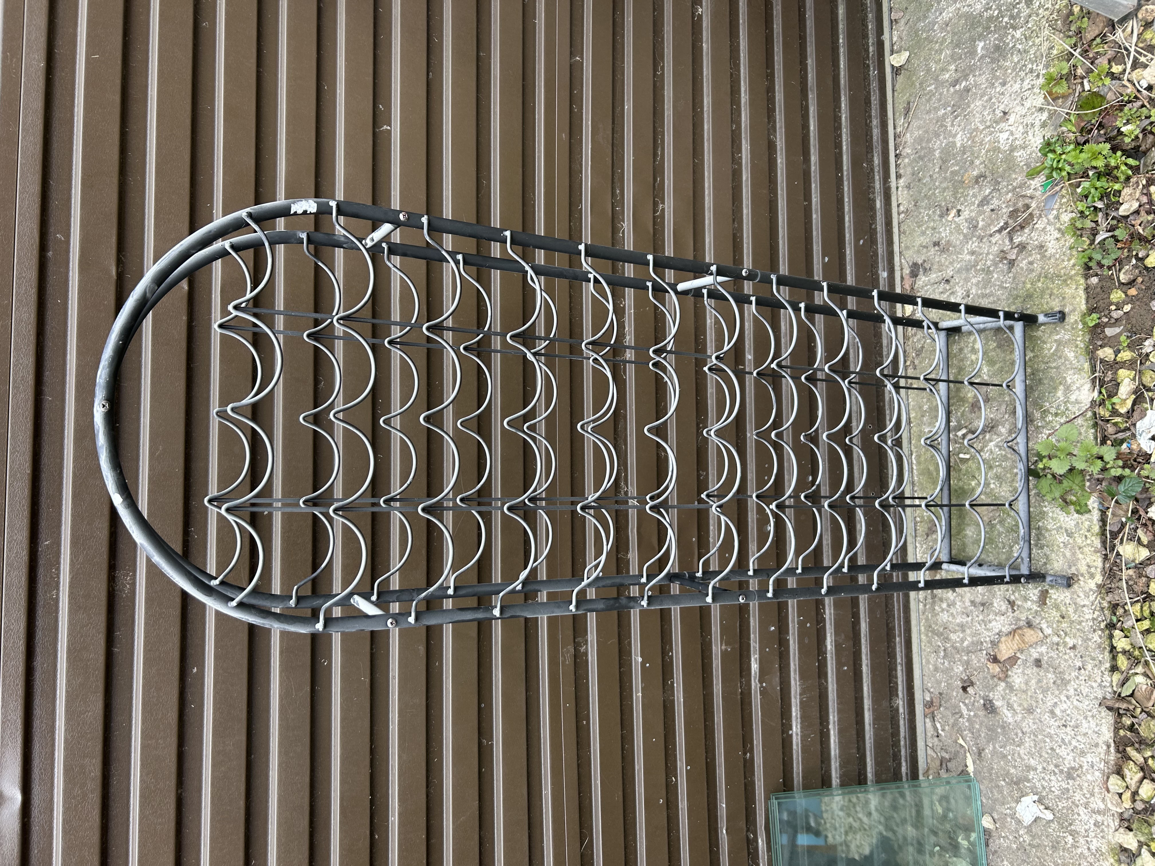 A floor-standing wine rack of contemporary design, constructed from tubular steel with a dark grey matte finish. The frame features a rounded arched top and is fitted with eight tiers of scalloped wire bottle supports arranged in six columns. The structure is assembled using a combination of welds and mechanical fixings. The design allows for the horizontal storage of approximately 48 bottles. No maker marks or labels are present on the frame or supports.