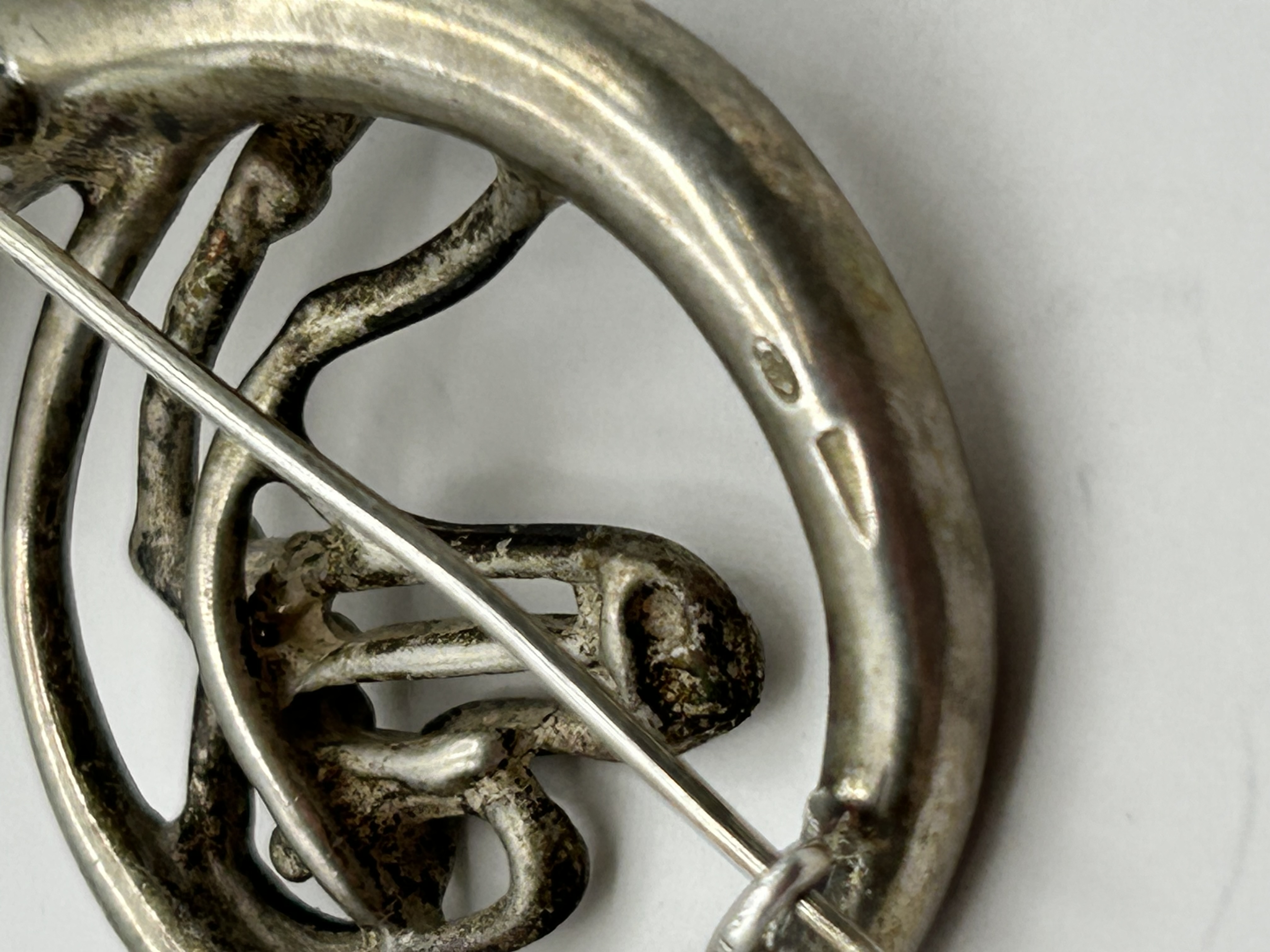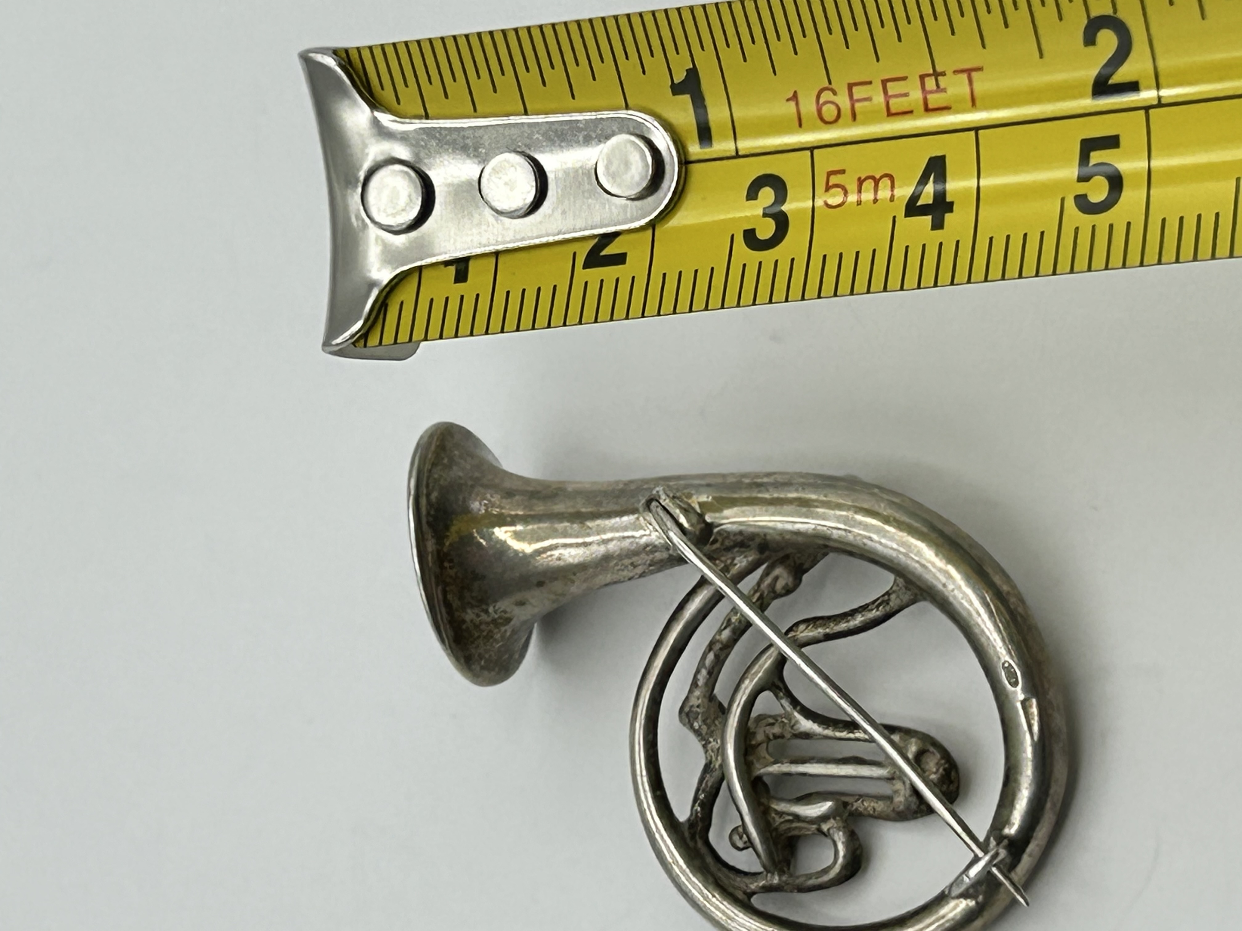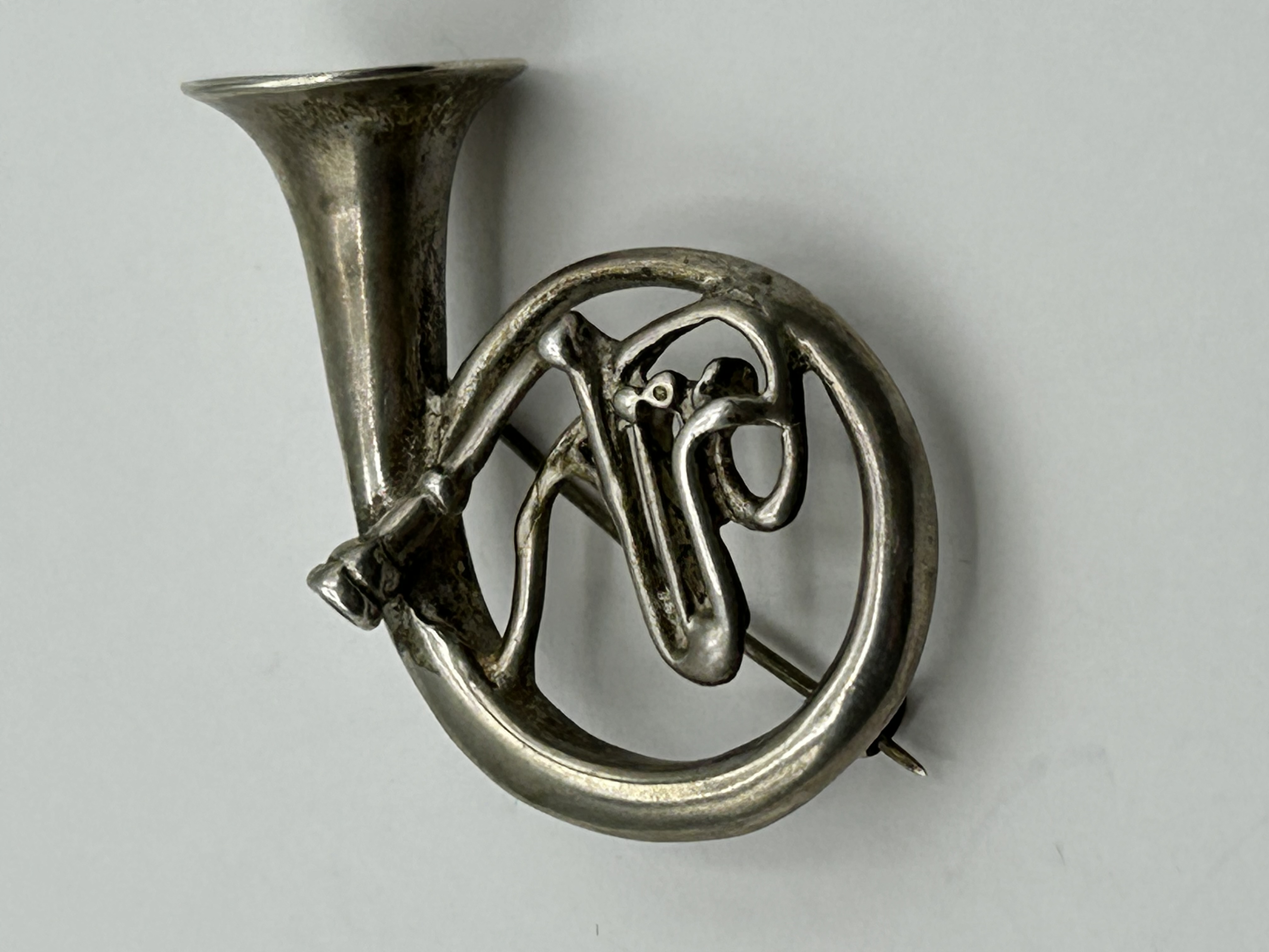 A silver brooch designed in the form of a French horn or coiled hunting horn. The piece features a flared bell and representations of the internal valves and tubing within a circular frame. The reverse of the circular tubing is stamped with an oval punch containing the numerals 835, indicating a silver fineness of .835, a standard commonly used in Continental Europe. A second, rectangular maker’s mark is present but is too worn to be identified. The brooch is secured with a hinged metal pin and a simple C-clasp.