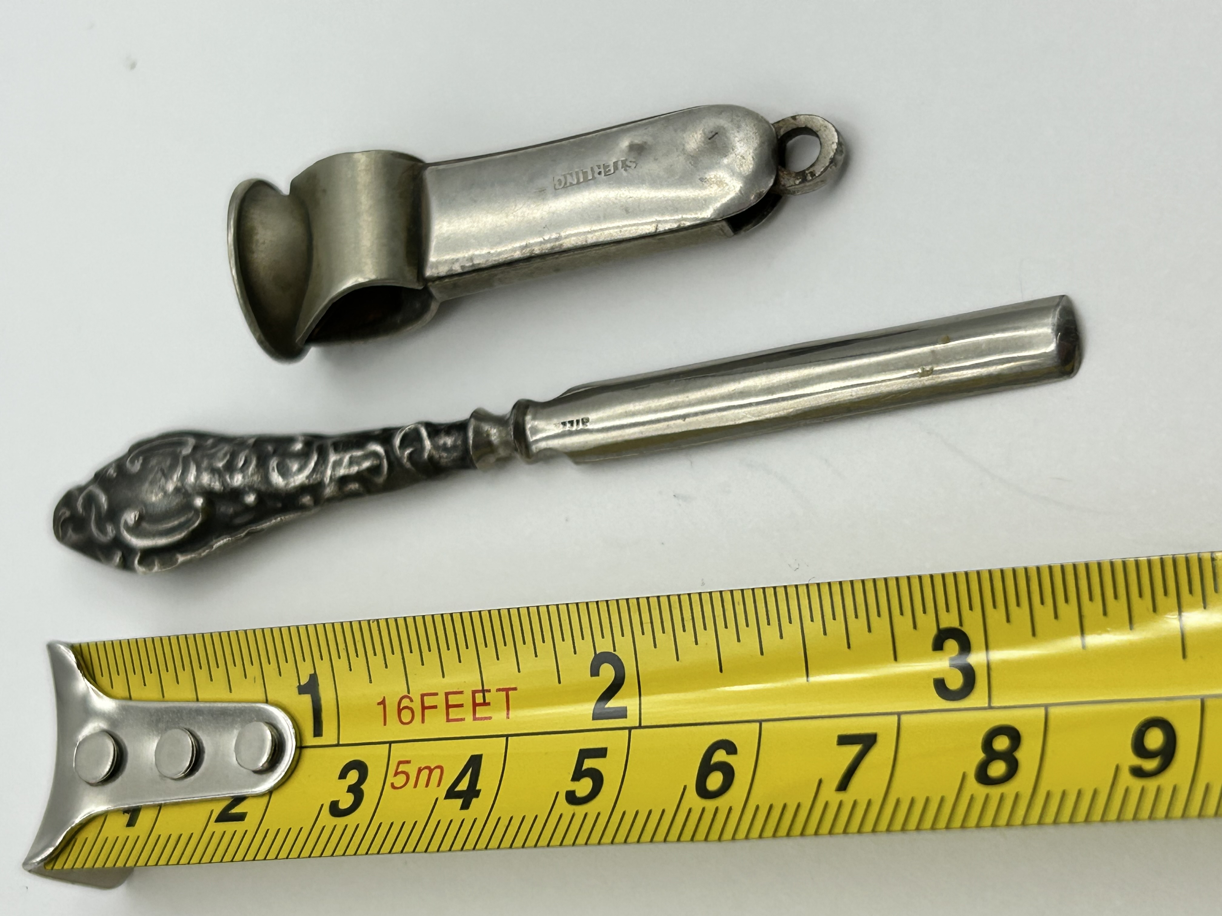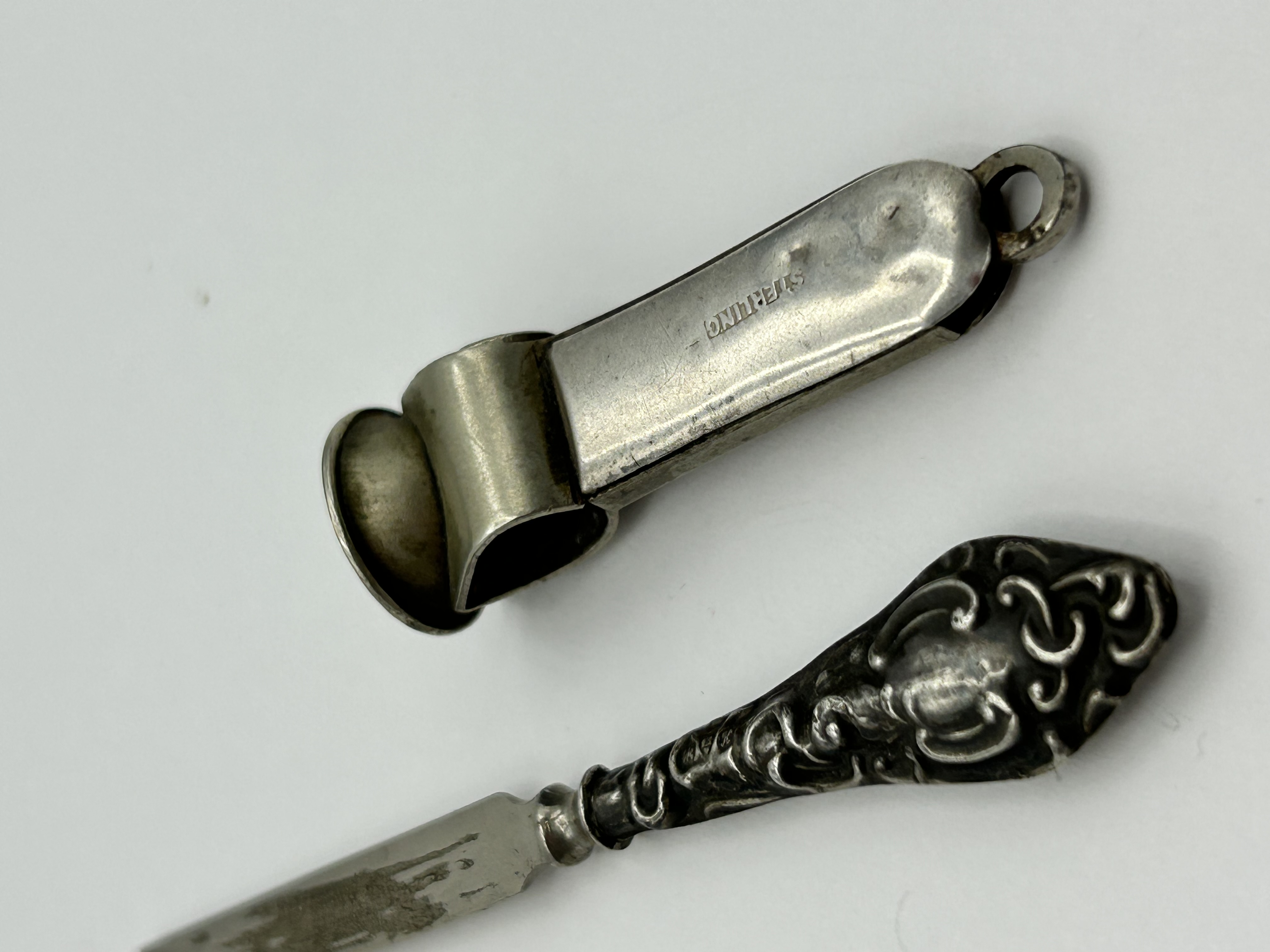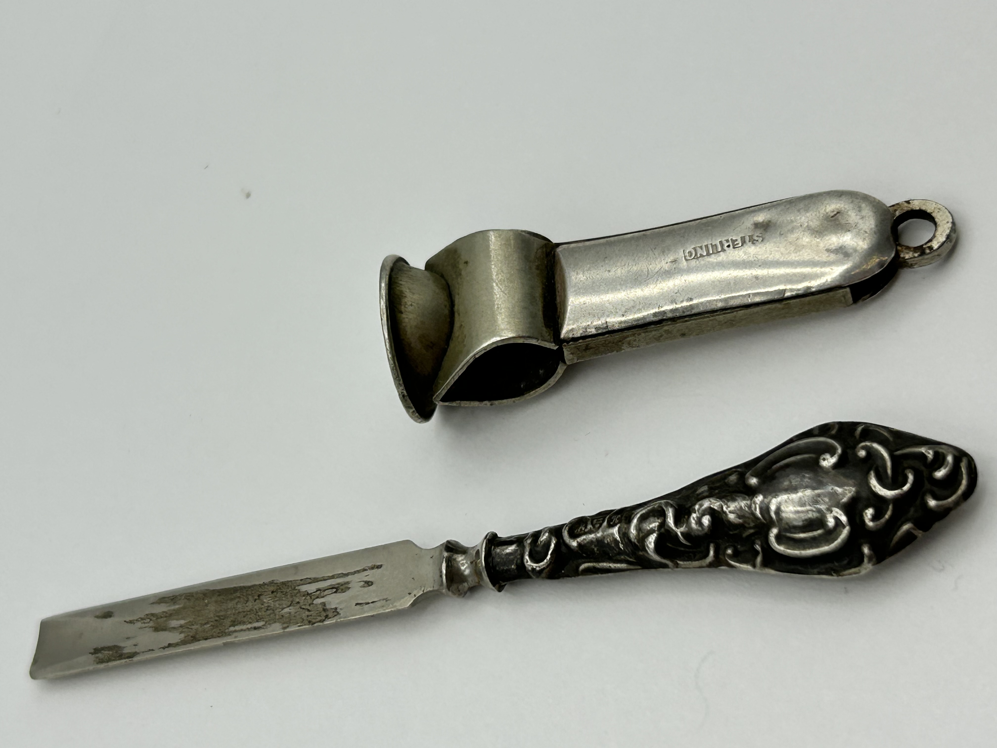 A lot consisting of two silver items. The first is a sterling silver cutter of flat-sided form featuring a suspension loop at the terminal. The body is stamped with the word STERLING. The second item is a manicure tool, likely a cuticle pusher, with an ornate silver repousse handle decorated with foliate and scroll motifs. The tool features a flat-ended metal shank which is stamped STER near the join to the handle.