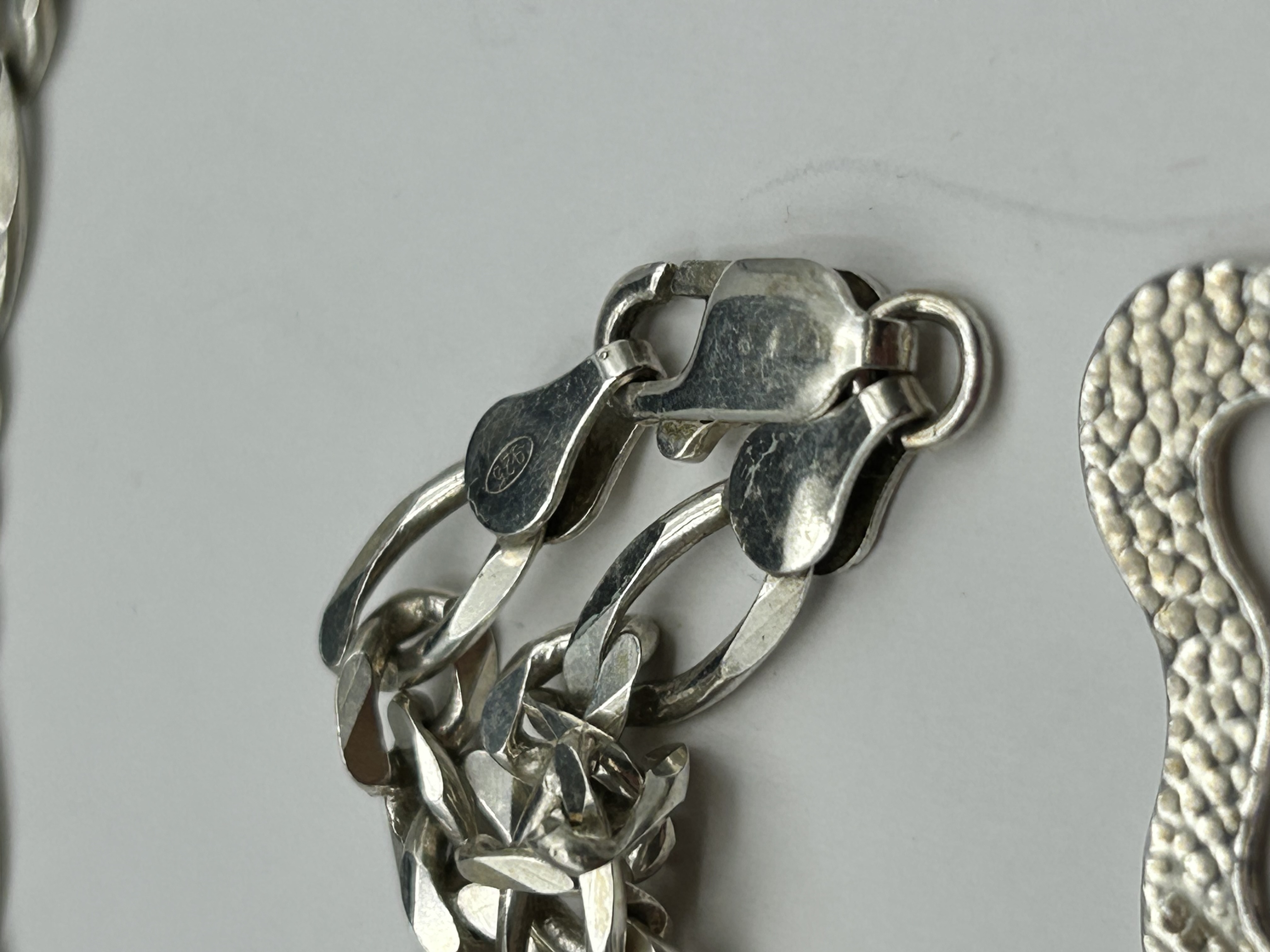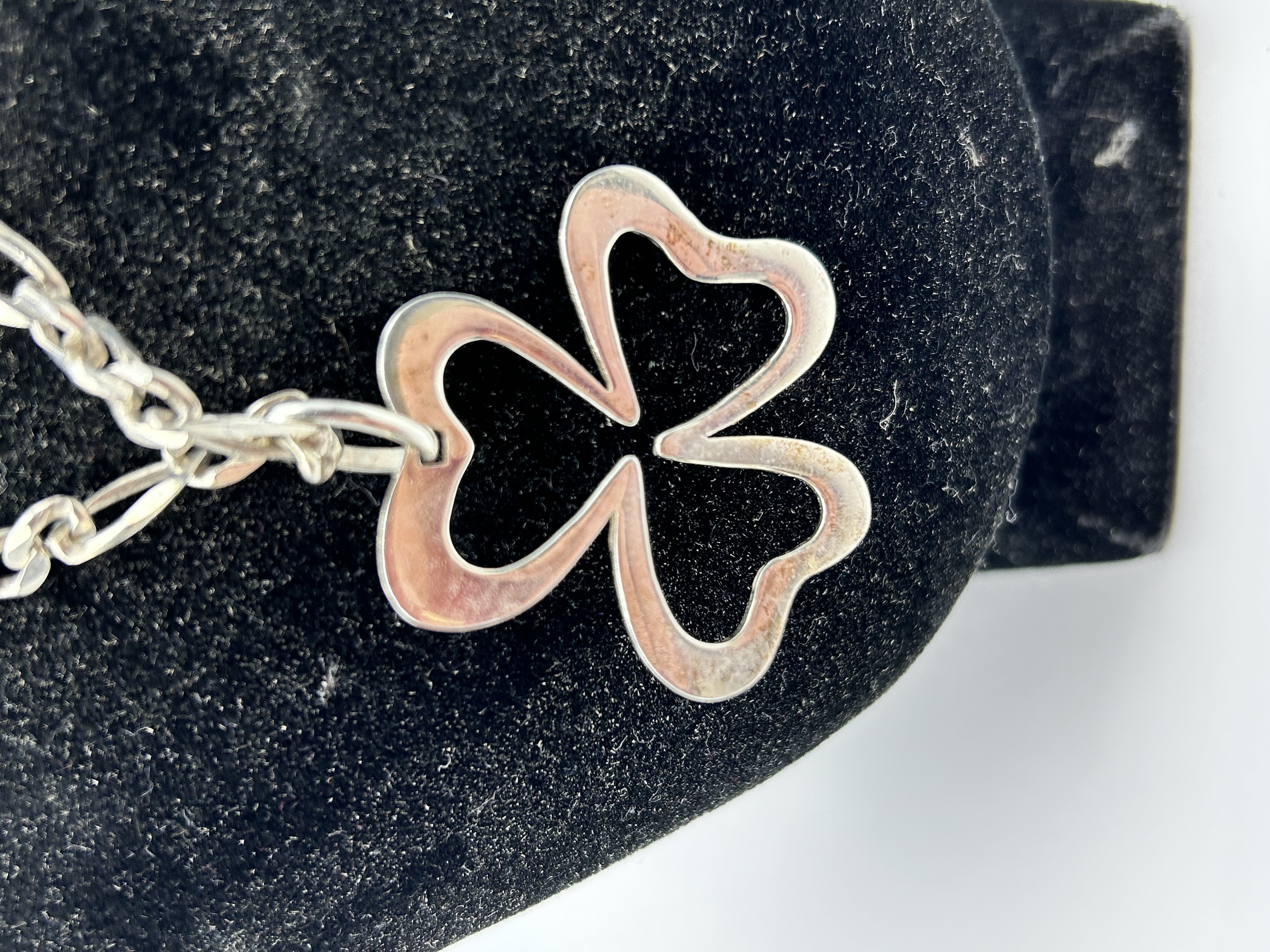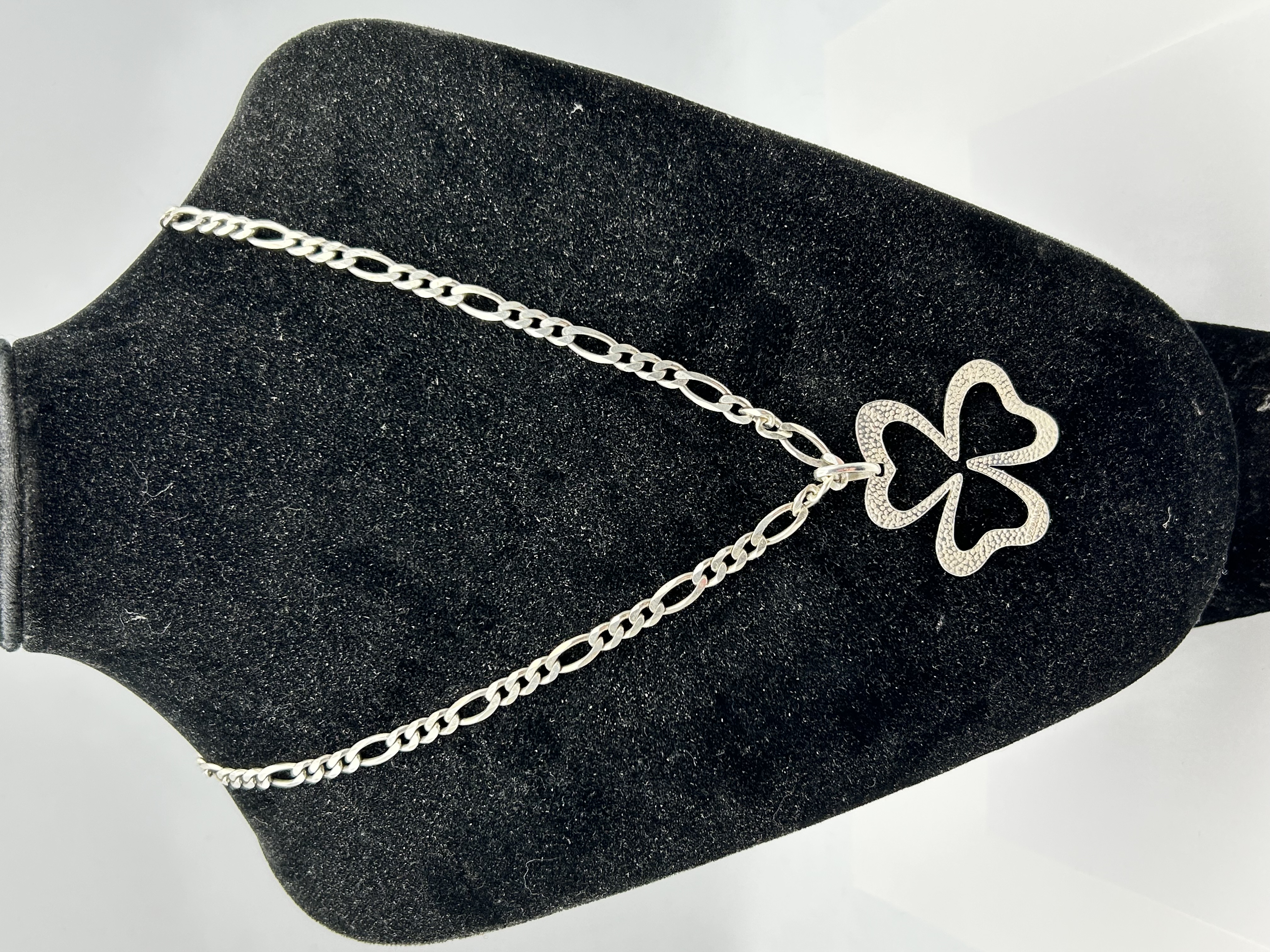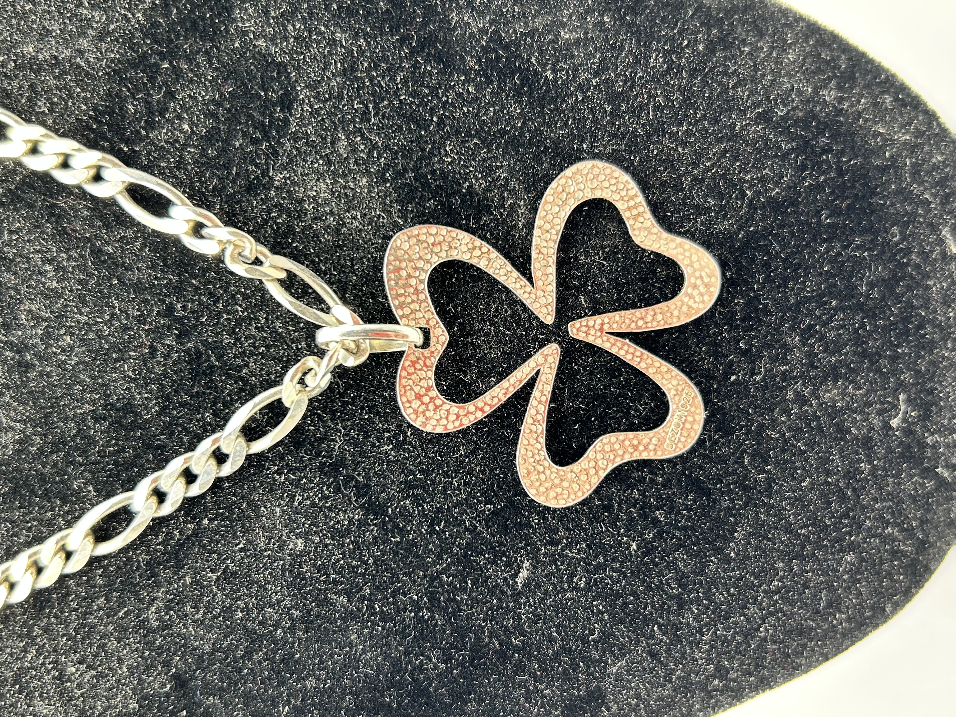 A sterling silver necklace and pendant by Sezin. The pendant features an openwork trefoil or shamrock design with a dense stippled texture on the front face and a smooth finish on the reverse. The pendant is suspended from a Figaro link chain, which consists of an alternating pattern of one elongated link and three shorter circular links. The piece is secured with a lobster claw clasp. Markings include the maker stamp SEZIN 925 on the pendant and a 925 fineness mark within an oval border on the teardrop-shaped end link near the clasp.