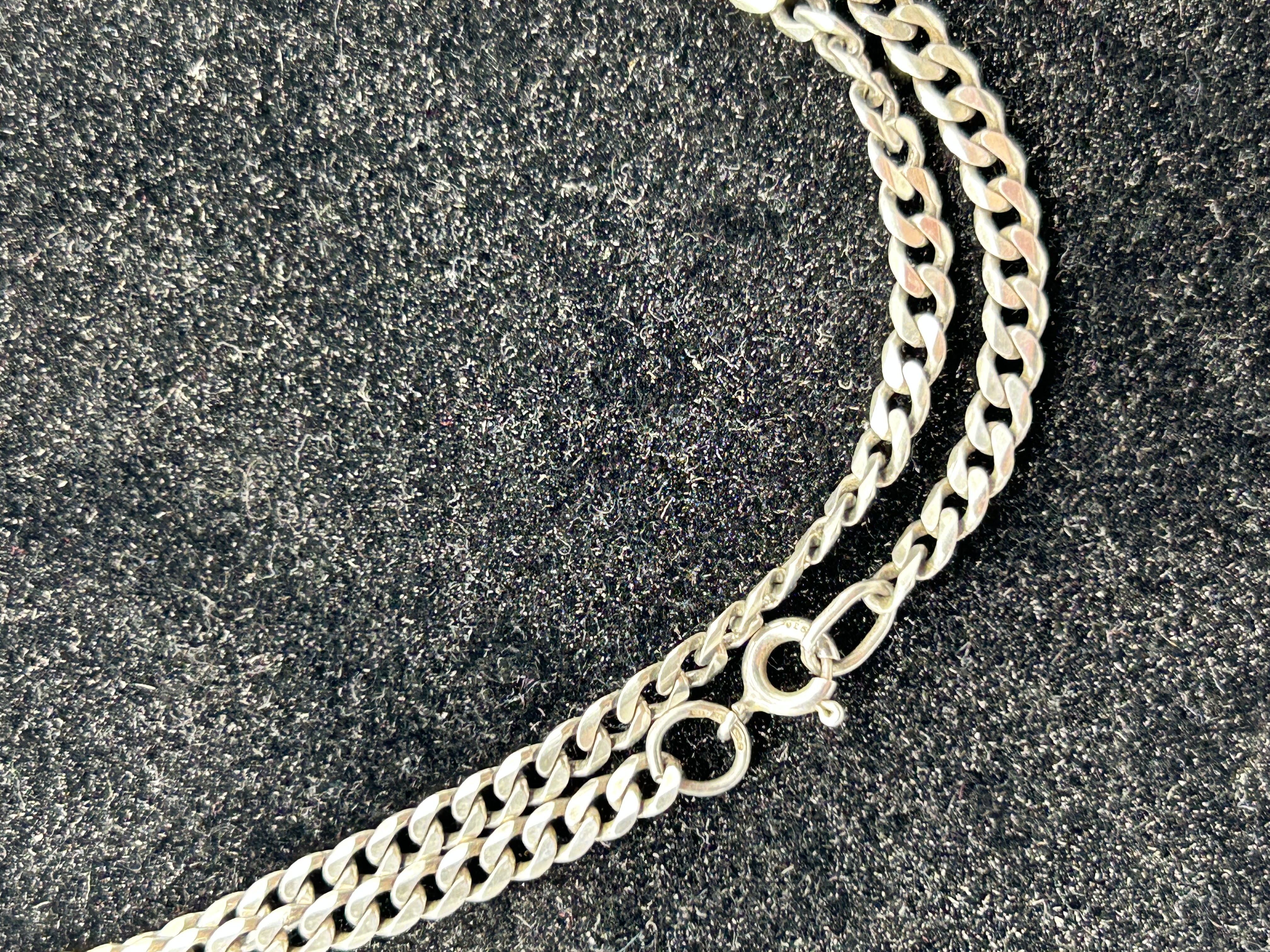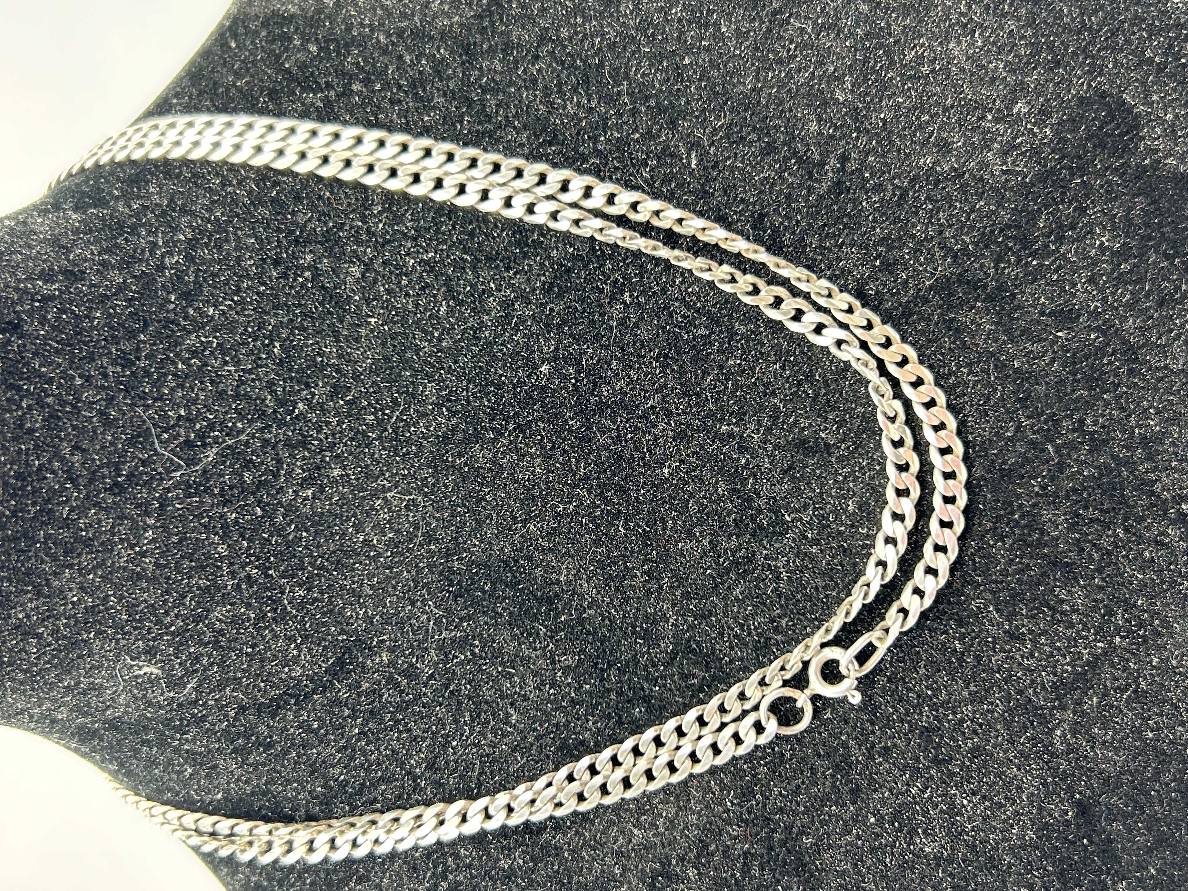 A sterling silver chain featuring a curb link design, also known as a Cuban link. The jewellery item is constructed from silver and is secured with a spring ring clasp. The clasp and the terminal jump ring are both impressed with 925 marks, indicating the silver purity.
