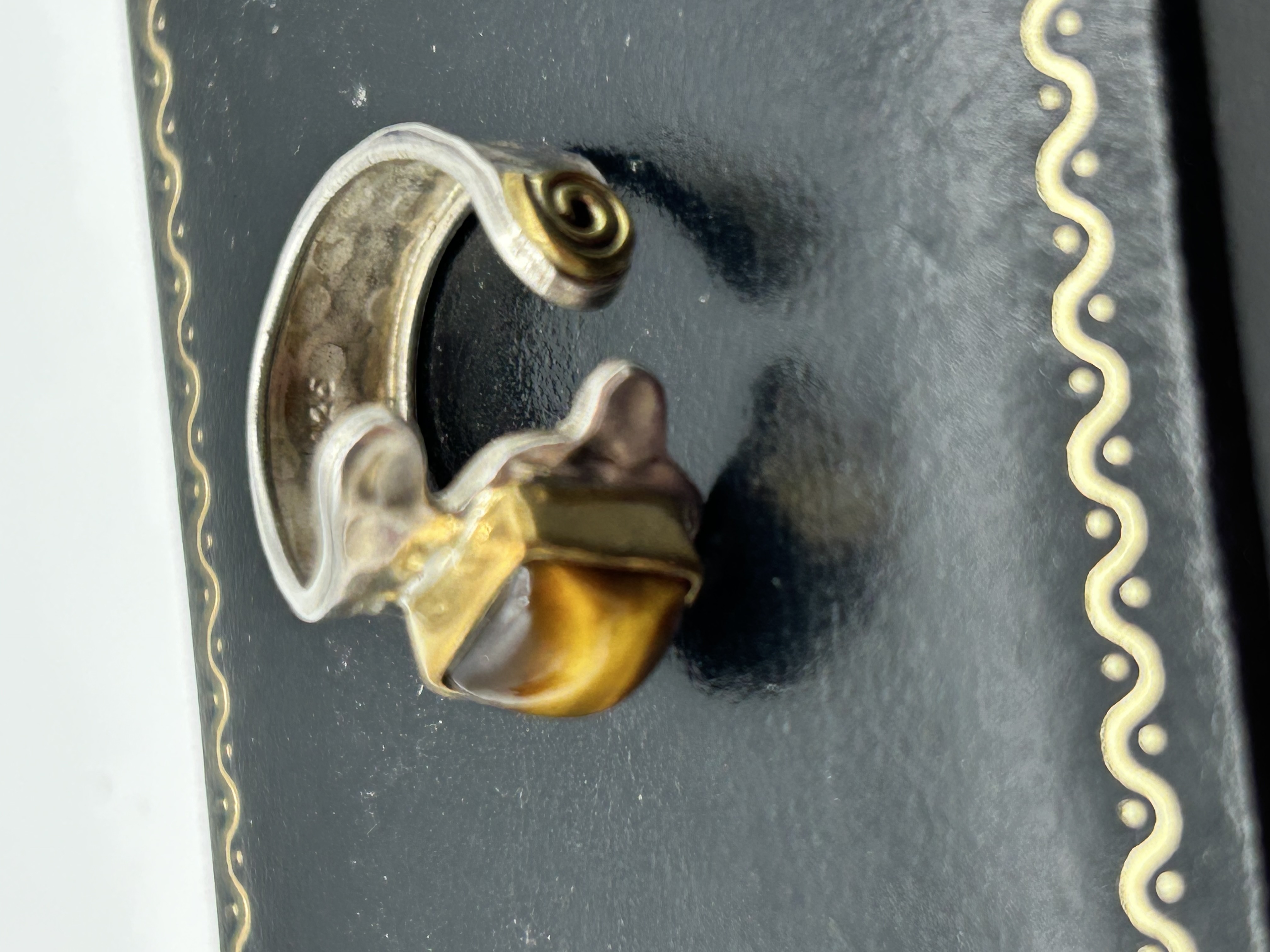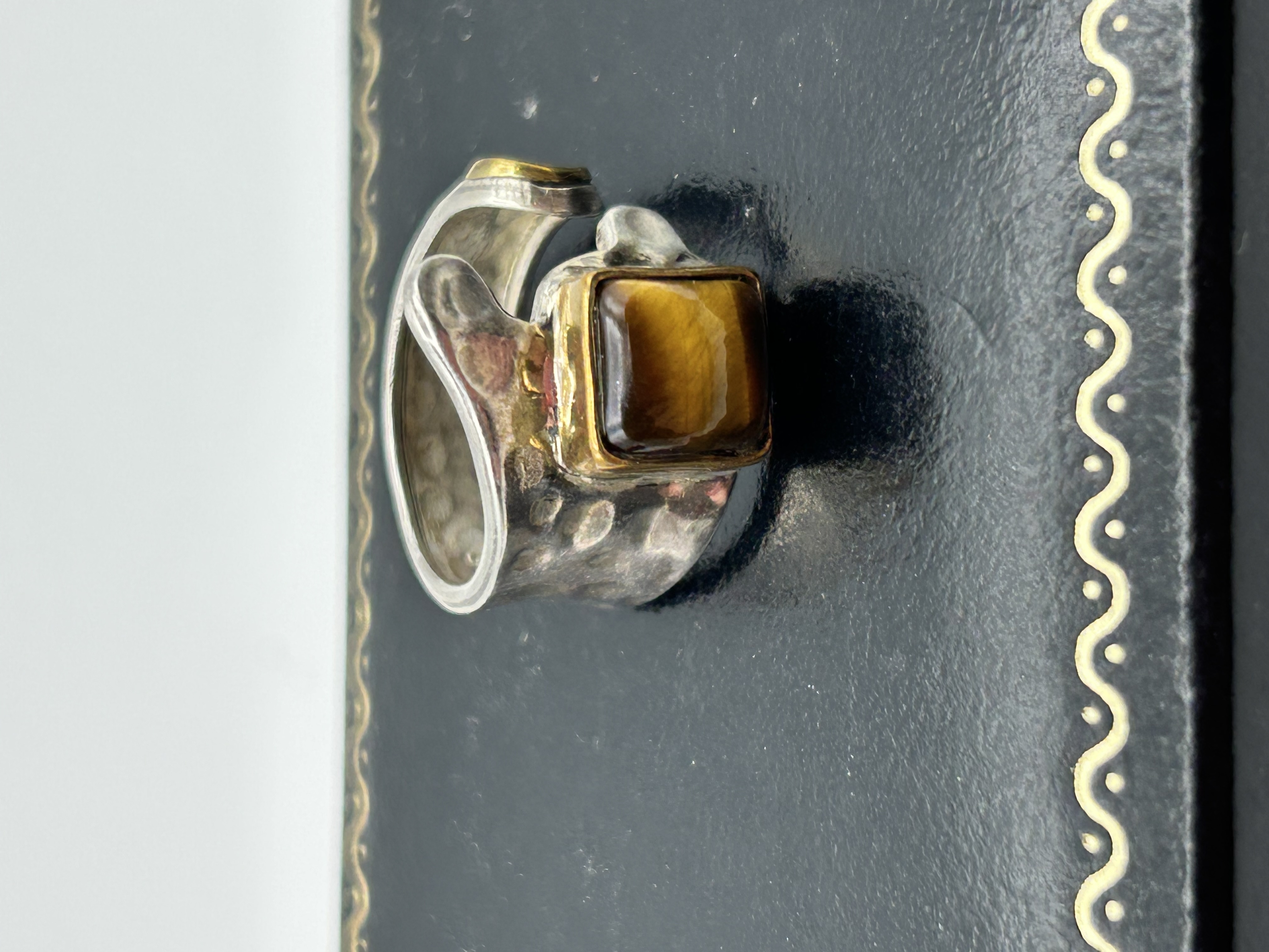 An artisan cocktail ring of bypass design, constructed from silver. The ring features a wide, wrap-around shank with a hand-hammered texture to the exterior. One terminal of the bypass is set with a single square-cut cabochon tiger’s eye stone, which exhibits characteristic chatoyancy. The stone is held in a raised, yellow-toned bezel setting. The opposite terminal features a yellow-toned spiral motif. The interior of the shank is stamped with the numerals 925, denoting sterling silver.
