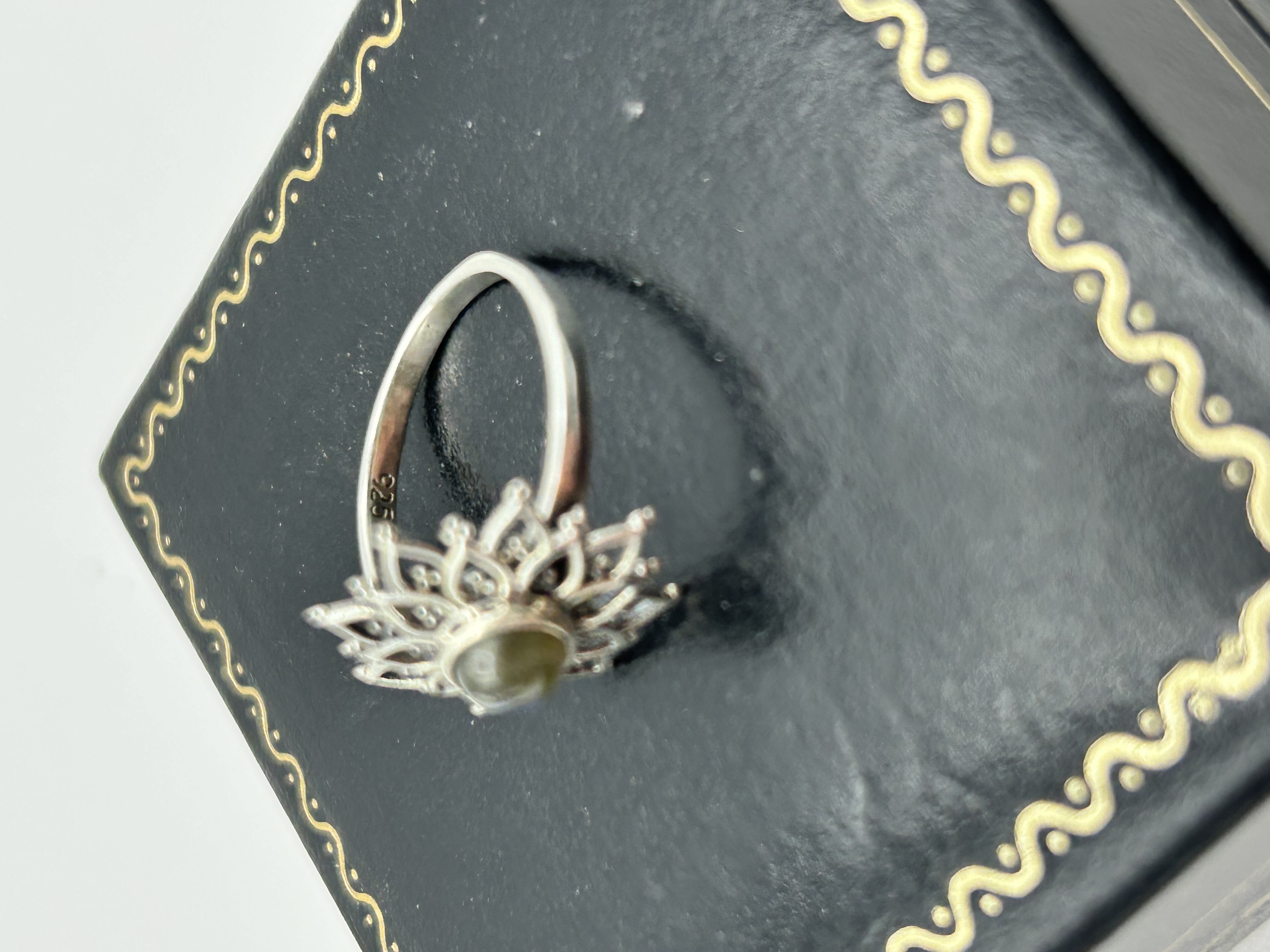 A silver cocktail ring featuring a central round cabochon-cut stone, possibly labradorite, displaying a translucent greenish-grey colour and internal sheen. The stone is secured in a bezel setting at the centre of an ornate, tiered circular head. The decorative head is composed of multiple layers of openwork petals in a stylised lotus design, finished with granulated accents and a scalloped border, resembling traditional Indian jewellery styles. The interior of the ring band is incised with the numerals 925, indicating the metal is sterling silver.