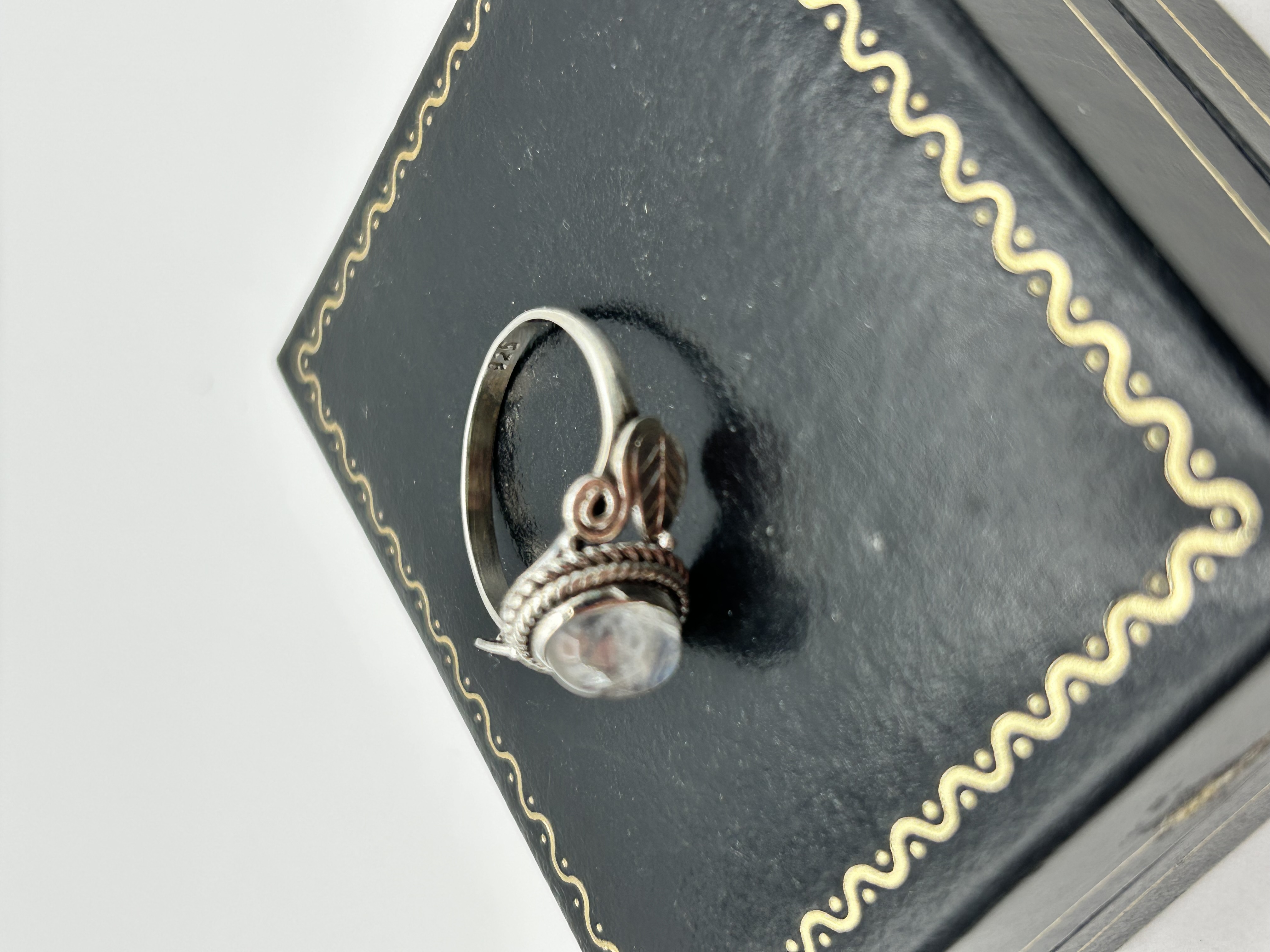 A silver dress ring featuring a central oval cabochon-cut rainbow moonstone. The stone is housed in a bezel setting with a decorative twisted rope wire border. The shoulders are embellished with applied leaf motifs and openwork wire scrolls. The interior of the band is stamped 925, indicating the metal is sterling silver. The moonstone displays characteristic adularescence and a milky translucency.